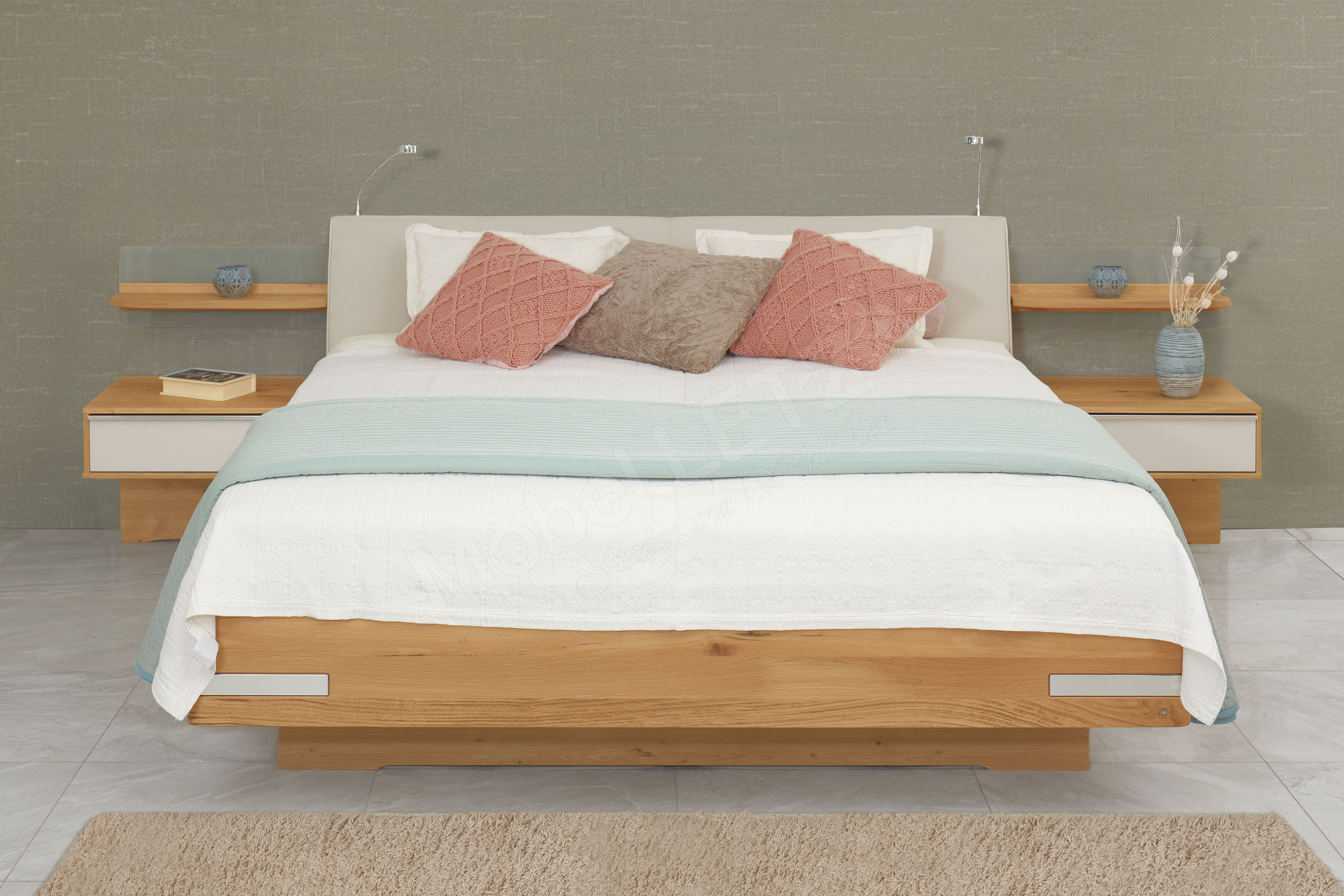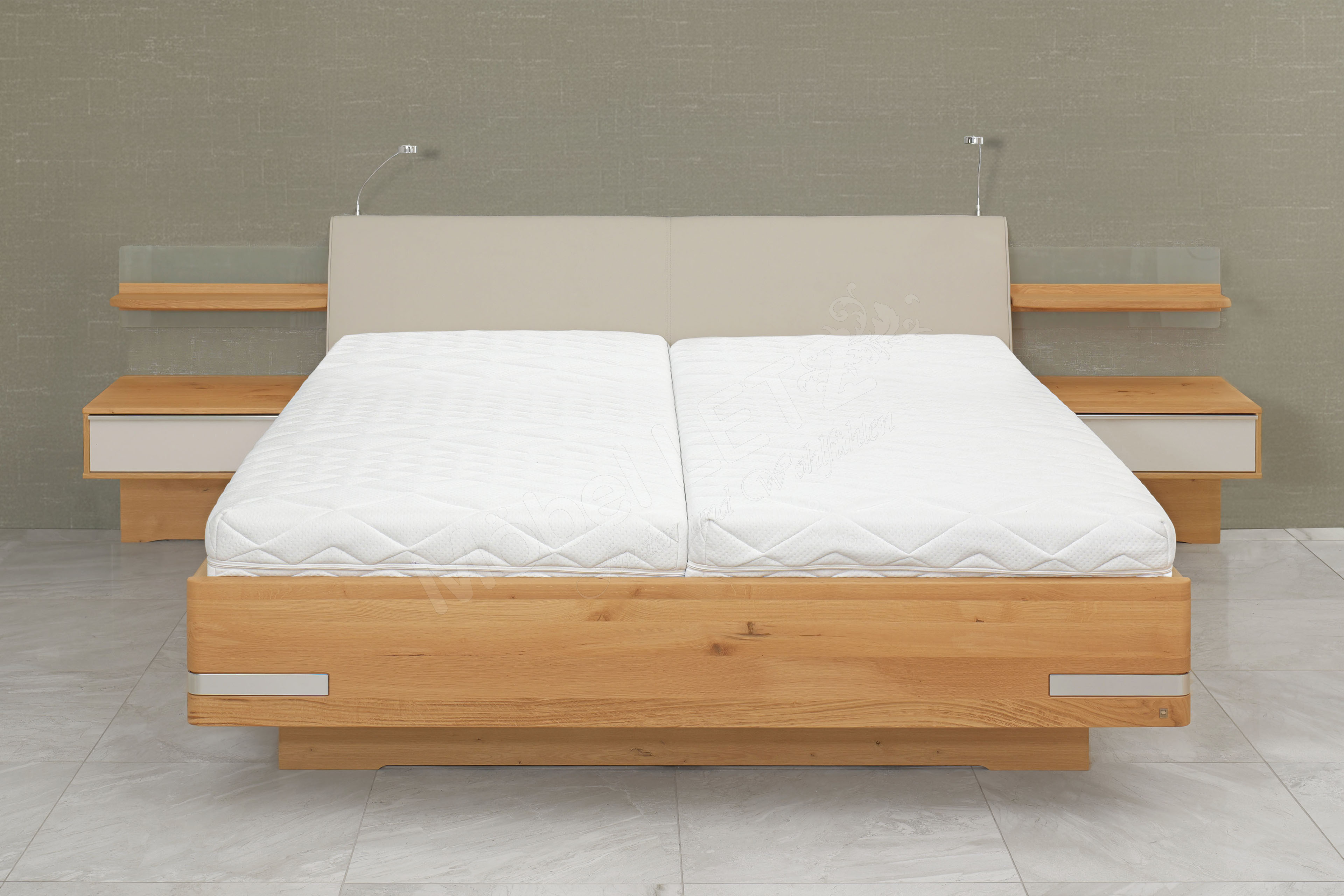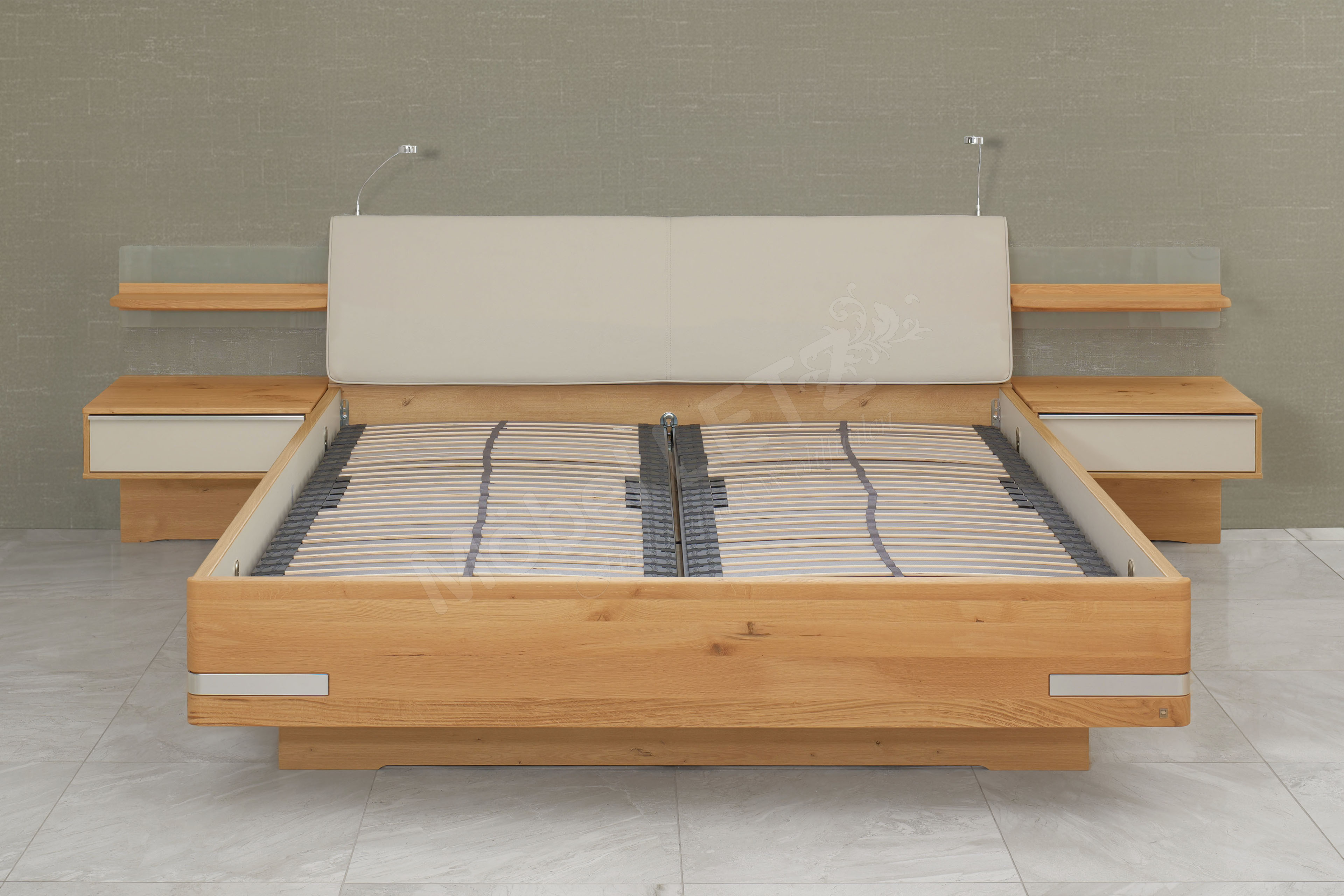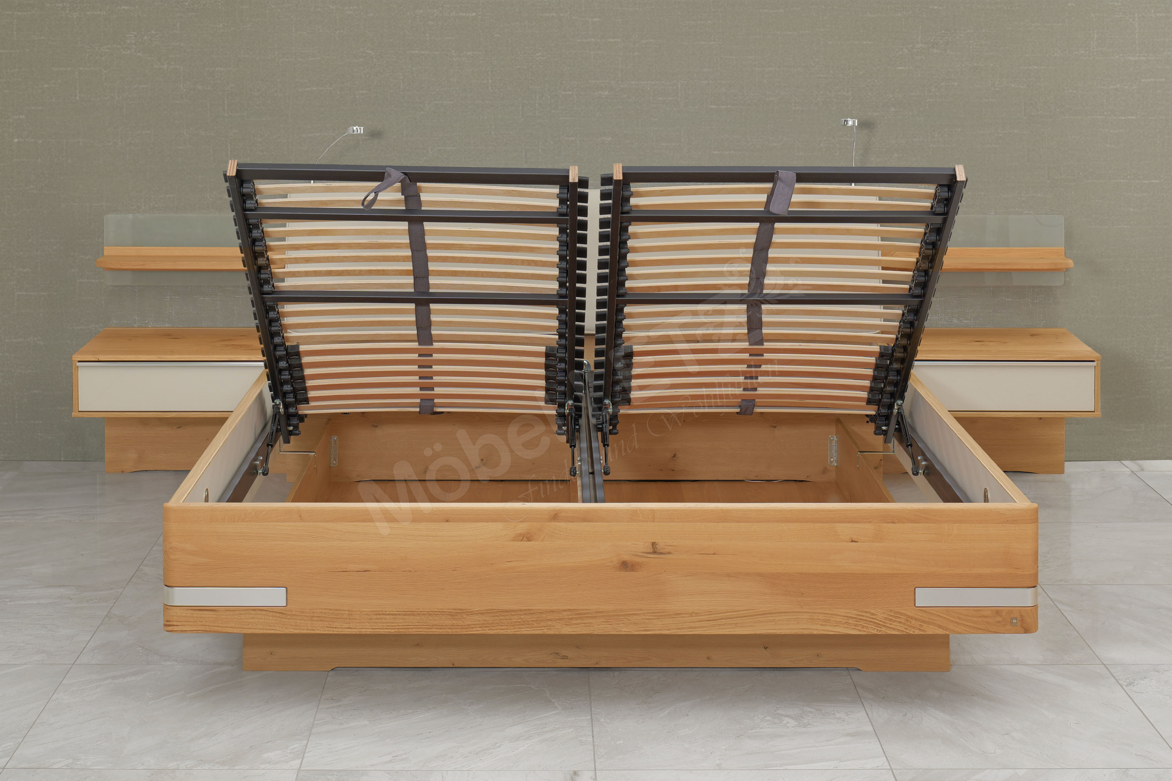 - Doppelbett mit Leseleuchten, Unterbaubettkasten und Federholzrahmen mit Springauf-Beschlag