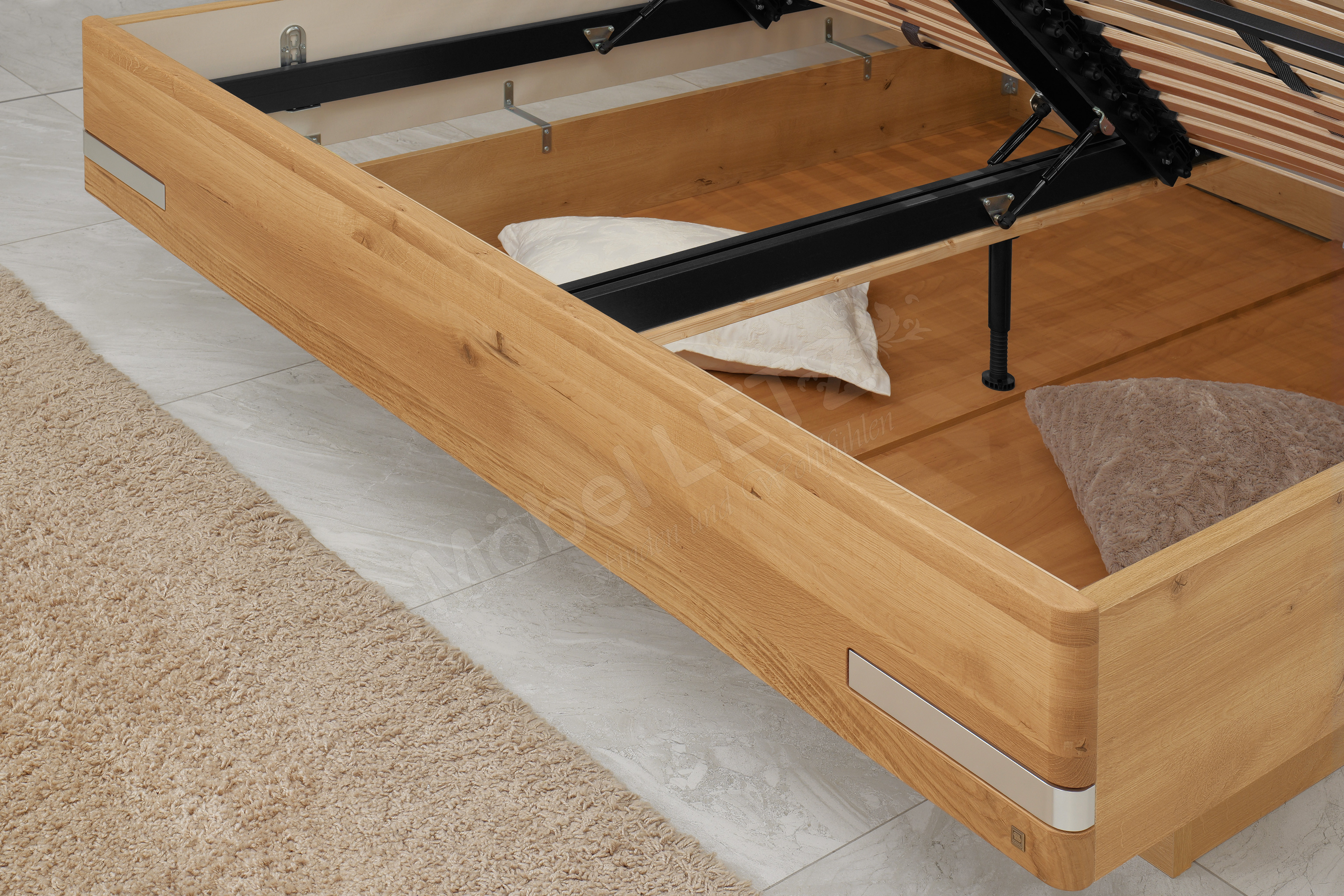 - Bett: rundum geschlossen, mit Unterbaubettkasten für Federholzrahmen mit Springauf-Beschlag