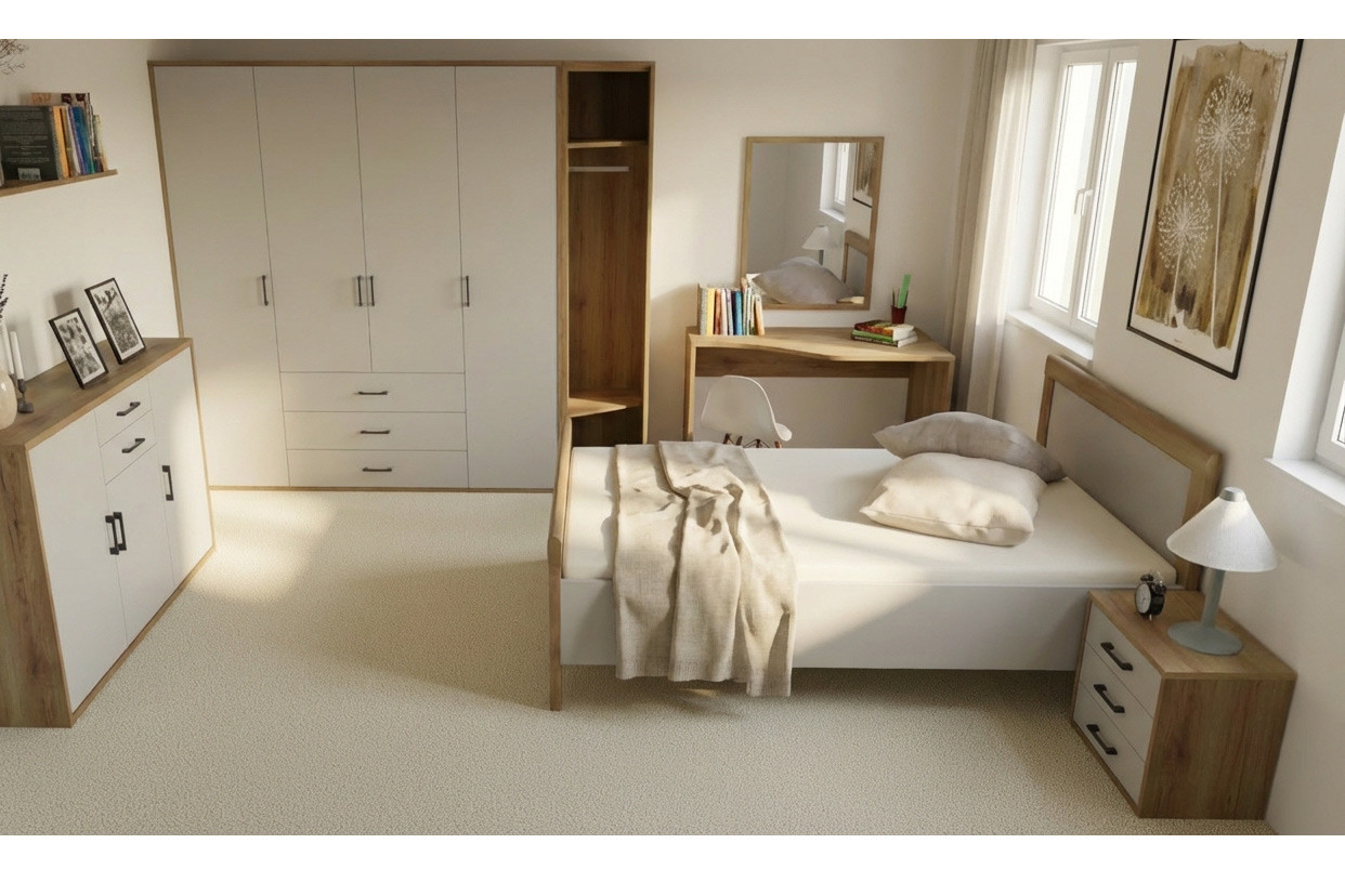 Genießen Sie mit Achat Komfort von Priess hochwertige Schlafzimmermöbel, die Ihnen exquisiten Komfort bieten und Schlafzimmer entstehen lassen, die zum Erholen einladen. Das Bett schenkt Ihnen mit den hohen Bettseiten eine wohltuende Liegehöhe und gestaltet sowohl das Einsteigen als auch das Aufstehen besonders angenehm. Das hohe Kopfteil ist ideal, wenn Sie sich abends vor dem Schlafen noch anlehnen und einige Seiten lesen oder in ein Tagebuch schreiben möchten. Für die entsprechende Ordnung im Schlafzimmer sorgt der 4-türige Kleiderschrank. Mit circa 190 cm in der Breite bringt er jede Menge Stauraum mit. Die drei mittigen Schubladen eignen sich perfekt, um kleinteilige Wäsche und Accessoires unterzubringen und übersichtlich zu sortieren. Hinter den gedämpften Drehtüren befinden sich höhenverstellbare Einlegeböden und insgesamt drei Kleiderstangen. Auch die Nachtkommode verfügt über drei Schubladen und bietet Ihnen somit praktischen Stauraum direkt neben dem Bett. Die integrierte Softstop-Funktion sorgt für ein ruhiges und sanftgängiges Schließen. Nutzen Sie unsere Zusatzoptionen, um die abgebildeten Möbel mitzubestellen und die Farbausführung an Ihren persönlichen Geschmack anzupassen. So entsteht mit den Möbeln von Priess ein Schlafzimmerset, das genau Ihren Wünschen und Bedürfnissen entspricht und Sie mit modernem Design und Qualität made in Germany verwöhnt.