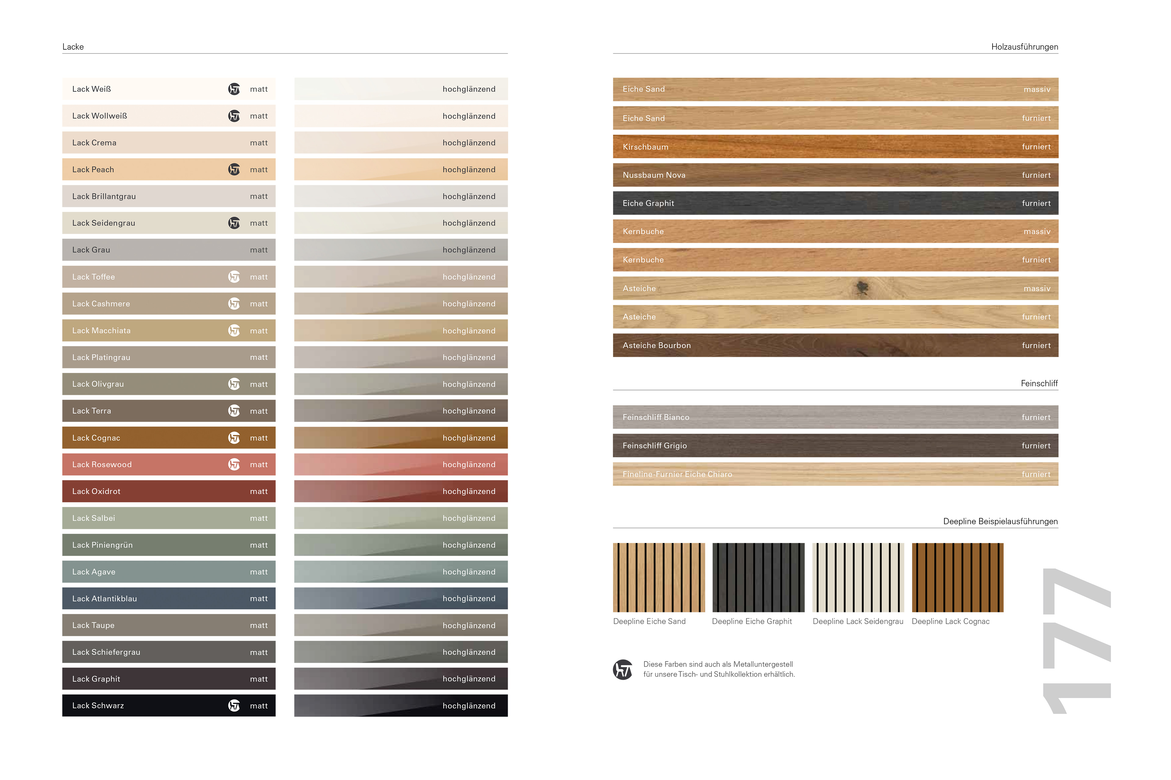 Die Außen- und Innenausführung ist generell in der gleichen Lackausführung (innen Lack matt), ist der Korpus in Furnier ist die Innenausführung generell Lack weiß, die Kanten der Aussen- und Mittelseiten in Furnier.