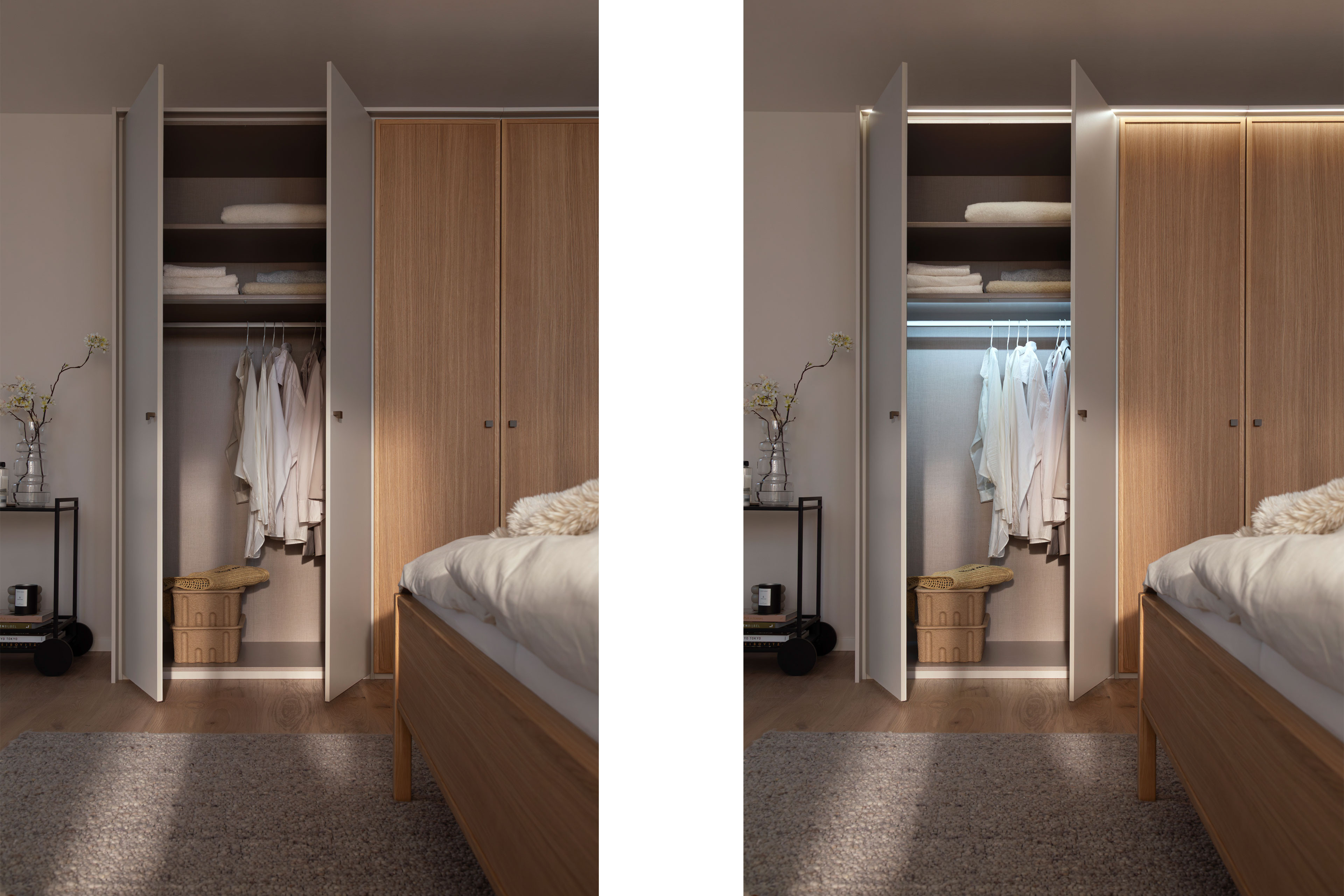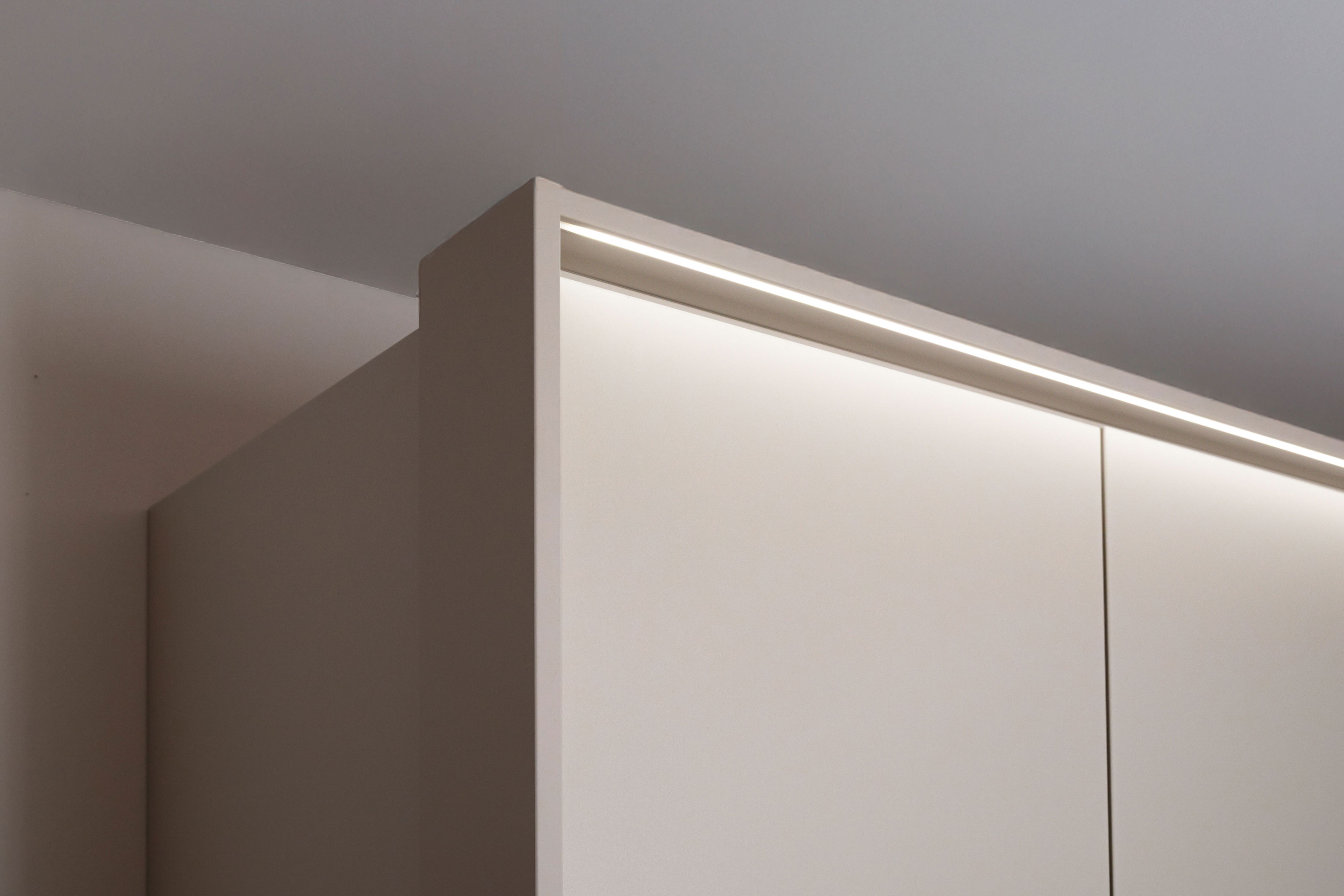 3 x LED-Innenbeleuchtung (EEK E), je 8 Watt, Zuleitung ca. 4,5 m, inklusive Trafo und Bewegungssensor - Schrank: inklusive Passepartout mit LED-Beleuchtung (EEK E), 7 Watt, Zuleitung ca. 6,5 m, mit Trafo und Funkfernbedienung