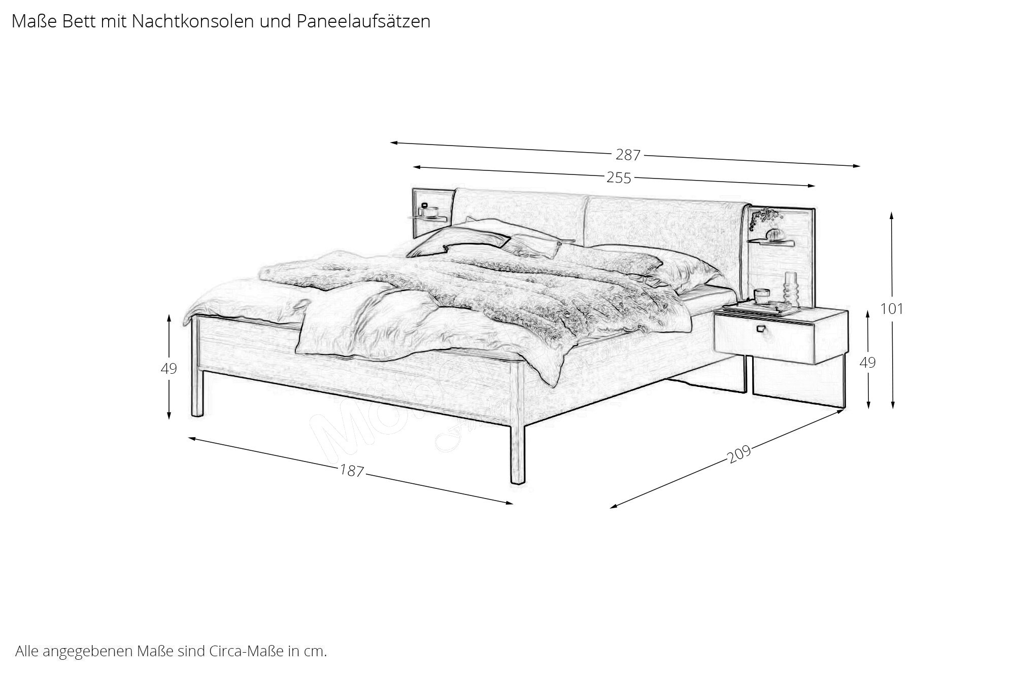 - Bett: Seitenhöhe ca. 49 cm, Kopfteilhöhe ca. 101 cm