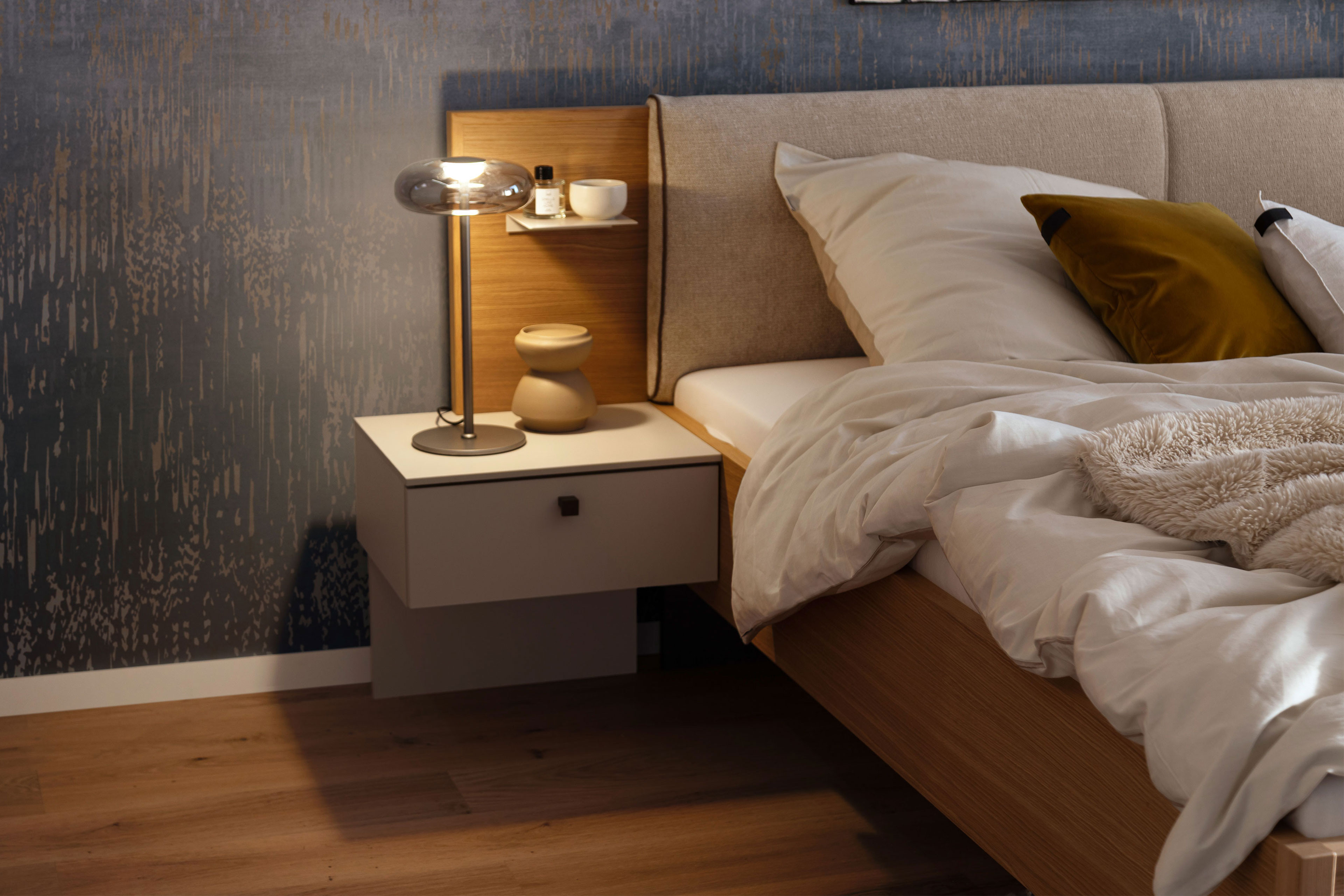 - Nachtkonsolen: je 1 Schubkasten mit Softclose-Funktion (Selbsteinzug mit Dämpfung)