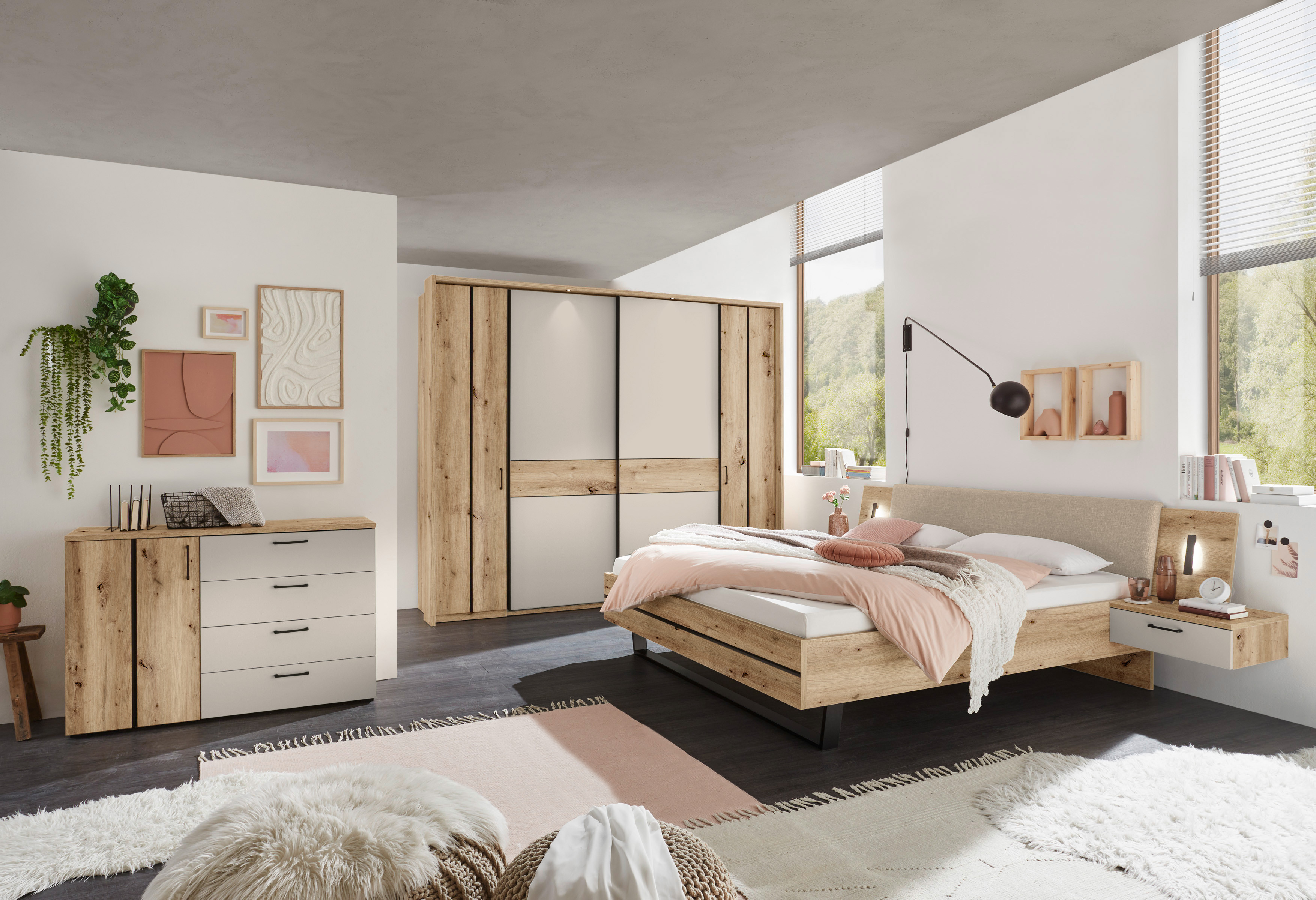 Eine natürlich wirkende Eichenholz-Nachbildung und wohnlich warmes Kaschmir vereinen sich zu einer Schlafzimmer-Einrichtung mit modernem Gemütlichkeitsfaktor. Der fast 270 cm breite Kleiderschrank und die komfortable Bettanlage stammen aus dem Schlafzimmer-Programm Genomi von SchlafKONTOR und schmücken sich mit den bereits genannten Oberflächen. Organisatorisch gesehen bleiben bei diesem Kleiderschrank, der mit zwei Drehtüren außen und zwei Schwebetüren mittig ausgestattet ist, nahezu keine Wünsche offen. Standardmäßig verfügt er über zwei Wäsche- sowie zwei Kleiderfächer und optional erhalten Sie zusätzliche Fachböden, praktische Innenschubladen und vorteilhafte Türdämpfer - hier bestimmen Sie, ob und wie Sie den Schrank ergänzen möchten. Das Doppelbett mit einer Gesamt-Liegeflächengröße von 180 x 200 cm ist passend zum Schrank gestaltet und hat zudem ein beige-farbenes Polsterkopfteil für erhöhten Anlehn-Komfort. Die beiden Nachtkonsolen mit den Paneelen und der Beleuchtung sind bereits im Angebot enthalten. Als praktische Stauraumergänzung zum Schlafzimmer-Set Genomi von SchlafKONTOR erhalten Sie optional die modellzugehörige Kombikommode. Falls Sie für Ihre neue Schlafzimmer-Einrichtung auch das geeignete Bettzubehör mitbestellen möchten, finden Sie in unserem Online-Shop eine reichhaltige Auswahl an unterschiedlichen Lattenrosten und Matratzen.