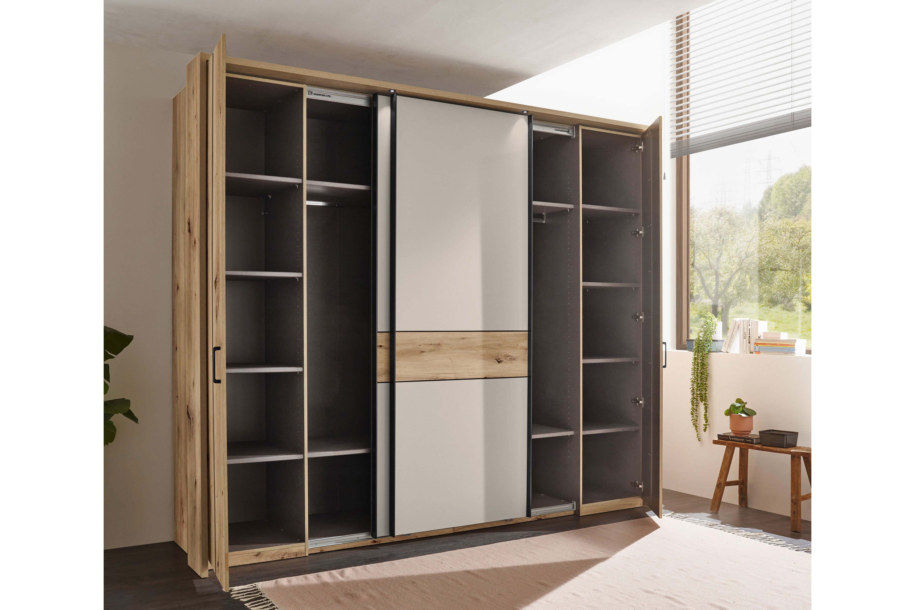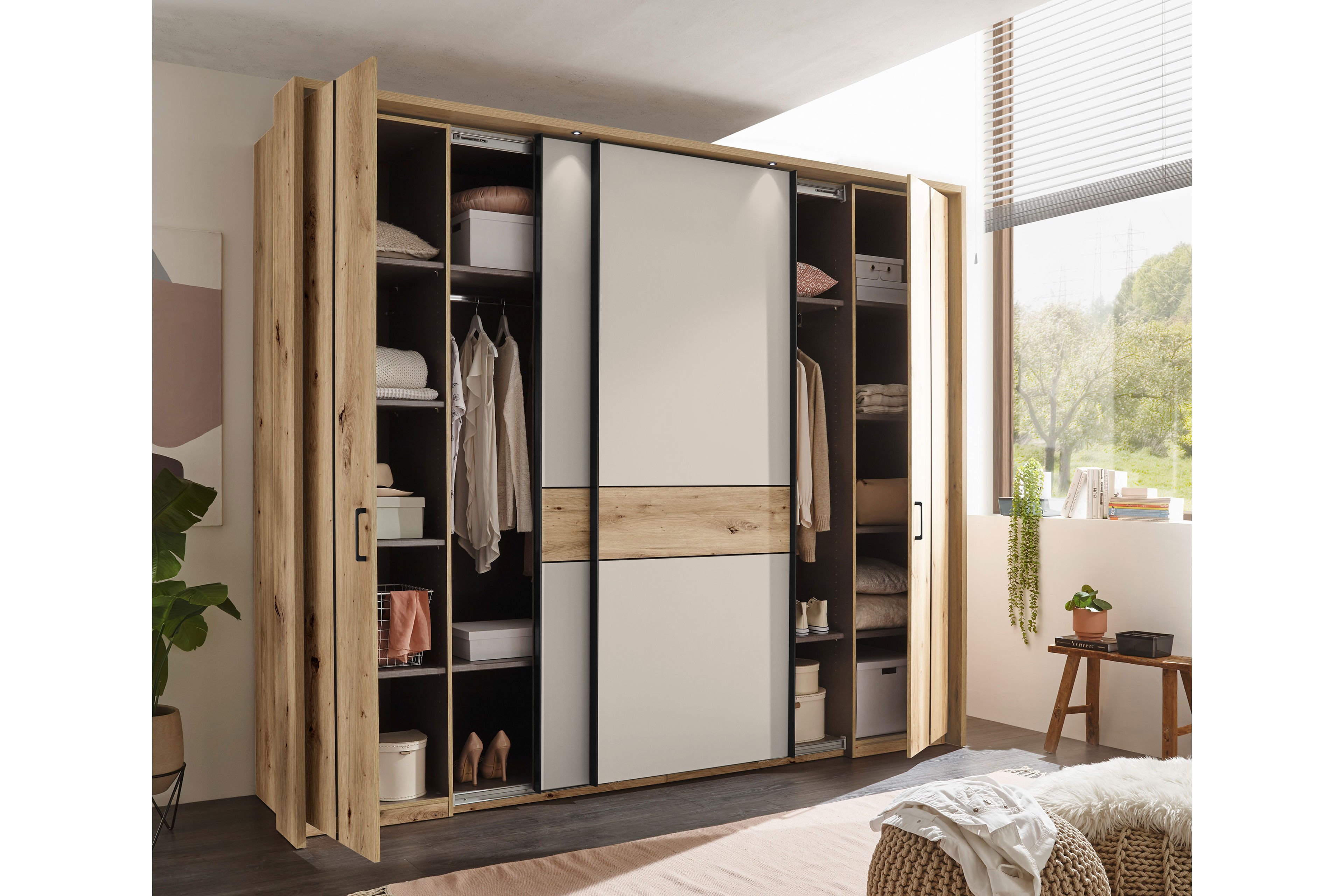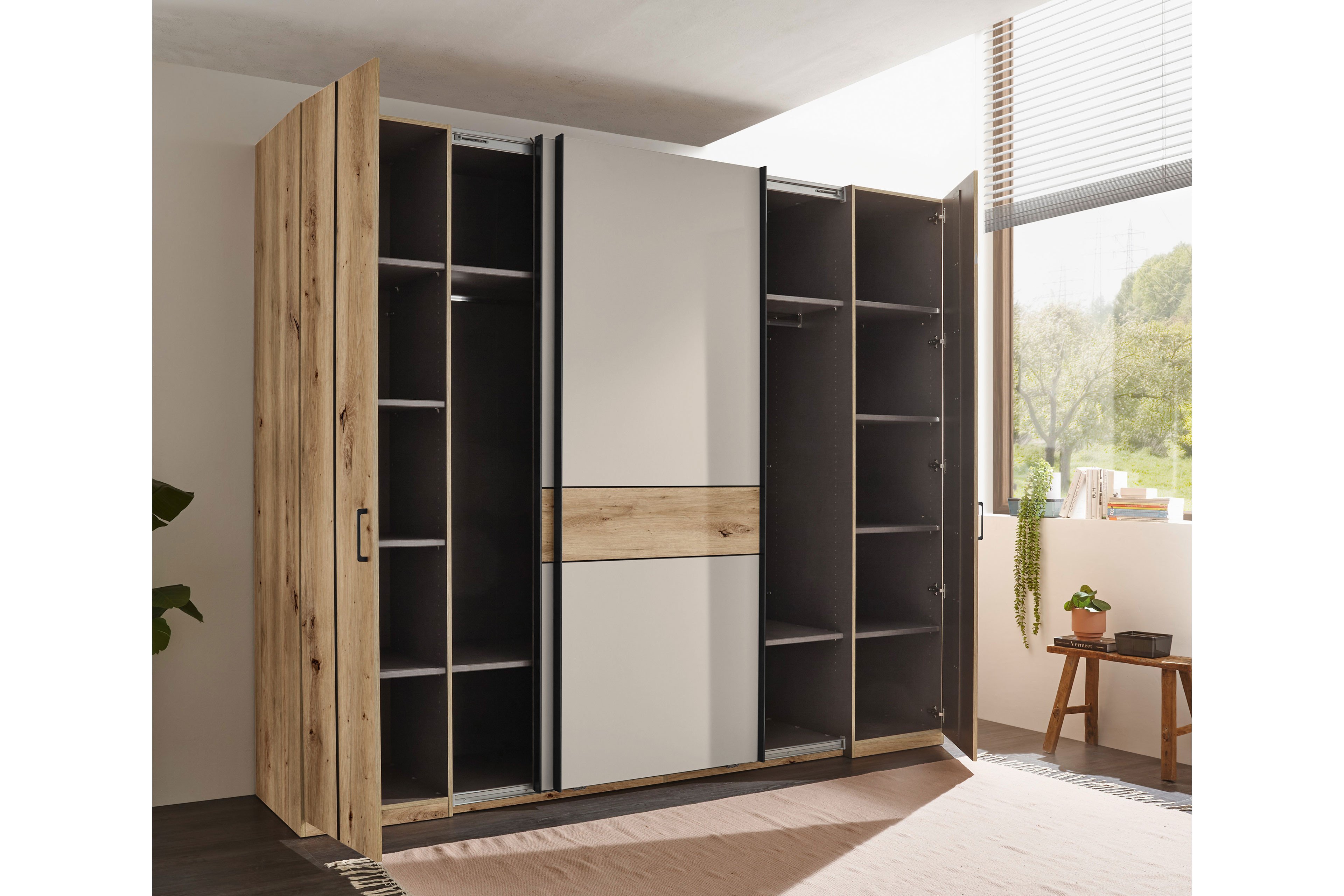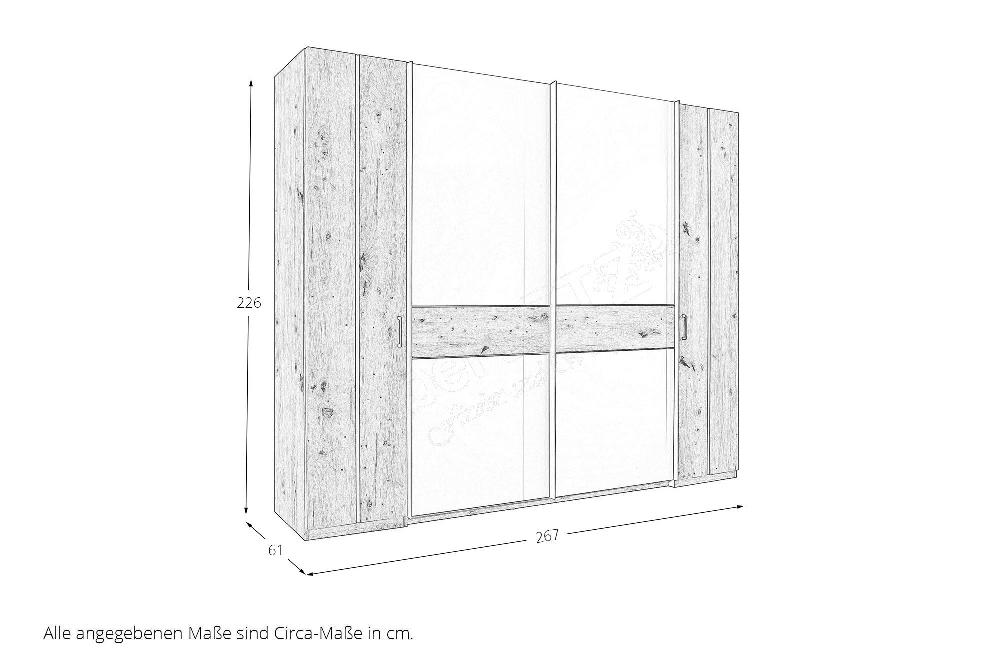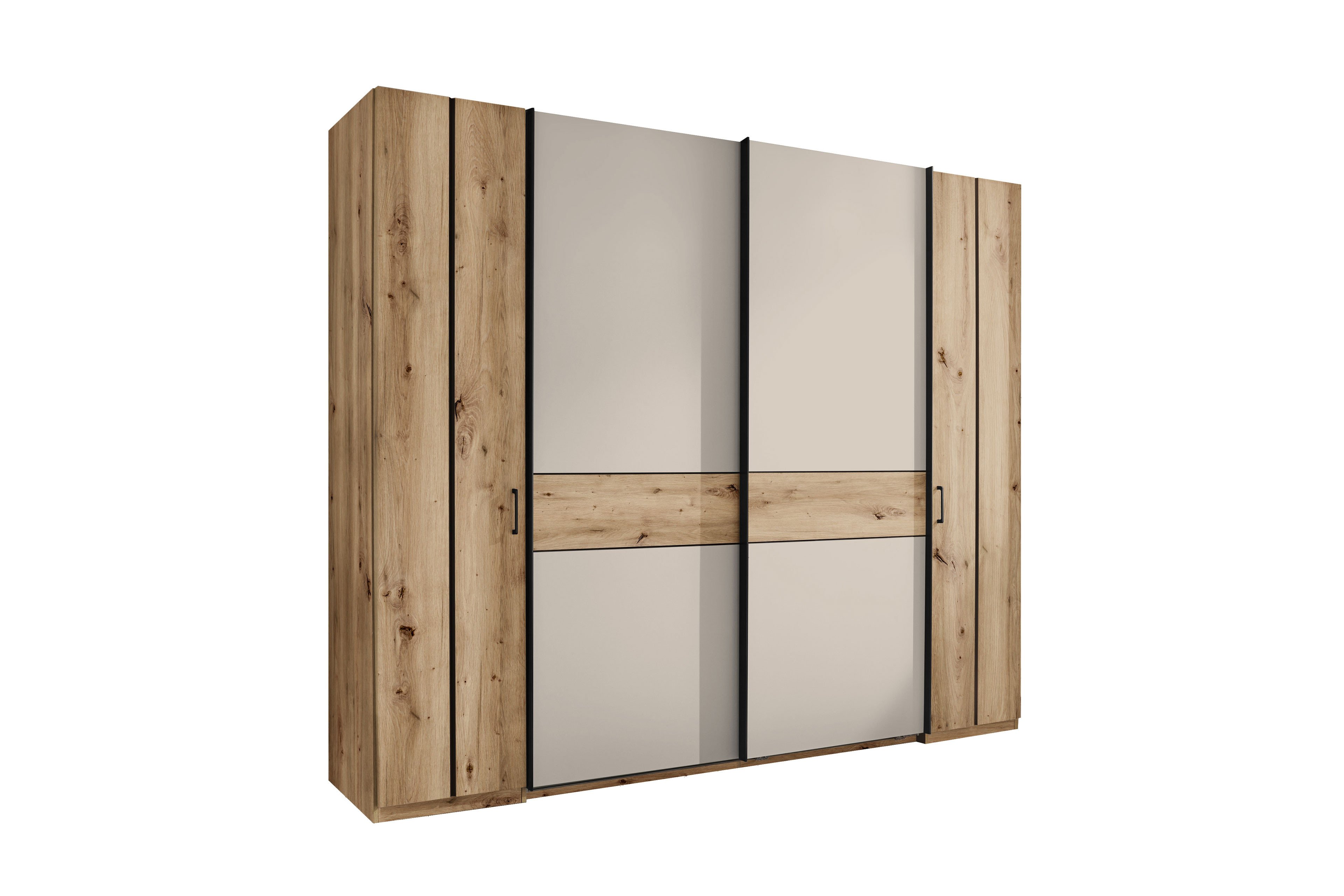 - Kleiderschrank mit 2 Drehtüren außen und 2 Schwebetüren mittig