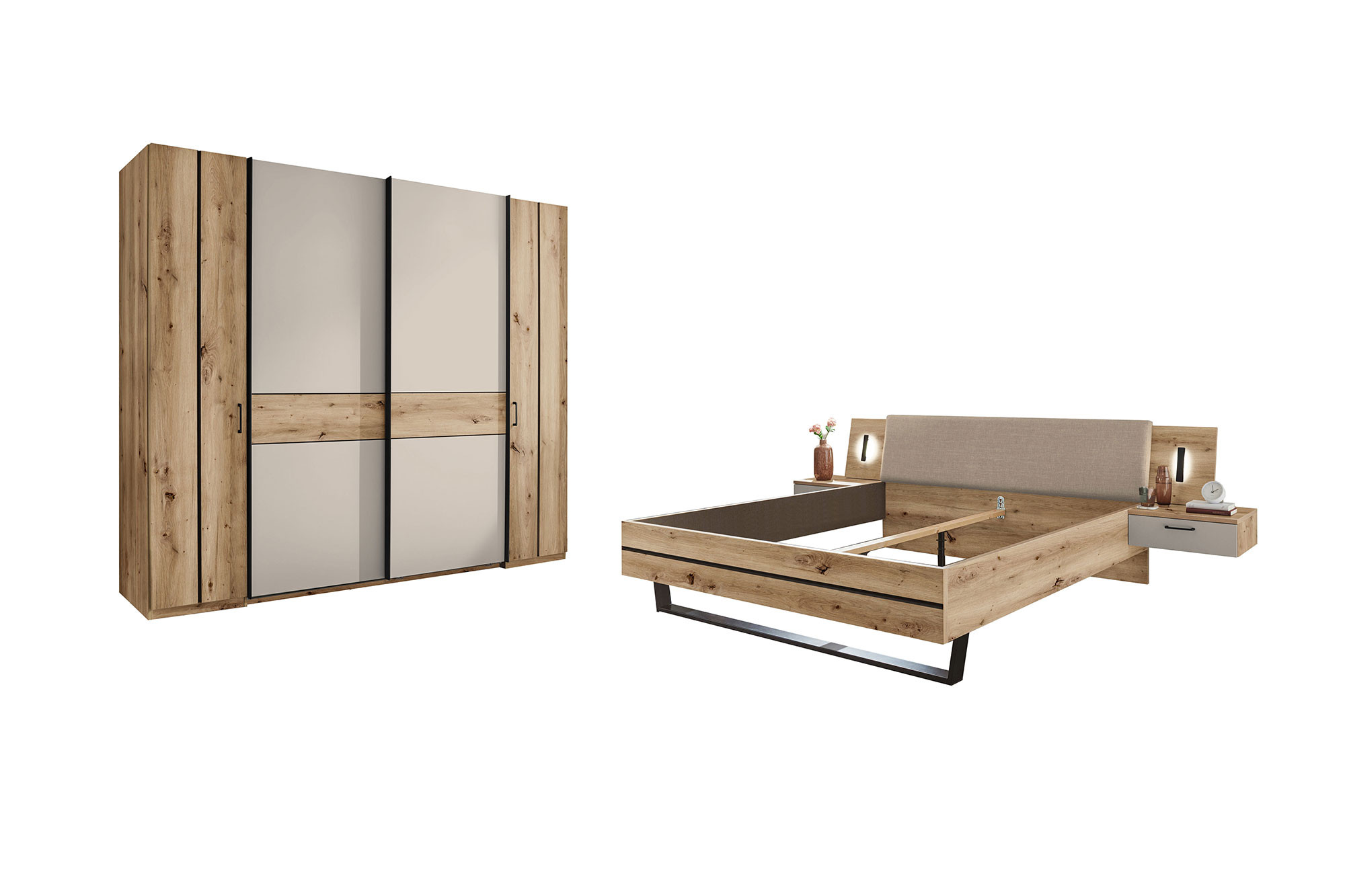 2-teiliges Schlafzimmer-Set von SchlafKONTOR - Modell Genomi - bestehend aus Kleiderschrank und Bettanlage mit Beleuchtung Sanfte Töne. Starkes Design.