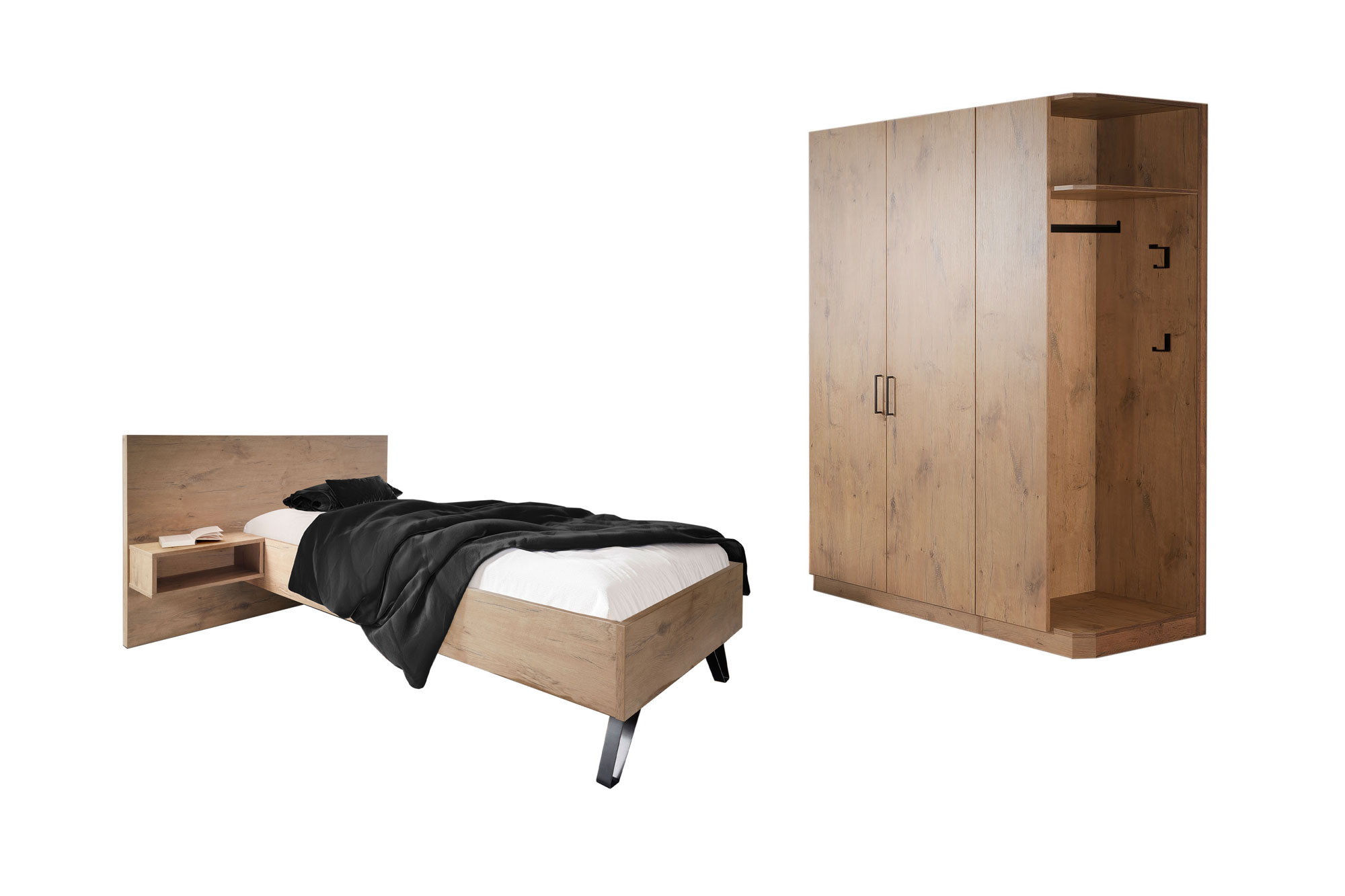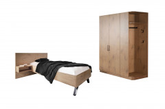 Verleihen Sie Ihrem Schlafraum mit den hochwertigen Objektmöbeln aus dem Programm Meran von Schösswender einen Hauch Natürlichkeit und Funktionalität. Das vorausgewählte Schlafzimmer-Set beinhaltet einen etwa 160 cm breiten Kleiderschrank inklusive einem offenen Garderobenteil sowie ein Einzelbett mit einer Liegefläche von 90 x 200 cm und einem kleinen Hängeregal als Ablageoption, beispielsweise für Zeitschrift, Brille und Co. Der Drehtürenschrank bietet im Inneren als Standard-Ausstattung zwei Fachböden und eine Kleiderstange für Ihre zusammengelegte und auf Bügeln hängende Garderobe, während das offene Anstell-Element mehrere Haken und eine weitere Kleiderstange für Jacken, Mode-Accessoire und die Handtasche bereitstellt. Über die Zusatzoptionen kann das etwa 100 cm breite Schrank-Abteil auch mit einer praktischen Hotel-Einteilung ausstaffiert werden. Das Bett beeindruckt mit seinem modernen, asymmetrischen Design und ist in drei weiteren Liegeflächengrößen verfügbar. Mit dem optional erhältlichen Schreibtisch, dem zusätzlichen Garderobenpaneel, dem kleinen Schuhregal und dem Spiegel können Sie auch Ihren Arbeits- sowie den Eingangsbereich stilgleich einrichten. Entdecken Sie jetzt die vielseitigen Möglichkeiten der Schösswender Objektmöbel-Serie Meran, deren Typenplan unter Downloads für Sie zur Ansicht bereitsteht, und bestellen Sie noch heute Ihre Wunsch-Elemente direkt online oder telefonisch bei einem unserer Einrichtungsexperten.