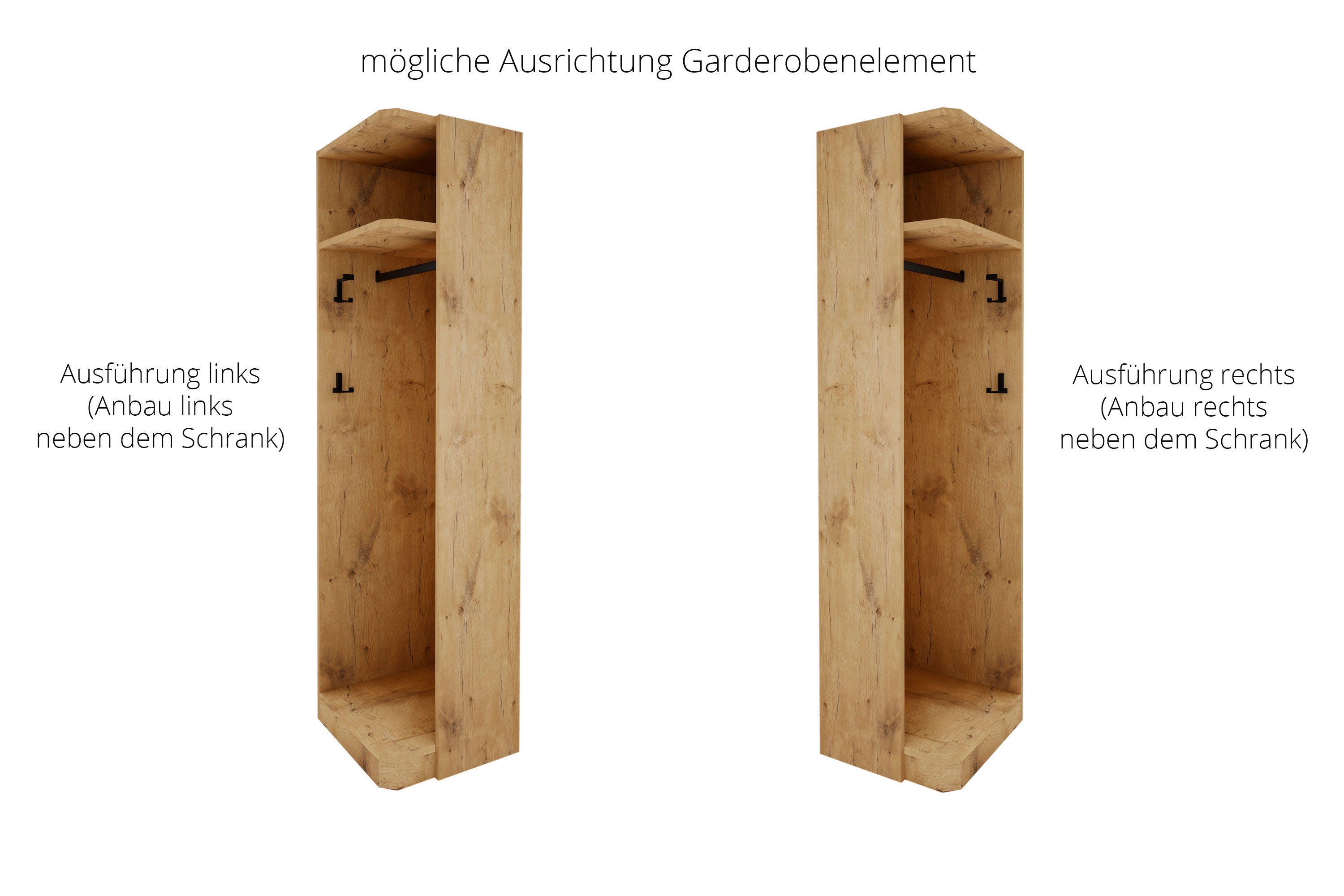 - Garderobe: offenes Anstell-Element, mit 1 Huthaken, 1 Mantelhaken, 1 Ablage-Boden und 1 schwarzen Kleiderstange