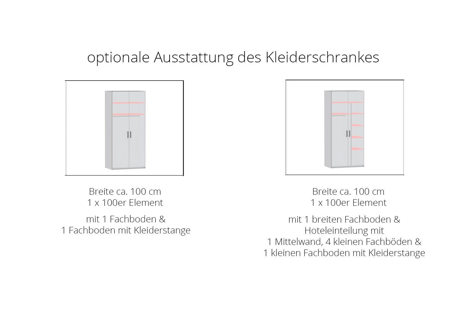 - Kleiderschrank: 1 Element ca. 70 cm breit mit 1 Fachboden und 1 Fachboden mit Verbinder mit Kleiderstange, Böden höhenverstellbar
