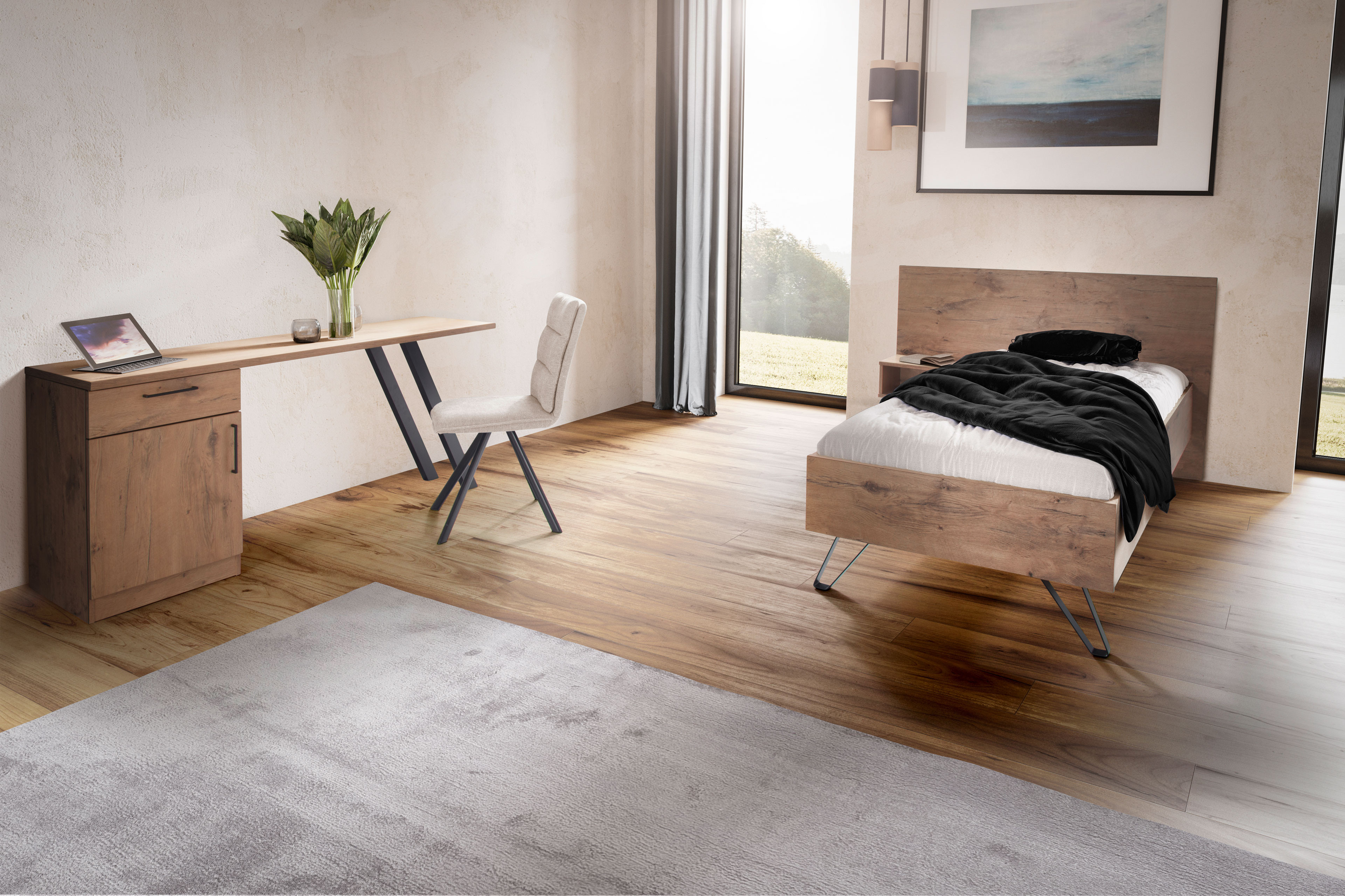 Zweckmäßige, kompakte und natürliche, ressourcenschonende Möbel-Einrichtungen stehen hoch im Kurs. Gerade auch, wenn es sich um eine Ausstattung für Objektbereiche, also beispielsweise für Hotels oder Seniorenresidenzen, handelt. Um den größtmöglichen Erholungs- und Ruhe-Effekt zu erzielen ist Harmonie im Zusammenspiel zwischen Design und Funktion erforderlich. Das Schösswender Programm Meran bietet eine Vielzahl an Möbel-Elementen für den Schlaf-, Arbeits- und Eingangsbereich, die genau für diese besonderen Anforderungen konzipiert wurden. Aus dem umfangreichen Sortiment stellen wir Ihnen in diesem Angebot ein 2-teiliges Set vor, das ein Bett mit Nischenregal und einen Schreibtisch inklusive Stauraum beinhaltet. Mithilfe der Zusatzoptionen können Sie die Möbel bei Bedarf verändern und so optimal an Ihre Wünsche anpassen. In unserem Online-Shop finden Sie zudem geeignete Lattenroste und Matratzen sowie Kleiderschränke und diverse Beimöbel, um das Angebot funktional zu ergänzen. Lassen Sie sich vom innovativen Stil der Schösswender Möbel Meran verzaubern und erleben Sie jeden Tag beruhigende VIBES OF RECREATION … ein Gefühl der Erholung in Ihrem Zuhause.