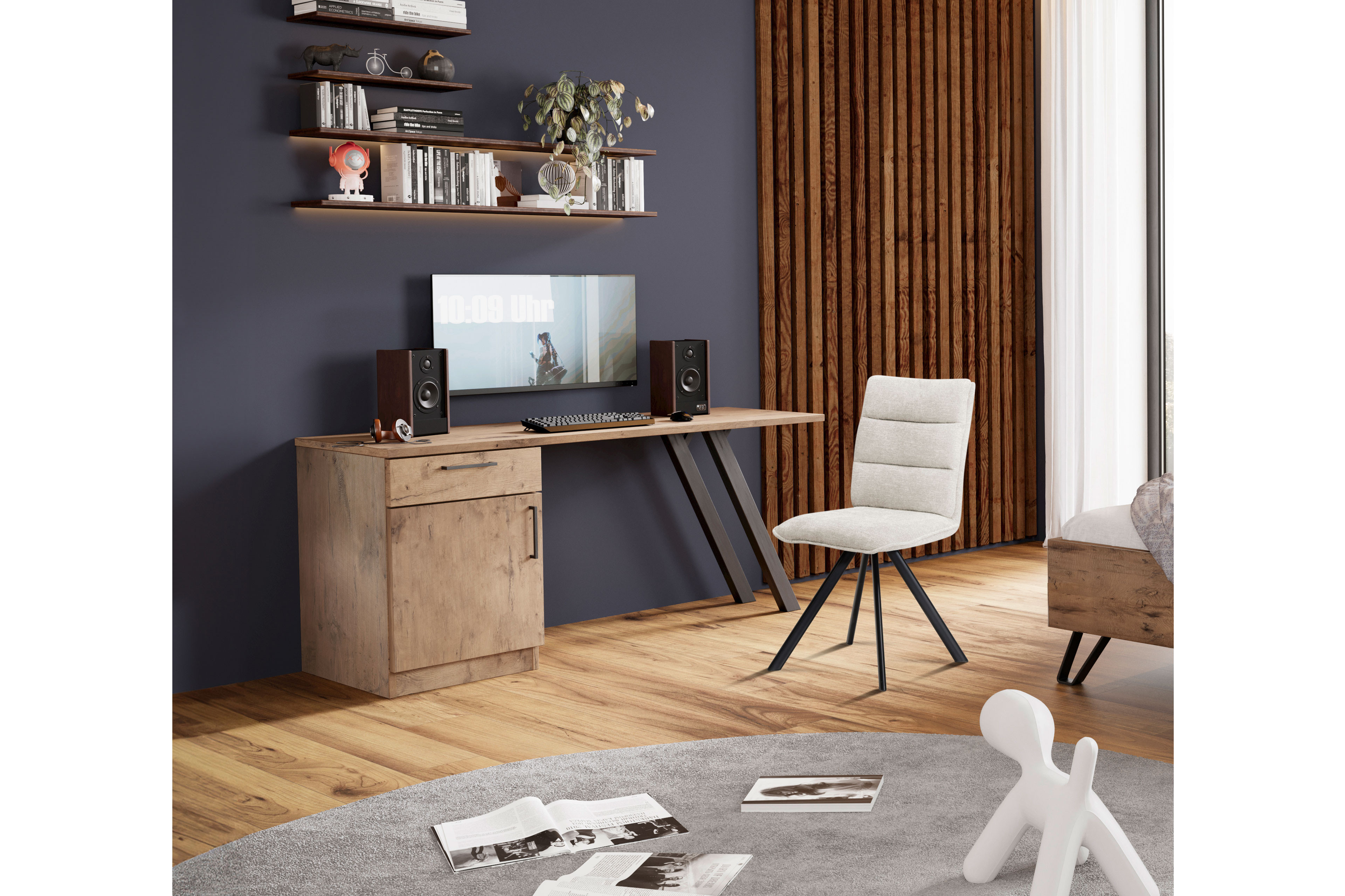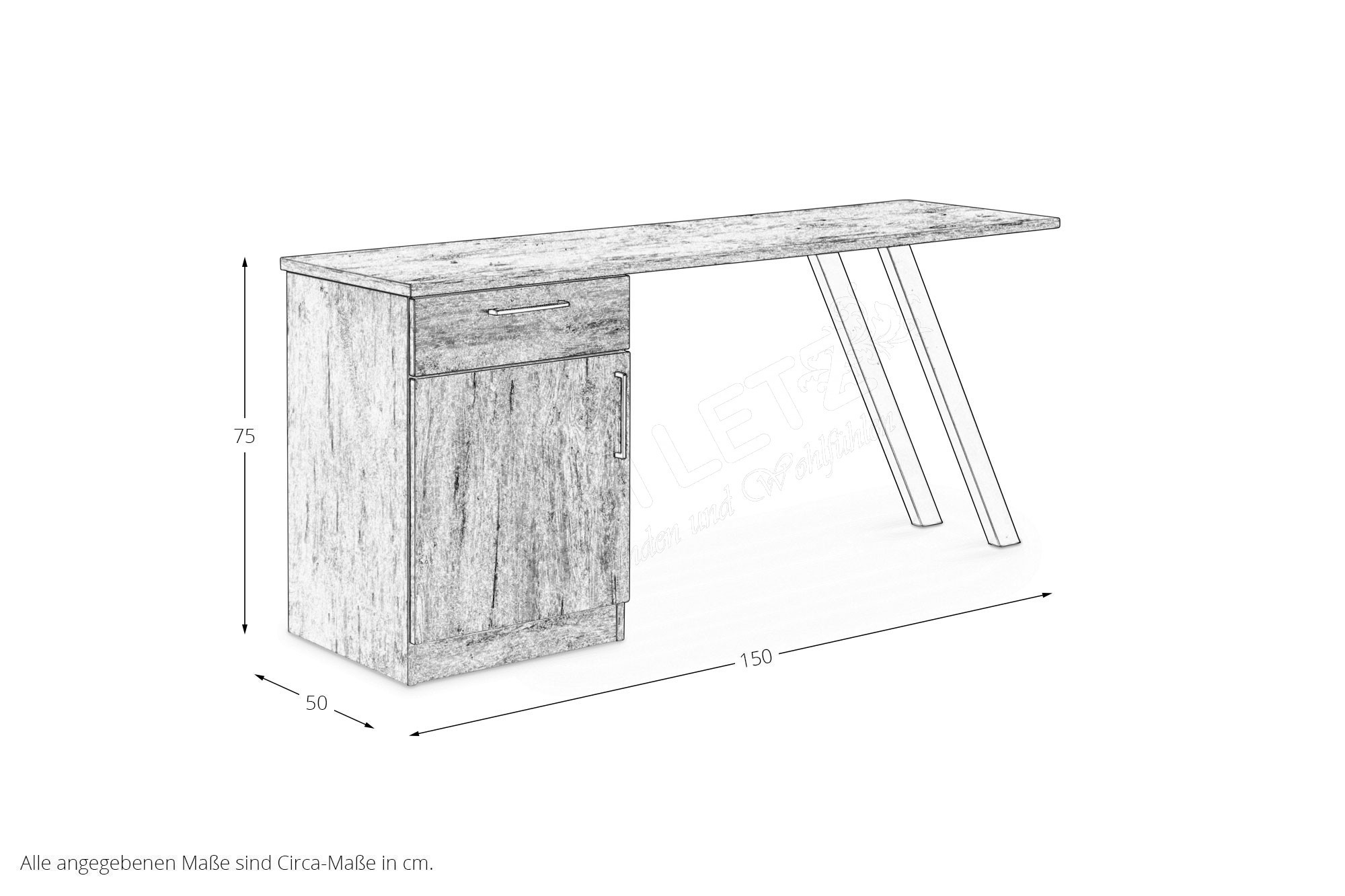 - Schreibtisch: mit 1 Schubkasten und 1 Türelement, hinter der Tür 1 Boden, Arbeitsfläche ca. 150 x 50 cm