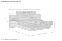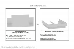 - Bett: Bettseitenhöhe ca. 46 cm, Kopfteilhöhe ca. 95 cm (links und rechts neben dem Bettrahmen), Kopfteilhöhe ca. 125 cm (mittig), Kopfteilbreite ca. 269 cm (bei Liegeflächenbreite ca. 160 cm), Ablagetiefe je ca. 25 cm