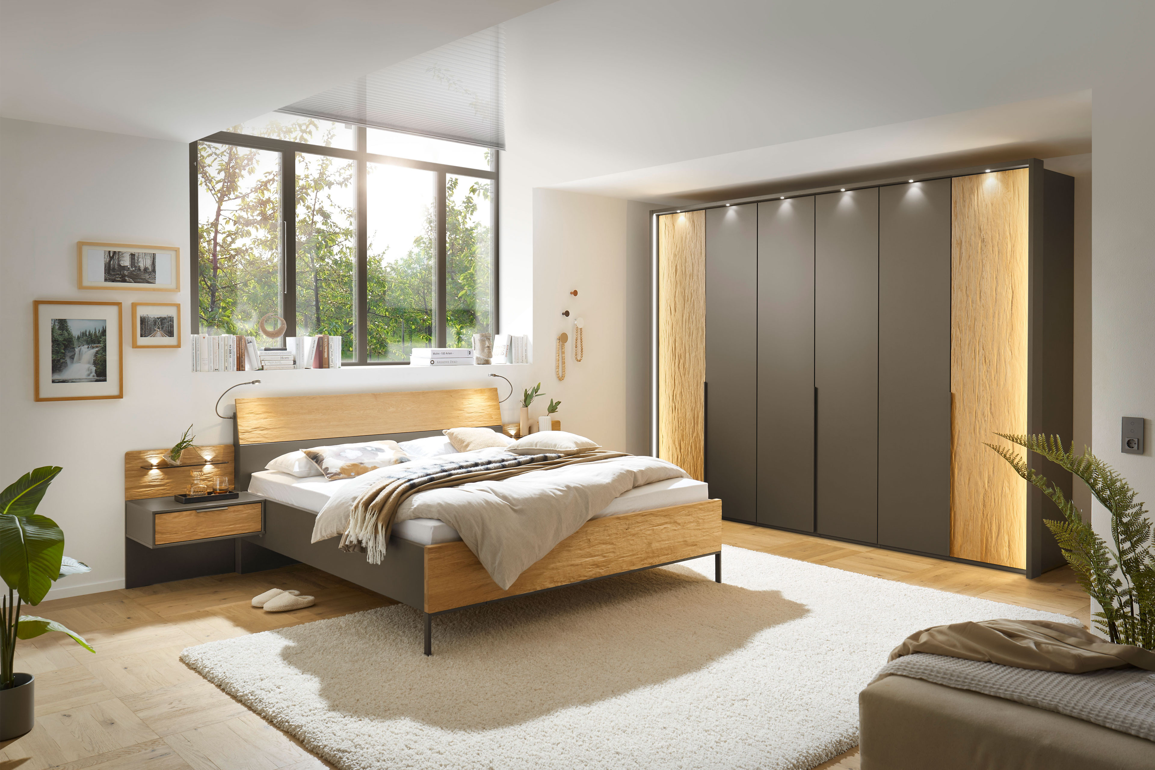 Schrank, Bett und Nachttisch-Paar von Wiemann - Modell Bardolino - Beleuchtung optional Bardolino - Schlafzimmermöbel mit natürlichen Akzenten.
