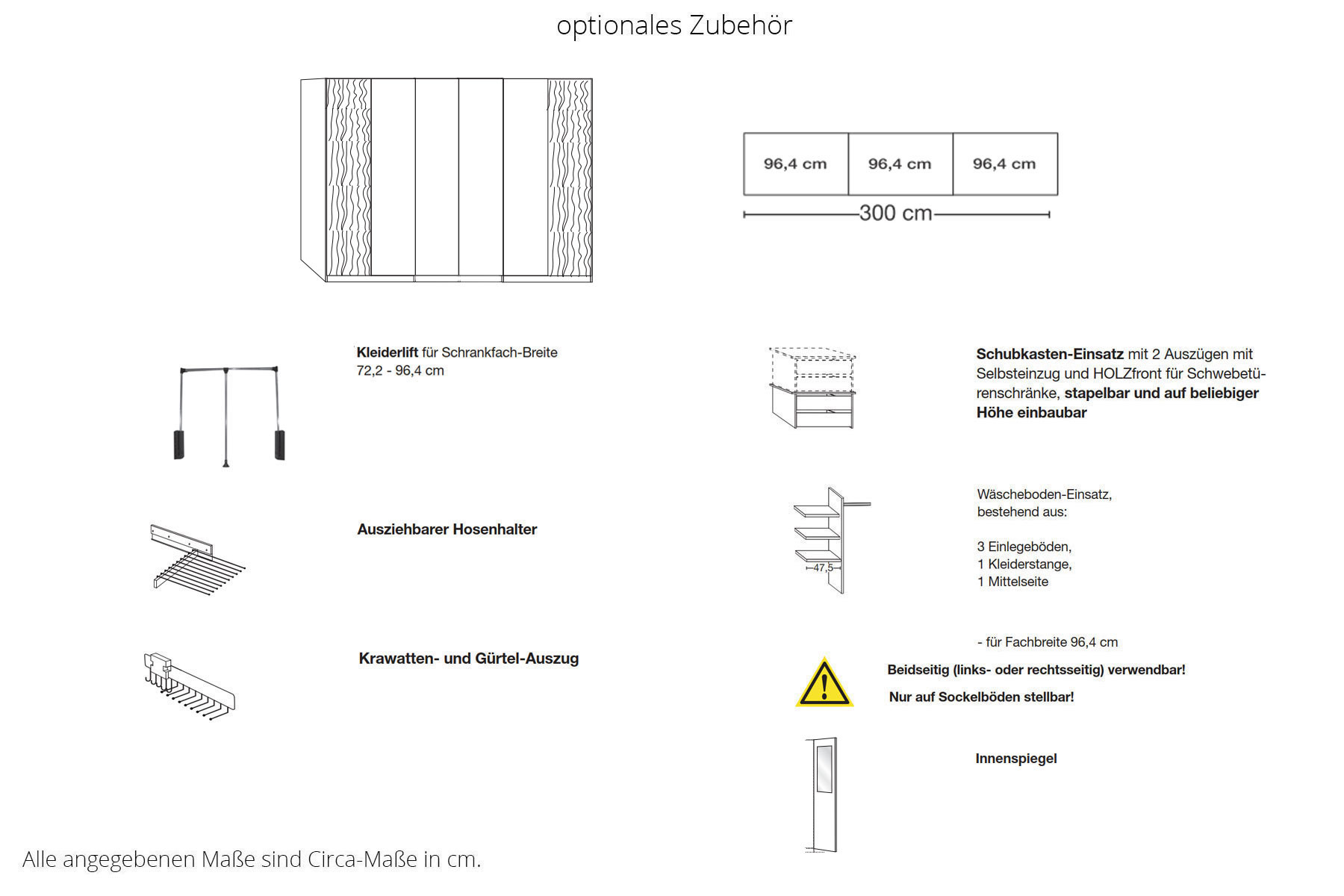 - Schrank: bestehend aus 3 Elementen, je ca. 96,4 cm breit (100er Elemente), je Element 2 Einlegeböden und 1 Kleiderstange inklusive