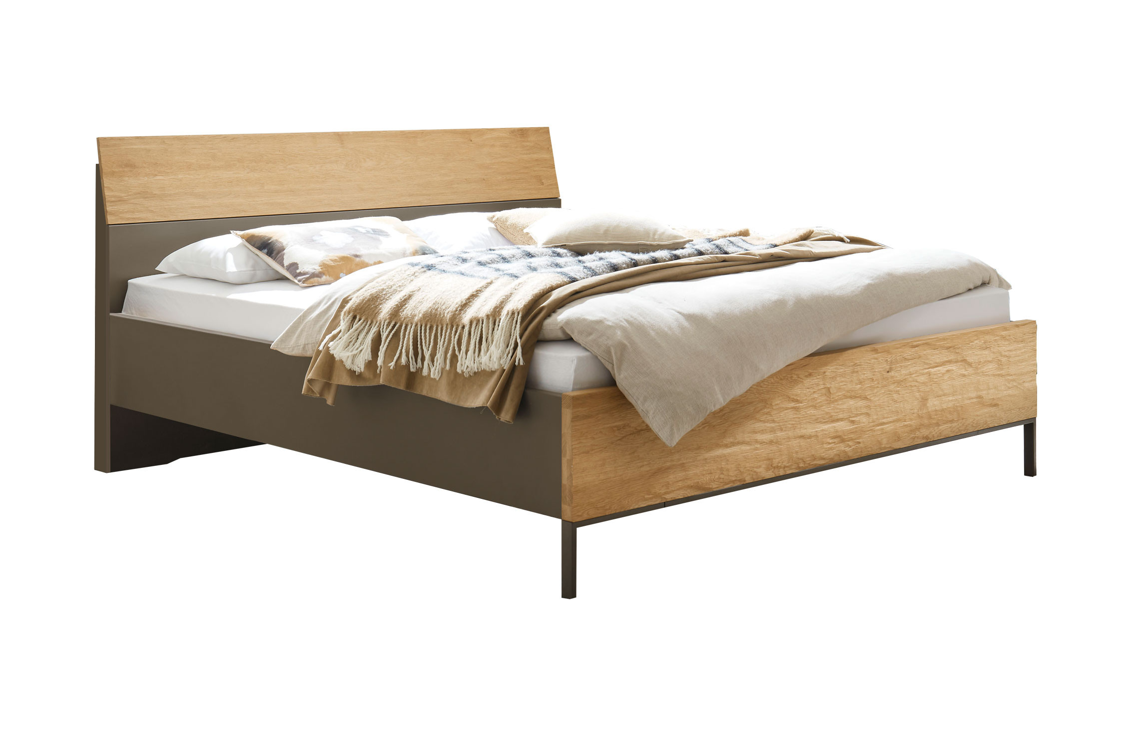 - Bett: mit Holzkopfteil in Paneeloptik, oberes Kopfteilpaneel und Fußteil in Absetzung (Massivholz)