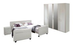 Die hier abgebildete Senioren-Schlafzimmer-Einrichtung des Modells Bern von der in Deutschland ansässigen Firma Wiemann beinhaltet bereits im Grundangebot alle notwendigen Schlafraummöbel. Der 4-türige Kleiderschrank inklusive Spiegelauflagen und die Doppelbett-Anlage mitsamt der beiden kompakten Nachtschränke bilden das Start-Set, das Sie über den Punkt Zusatzoptionen mit den dekorativen Beleuchtungselementen sowie mit extra Zubehör für eine bedarfsgerechte Inneneinrichtung des Schrankes ergänzen können. Das Highlight dieser Möbel-Zusammenstellung ist das Doppelbett, dessen 180er Liegefläche auf zwei Einzelbetten aufgeteilt wurde, die am Kopfteil miteinander verbunden sind, sich jedoch dank der Rollen am Fußende auf Wunsch auseinander schieben lassen. So hat jeder Partner die Freiheit, seine Betthälfte links und rechts zum Zubettgehen oder zum Aufstehen zu nutzen. Es ist auch möglich, die Komfort-Möbel des Programms Bern von Wiemann anstatt in einem klassisch weißen Outfit in einer authentischen Holznachbildung zu bestellen, falls Sie einen Hauch Natürlichkeit bevorzugen.
