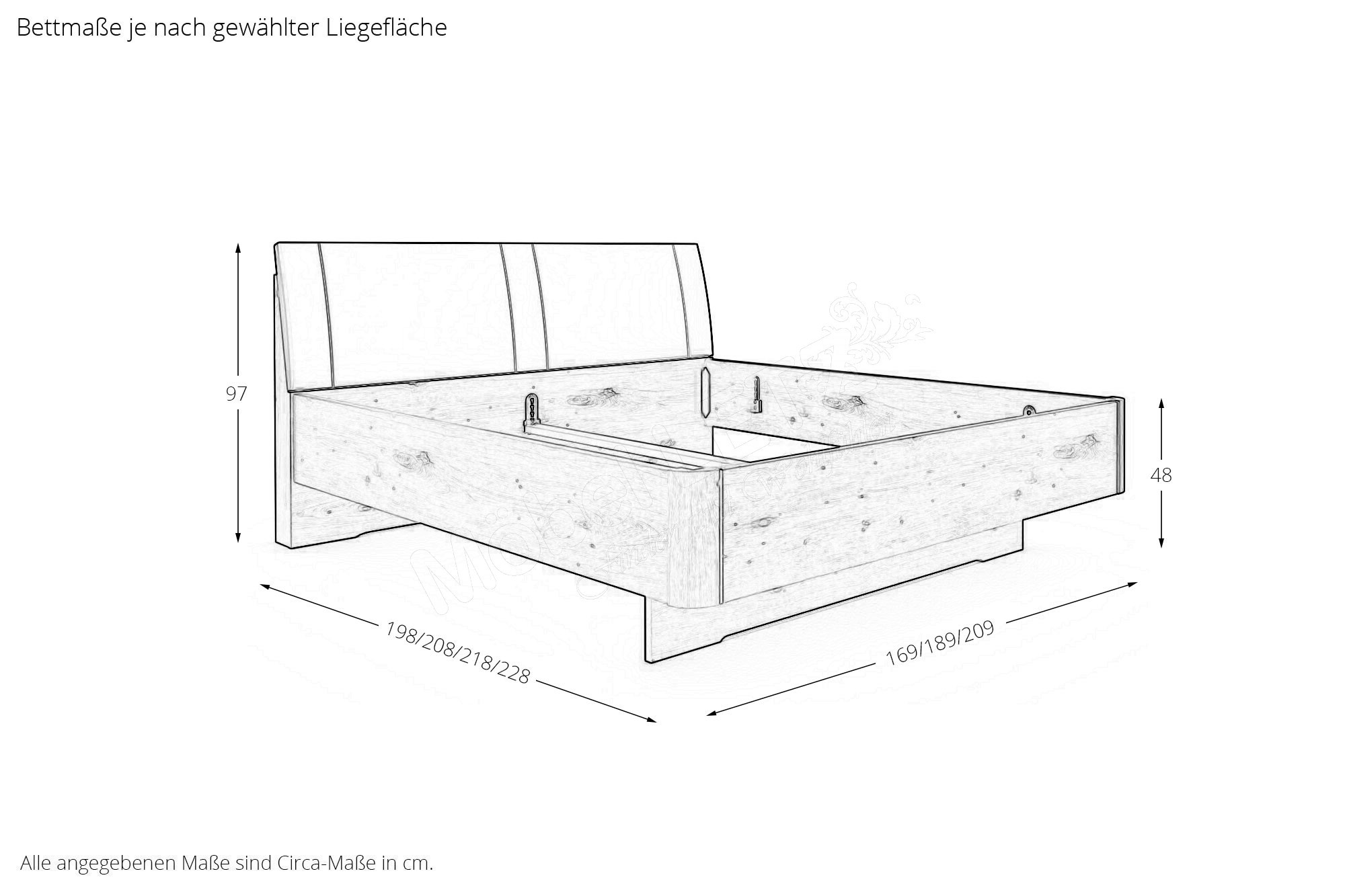 - Bett: Höhe Kopfteil ca. 97 cm, Höhe Fußteil/ Oberkante Bettseite ca. 48 cm