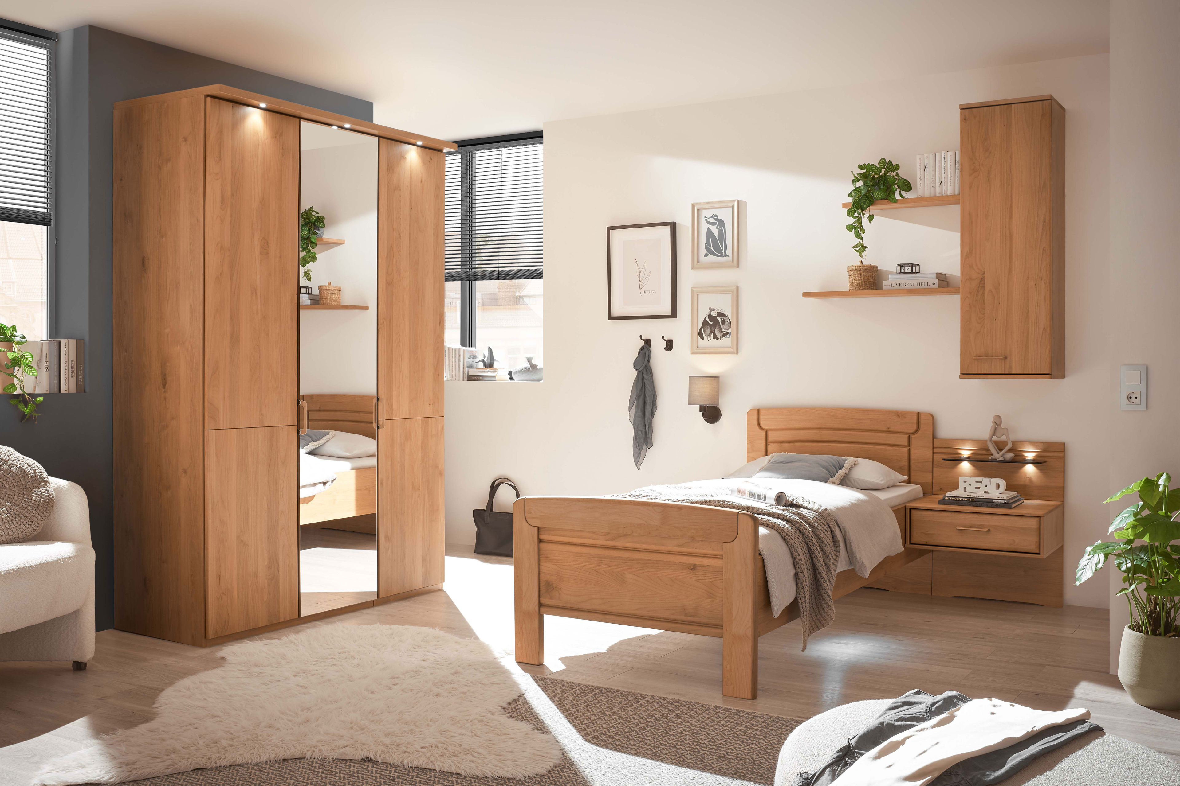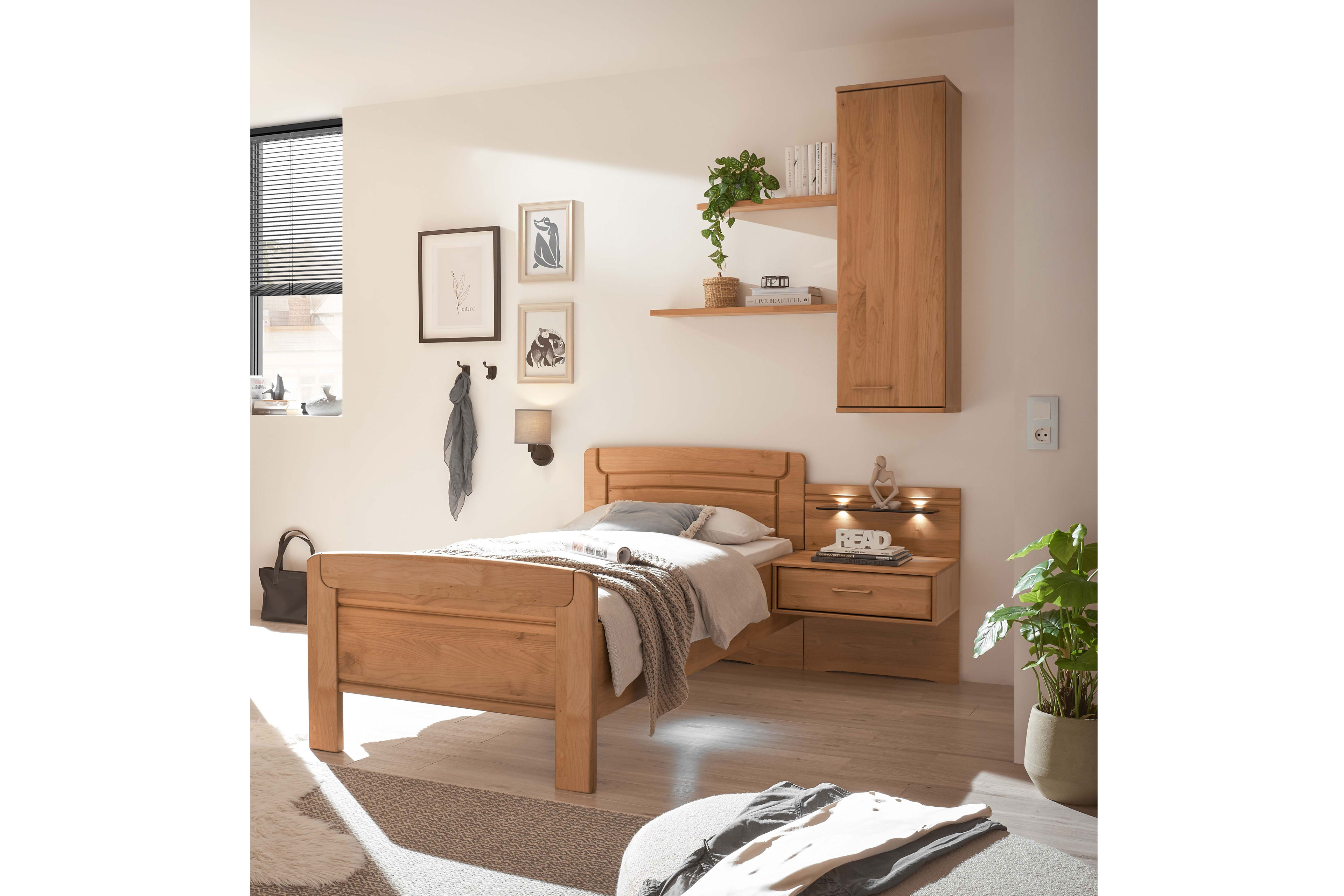 Aufgrund seiner feinporigen Struktur erscheint das bearbeitete Erlenholz, das den hier vorgestellten Möbeln seine Optik verleiht, besonders glatt und die lebhafte Struktur wird hervorgehoben. Um die natürlichen Ressourcen zu schonen, wurden bei dem Schlafraum-Programm Graz von Wiemann neben Massivholz-Elementen auch Möbelteile mit einer Holznachbildung verwendet. Der 3-türige Kleiderschrank, das Komfortbett mit der Liegefläche 90 x 200 cm und der Hänge-Nachttisch bilden das Grundangebot des Wiemann Schlafzimmer-Sets. Ergänzendes Zubehör für den Kleiderschrank, verschiedene Beleuchtungslösungen sowie den abgebildeten Hängeschrank und die beiden Wandregal-Böden können Sie über die Zusatzoptionen hinzufügen, um Ihren Schlafraum ganz nach Wunsch zu gestalten. Die Graz Möbel-Serie eignet sich besonders gut für die Planung und Umsetzung seniorengerechter Einrichtungskonzepte. So ist es zum Beispiel möglich, direkt online ein zweites Bett mitzubestellen, das mit dem optionalen Vario-Beschlag mit dem anderen Einzelbett zum Doppelbett verbunden werden kann. Problemlos können die Betten jederzeit wieder separiert werden, um beispielsweise jedem Partner den Bettein- und -ausstieg beidseitig zu ermöglichen. Gerade im fortgeschrittenen Alter sind funktionale, flexible Raumausstattungen von Vorteil. Lassen Sie sich gern von unseren Einrichtungsexperten Ihre individuelle Schlafzimmer-Zusammenstellung planen. Senden Sie Ihre Anfrage per Kontaktformular, rufen Sie während der Öffnungszeiten unser Verkaufsteam an oder nutzen Sie unseren Rückruf-Service.