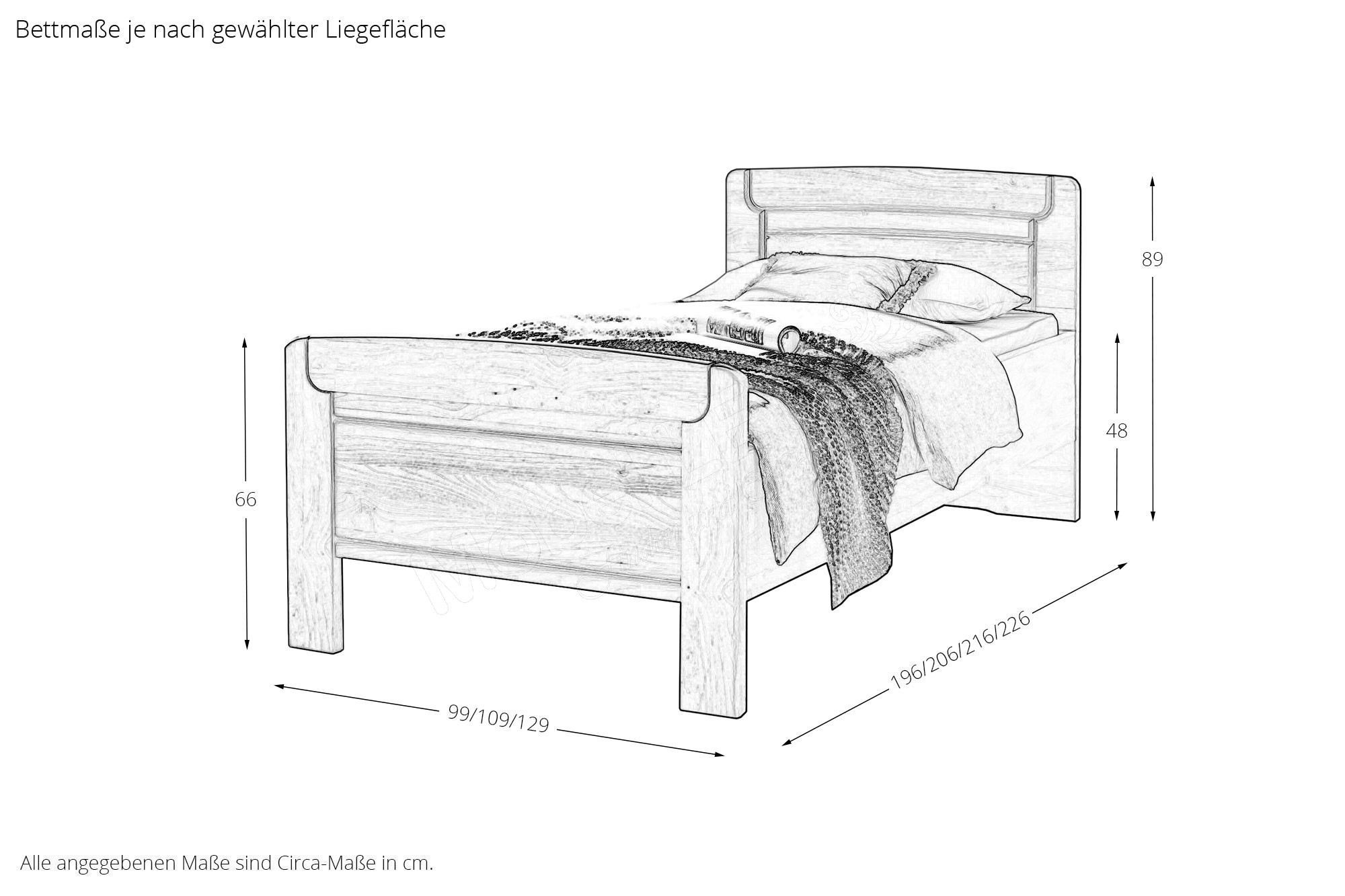 - Bett: Höhe Kopfteil ca. 89 cm, Höhe Fußteil ca. 66 cm, Bettseitenhöhe ca. 48 cm