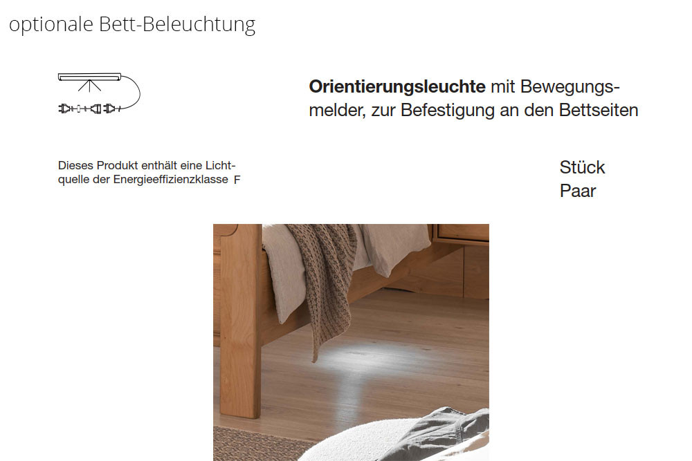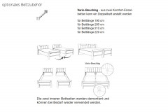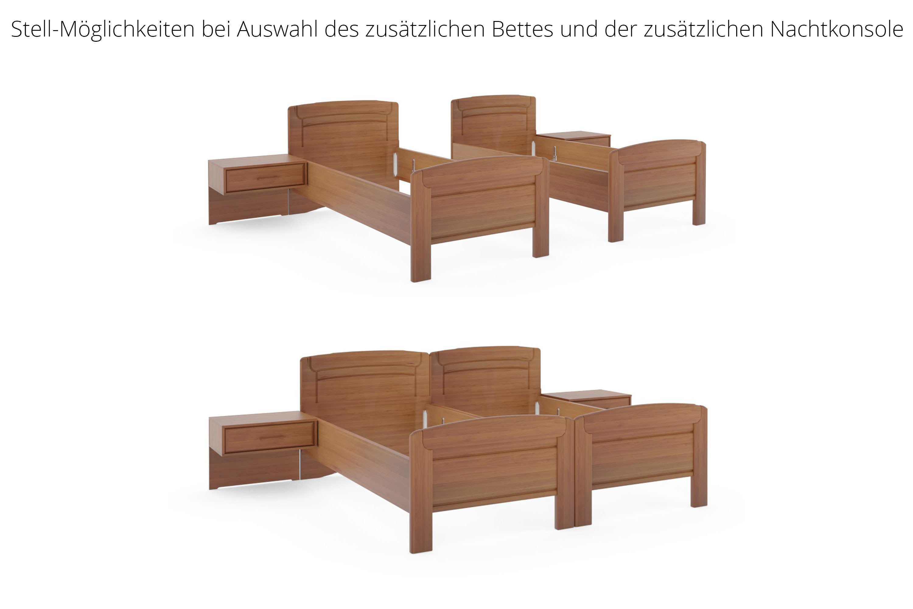 Die Betten dieser Möbelserie sind nicht frei im Raum positionierbar. Teilweise sind die Kopfteile der Betten "zweifarbig" (Unterteil in einer anderen Ausführung als Oberteil des Kopfteils - auf Rückseite sichtbar).