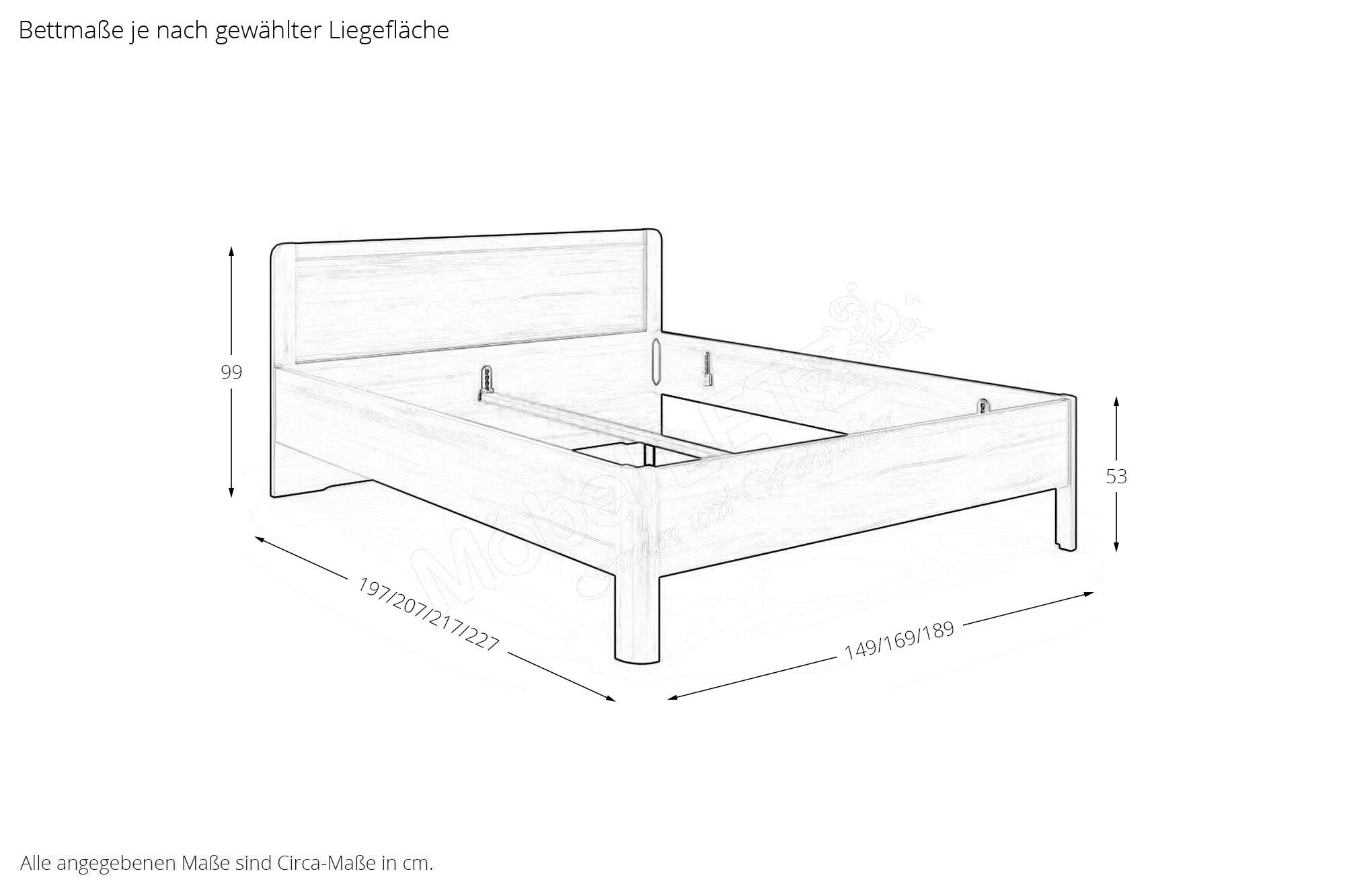 - Bett: Höhe Kopfteil ca. 99 cm, Höhe Fußteil ca. 53 cm, Höhe bis zur Bettseiten-Oberkante ca. 53 cm