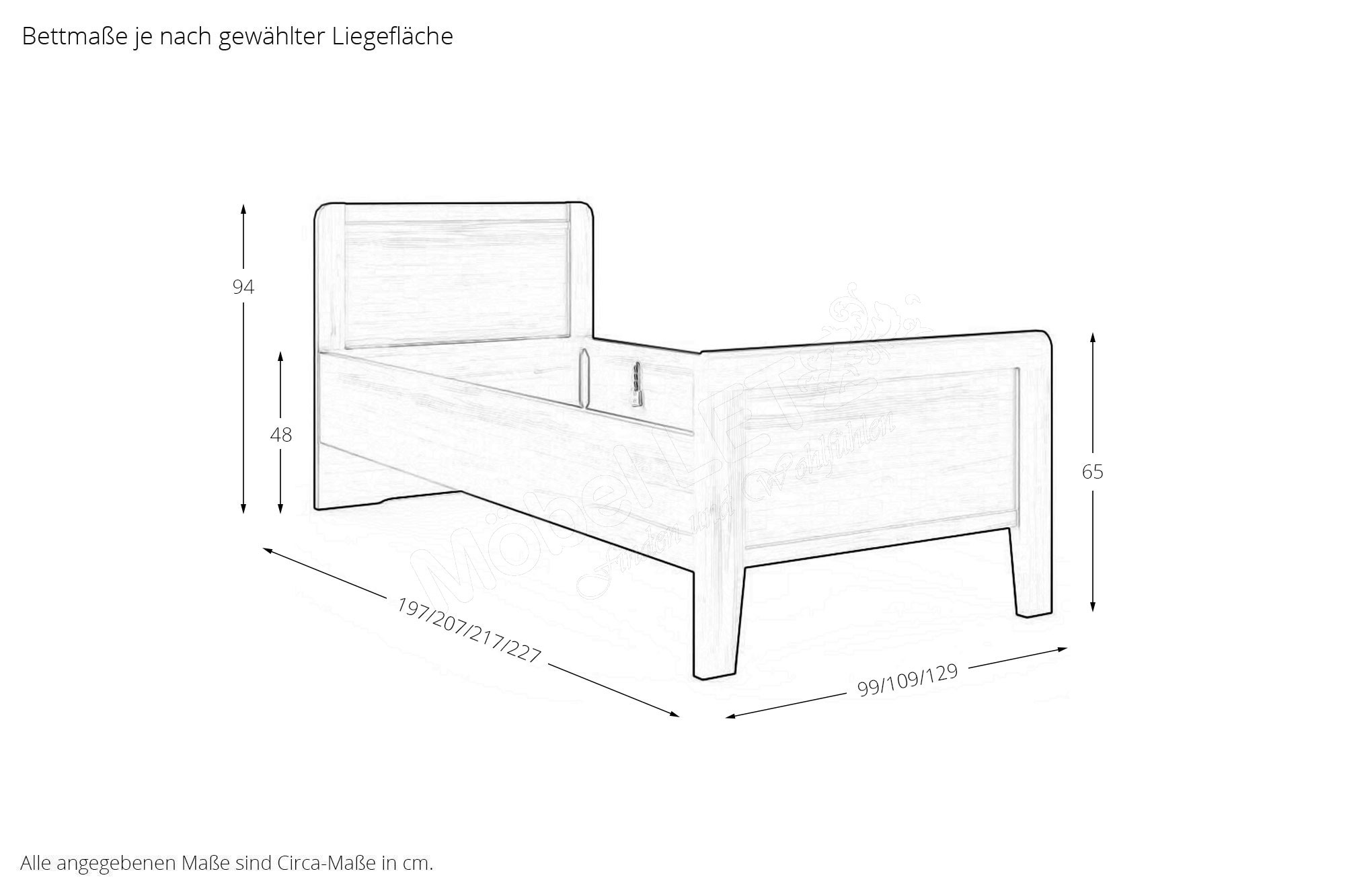 - Bett: Höhe Kopfteil ca. 94 cm, Höhe Fußteil ca. 65 cm, Höhe bis zur Bettseiten-Oberkante ca. 48 cm