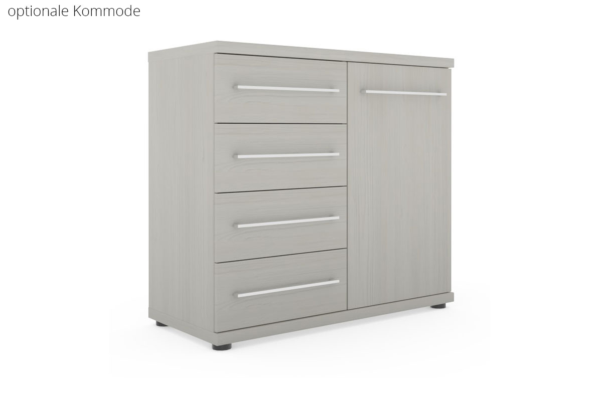 Aus dem Komfort-Schlafzimmer-Programm Mainau von Wiemann, dessen Möbel sich in einer freundlichen und ressourcenschonenden Polar-Lärche-Holznachbildung zeigen, stellen wir Ihnen in diesem Angebot eine 3-teilige Kombination aus einem Kleiderschrank, einem Einzelbett und einem kompakten Nachtschrank vor. Verschiedene Attribute, die wir für Sie als Zusatzoptionen zusammengestellt haben, ermöglichen Ihnen, eine bedarfsgerechte Anpassung der einzelnen Elemente vorzunehmen. Sie entscheiden, welche Änderungen oder Ergänzungen notwendig sind. Bestimmen Sie beispielsweise das favorisierte Liegeflächenmaß für das Bett, das mit seinem hohen Stollenfußteil nicht nur für eine elegante Optik, sondern auch für eine erhöhte Stabilität der Matratze sorgt. Oder optimieren Sie das Ordnungssystem des Drehtürenschrankes, indem Sie weitere Wäscheböden oder praktische Schubladen, die übrigens in der von Ihnen gewünschten Höhe eingebaut werden können, hinzubuchen. Zudem steht für Sie eine Kombikommode zum Zukauf bereit. Stellen Sie das Möbel-Set so zusammen, wie es am besten Ihren individuellen Bedürfnissen entspricht. Mainau von Wiemann – ein komfortables Schlafzimmer made in Germany.