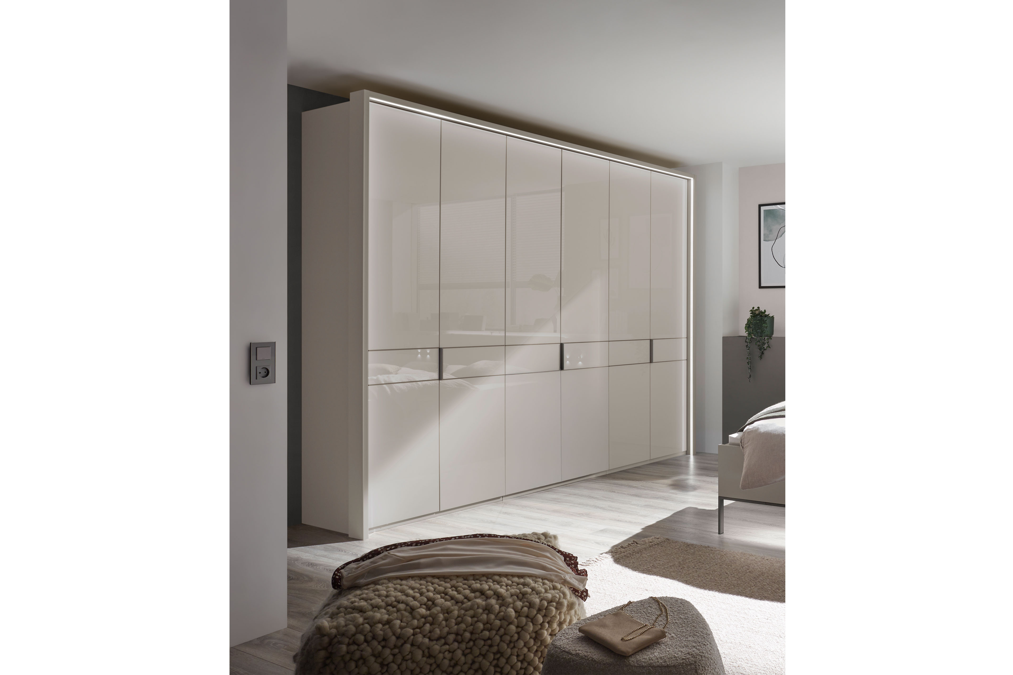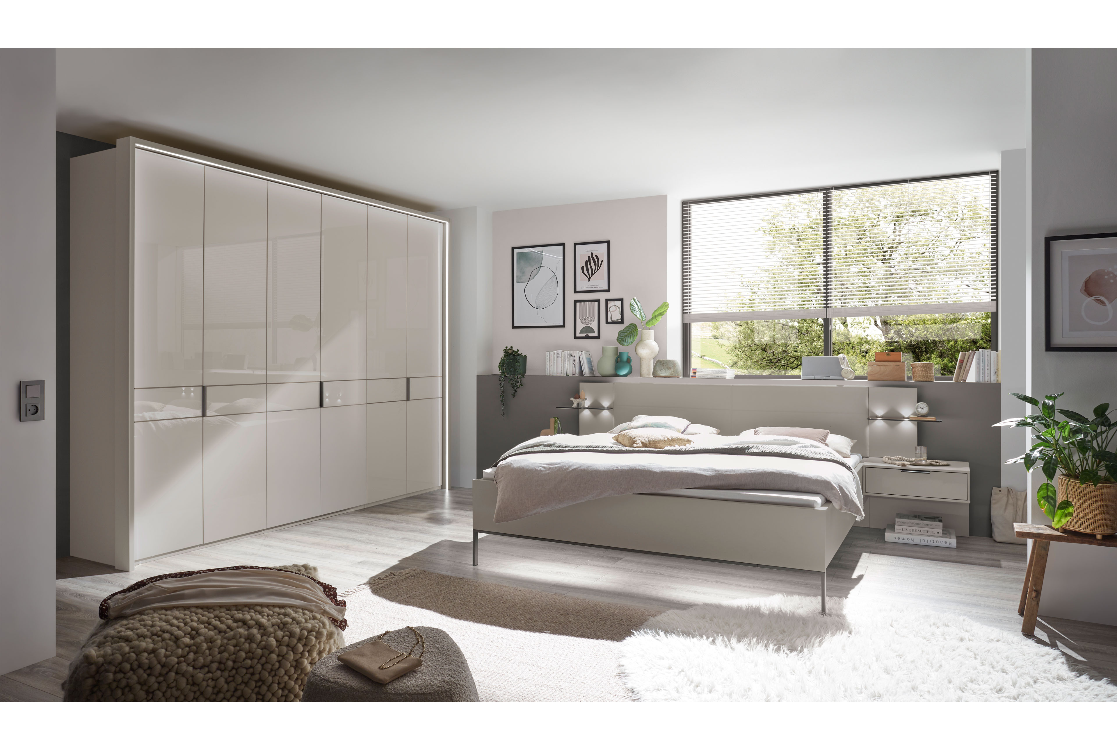 Moderne champagnerfarbene Glasfronten und das dazu passende Dekor schmücken die Schlafzimmermöbel der hier angebotenen Zusammenstellung, die aus dem Programm Parma von Wiemann stammt. Die Basis bilden der 6-türige Kleiderschrank, das Bett mit der Liegefläche 180 x 200 cm und die beiden schwebend anmutenden Nachtkonsolen. Alle gezeigten Beleuchtungsmöglichkeiten können je nach Wunsch optional hinzugefügt werden. Zudem sind die Möbel-Elemente in weiteren Farb-Varianten sowie zweifarbig erhältlich, sodass die optische Gestaltung in Ihren Händen liegt. Die Standard-Ausstattung des Kleiderschrankes kann mithilfe der Zusatzoptionen ganz nach Bedarf mit weiteren Wäscheböden, einem Kleiderlift oder auch praktischen Schubkästen ergänzt werden. Problemlos können Sie auch die Liegeflächengröße des Bettes an Ihre individuellen Bedürfnisse anpassen. Geeignete Lattenroste und Matratzen für Ihre favorisierte Bettgröße finden Sie im Möbel Letz Online-Shop in der Kategorie Bettzubehör. Bedarfsgerecht einrichten … mit Parma von Wiemann.