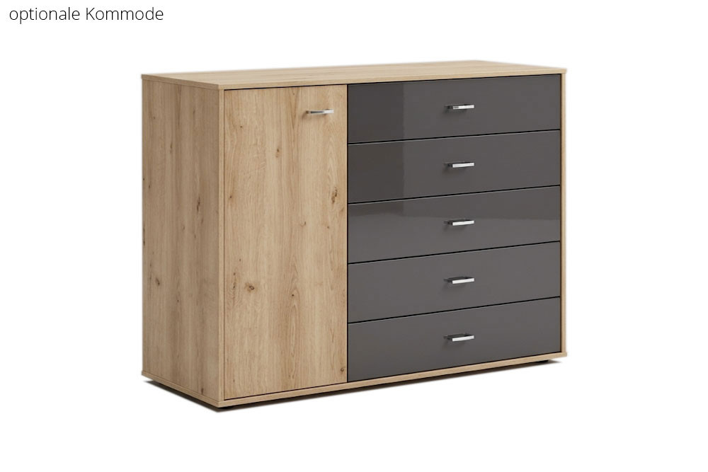 Eine naturgetreue Holznachbildung und edle Glasauflagen sorgen für die moderne Optik der Wiemann Schlafzimmermöbel Sevilla. Der 5-türige Kleiderschrank und die Schwebe-Bettanlage inklusive Nachtkonsolen bilden in diesem Artikel unser Grundangebot, das Sie mithilfe der zur Verfügung gestellten Wahlmöglichkeiten ganz nach Bedarf verändern und ergänzen können. Neben verschiedenen Liegeflächengrößen für das Bett, das mit einem bequemen Kunstleder-Polsterkopfteil aufwartet, sind diverse Zusatz-Elemente, wie ein stilvoller Passepartoutrahmen und Zubehörteile für die Schrank-Innenausstattung sowie Paneelaufsätze für die Nachttische oder auch eine praktische Kombikommode, wählbar. Im Möbel Letz Online-Shop bieten wir übrigens auch eine Vielzahl an Lattenrosten und Matratzen für das Bett dieses Schlafzimmer-Sets an. Die zugehörige Kategorie lässt sich ganz einfach öffnen, indem Sie auf das farbige Wort „Bettzubehör“ klicken. Mit dem Sevilla Schlafzimmer aus der Wiemann Möbelwelt zieht eine qualitativ hochwertige Einrichtung in Ihr Zuhause ein, die in Deutschland gefertigt wurde und für gesundes Wohnen steht.