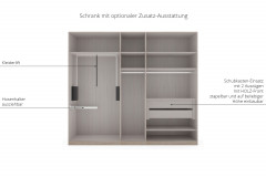 - Drehtürenschrank: 2 Elemente je ca. 100 cm breit (außen), 1 Element ca. 50 cm breit (mittig), je Element 2 Einlegeböden und 1 Kleiderstange