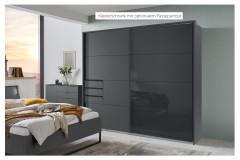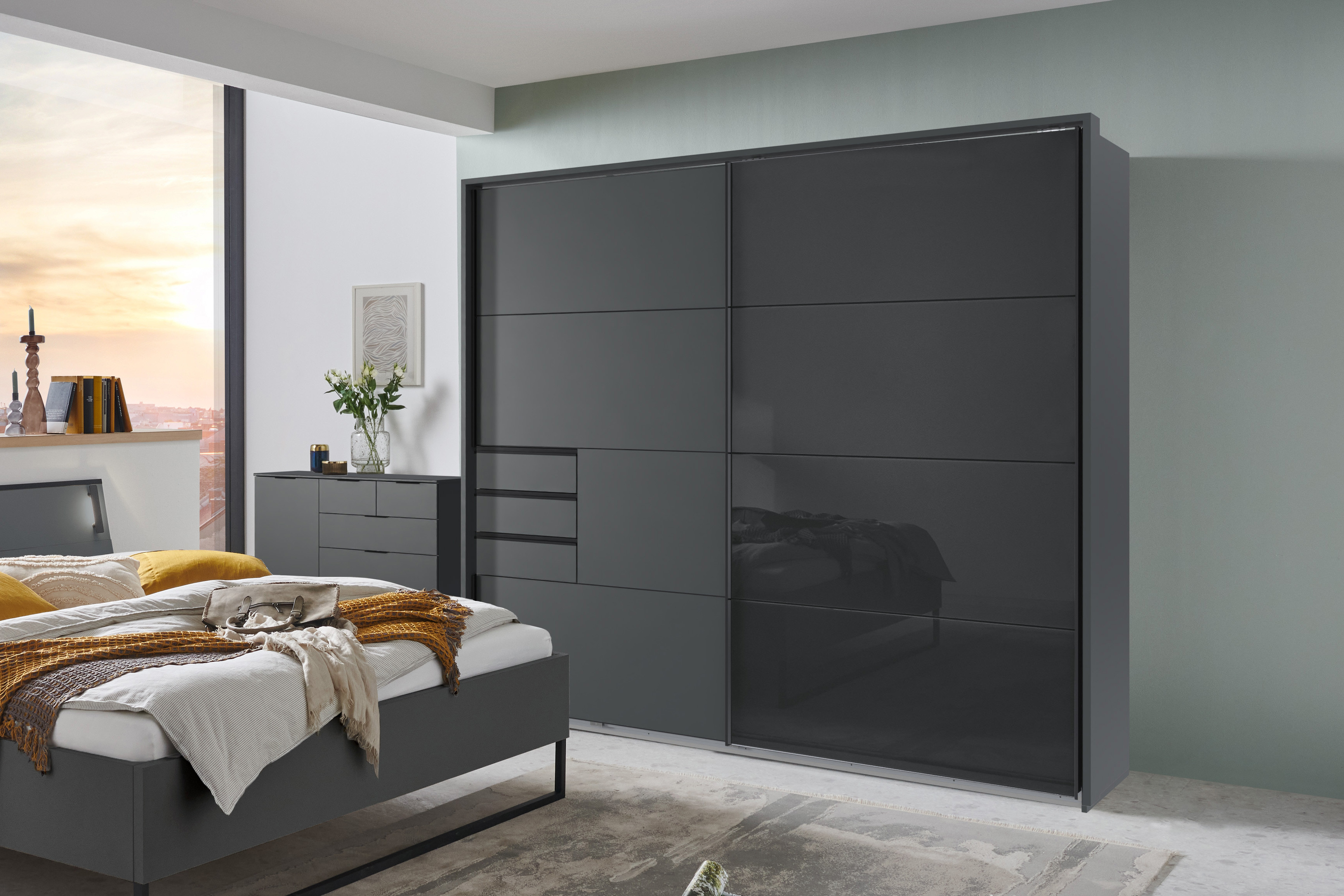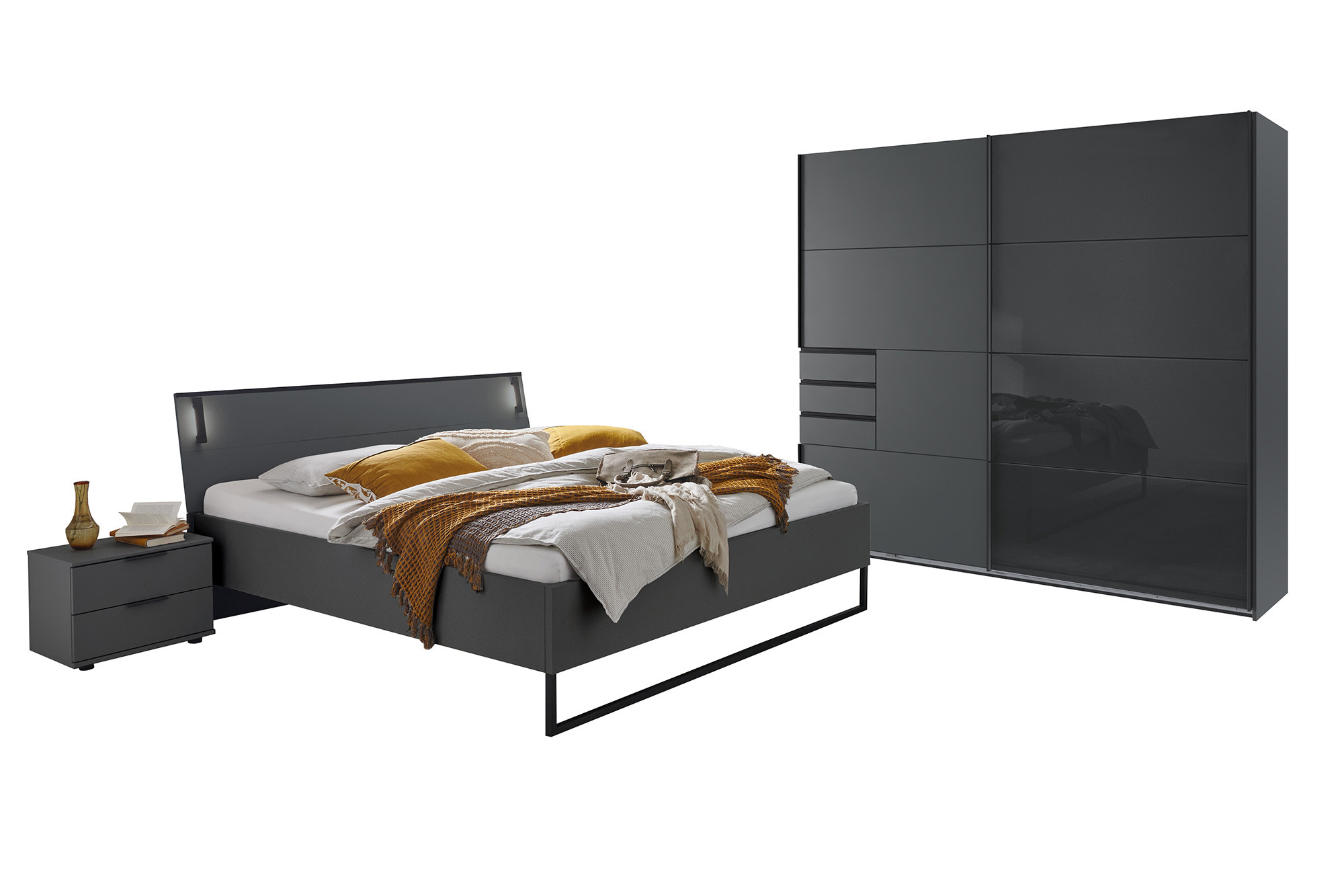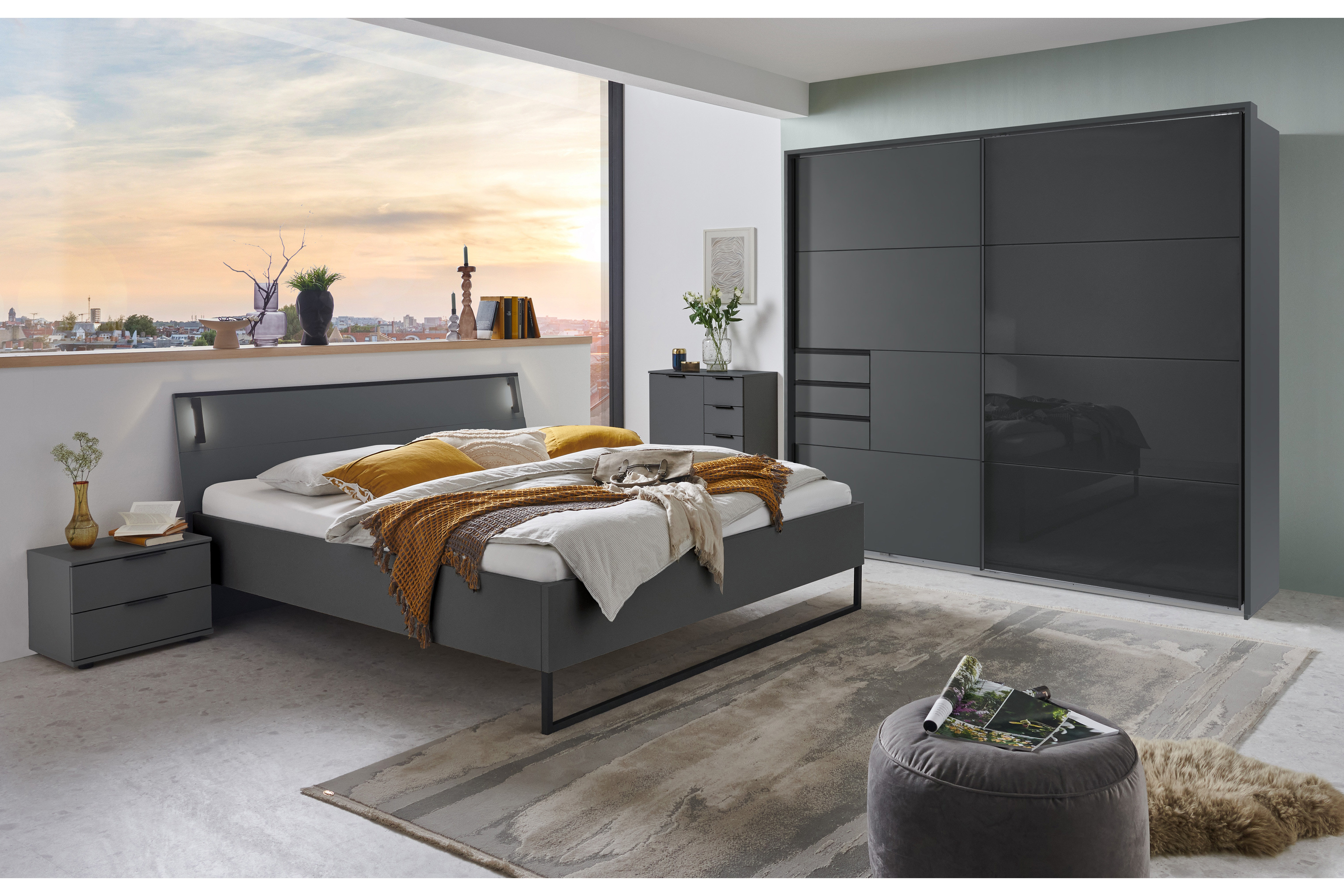 Erleben Sie mit dem Schlafzimmer Tilburg von Wimex ein Raumgefühl, das Sie begeistert: Der Schwebetürenschrank verbindet großzügigen Stauraum mit elegantem Design, das Ruhe, Ordnung und Stil in Ihr Schlafzimmer bringt. Die hochwertig verarbeiteten Materialien und die durchdachte Innenaufteilung unterstützen eine mühelose Organisation, während die Glastür mit schimmernden Akzenten einen Hauch von Luxus und Tiefe ins Raumgefühl legt. Ob saharagrau oder grafit, Tilburg passt sich mit den zwei harmonischen Farben vielfältigen Einrichtungskonzepten an und schafft ein warmes, wohnliches Ambiente oder wahlweise eine kühlere moderne Klarheit. Der 2-türige Schwebetürenschrank bietet Ihnen mit einer Breite von ca. 225 cm und einer Höhe von etwa 208 cm großzügigen Stauraum. Drei Schubkästen auf der linken Seite sorgen im Schrankinneren für Ordnung, während die rechte Tür mit einer Glasfront stilvolle Leichtigkeit verleiht. Zum Set gehört noch das Bett, das im Grundangebot eine Liegefläche von 140 x 200 cm hat und in weiteren Größen wählbar ist. Hinzu kommt eine praktische Kopfteilbeleuchtung, die Ihnen beispielsweise beim Lesen sanft warmes Licht spendet und eine wohnliche Atmosphäre schafft. Ein zusätzlicher Nachtschrank rundet das Schlafzimmerangebot ab, damit Sie alles Nötige griffbereit haben. Mit unseren Zusatzoptionen können Sie ganz leicht eine zweite Nachtkonsole zum Angebot hinzufügen. Hier finden Sie noch weiteres Zubehör für den Kleiderschrank und die Möglichkeit, aus den beiden attraktiven Farben zu wählen.