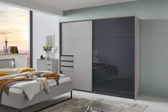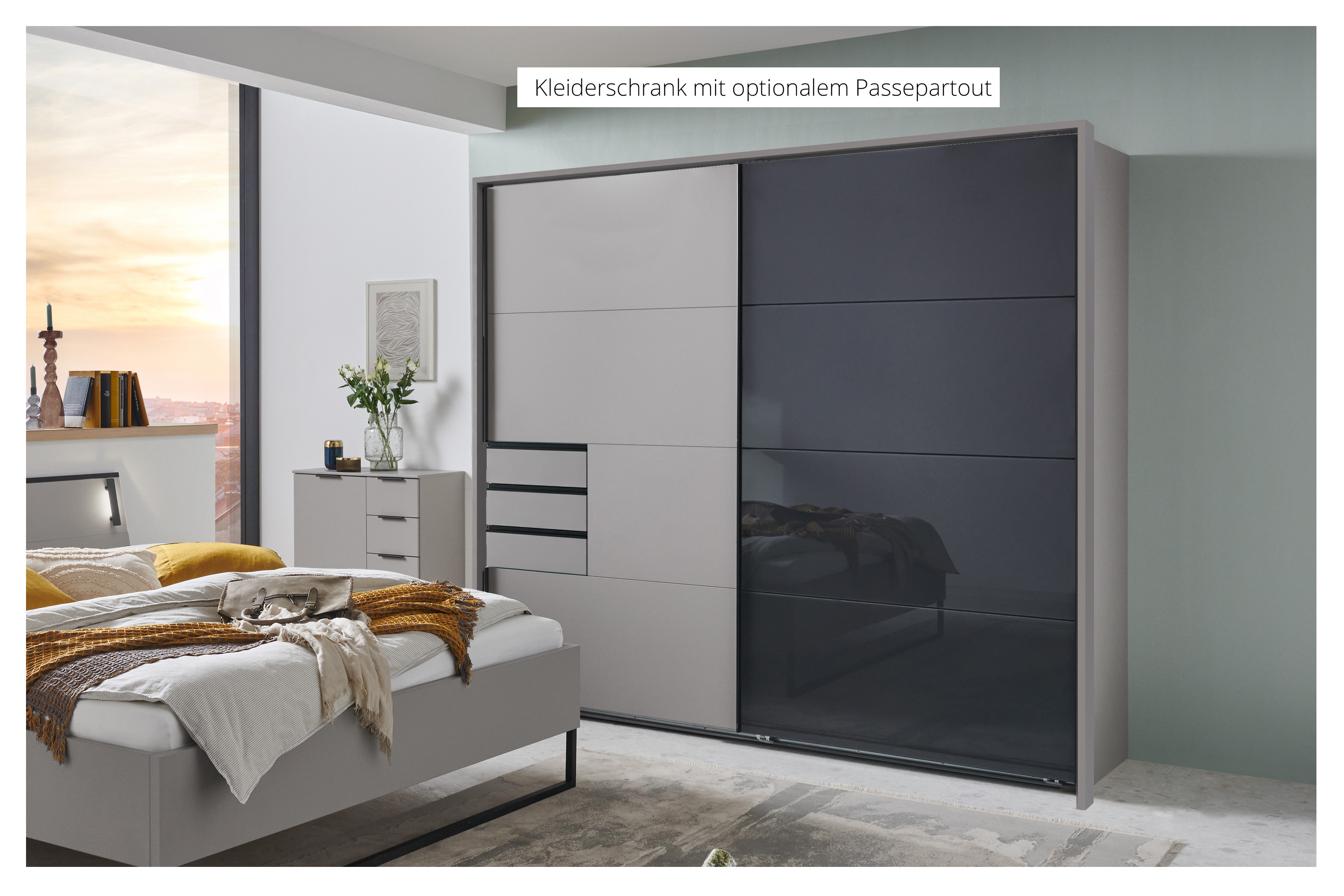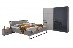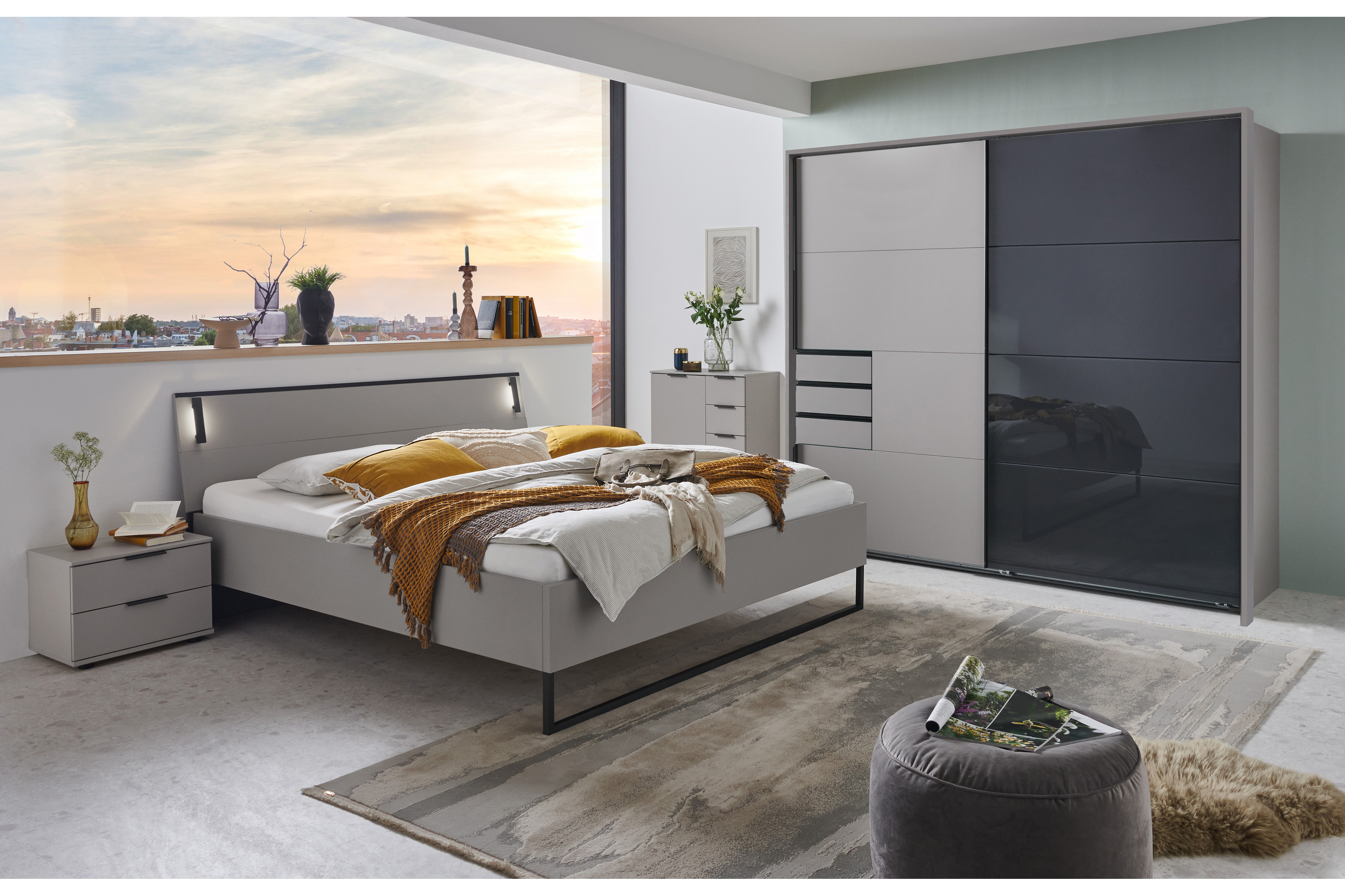 Erleben Sie mit dem Schlafzimmer Tilburg von Wimex ein Raumgefühl, das Sie begeistert: Der Schwebetürenschrank verbindet großzügigen Stauraum mit elegantem Design, das Ruhe, Ordnung und Stil in Ihr Schlafzimmer bringt. Die hochwertig verarbeiteten Materialien und die durchdachte Innenaufteilung unterstützen eine mühelose Organisation, während die Glastür mit schimmernden Akzenten einen Hauch von Luxus und Tiefe ins Raumgefühl legt. Ob saharagrau oder grafit, Tilburg passt sich mit den zwei harmonischen Farben vielfältigen Einrichtungskonzepten an und schafft ein warmes, wohnliches Ambiente oder wahlweise eine kühlere moderne Klarheit. Der 2-türige Schwebetürenschrank bietet Ihnen mit einer Breite von ca. 225 cm und einer Höhe von etwa 208 cm großzügigen Stauraum. Drei Schubkästen auf der linken Seite sorgen im Schrankinneren für Ordnung, während die rechte Tür mit einer Glasfront stilvolle Leichtigkeit verleiht. Zum Set gehört noch das Bett, das im Grundangebot eine Liegefläche von 140 x 200 cm hat und in weiteren Größen wählbar ist. Hinzu kommt eine praktische Kopfteilbeleuchtung, die Ihnen beispielsweise beim Lesen sanft warmes Licht spendet und eine wohnliche Atmosphäre schafft. Ein zusätzlicher Nachtschrank rundet das Schlafzimmerangebot ab, damit Sie alles Nötige griffbereit haben. Mit unseren Zusatzoptionen können Sie ganz leicht eine zweite Nachtkonsole zum Angebot hinzufügen. Hier finden Sie noch weiteres Zubehör für den Kleiderschrank und die Möglichkeit, aus den beiden attraktiven Farben zu wählen.