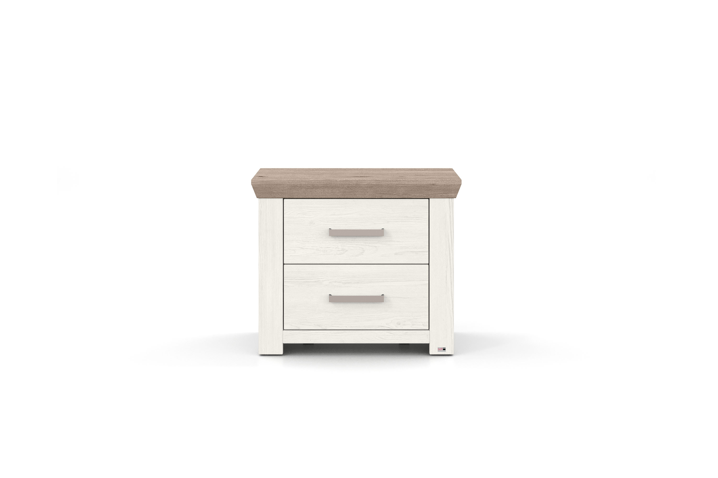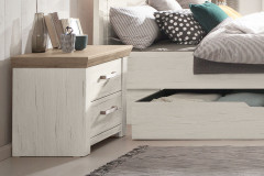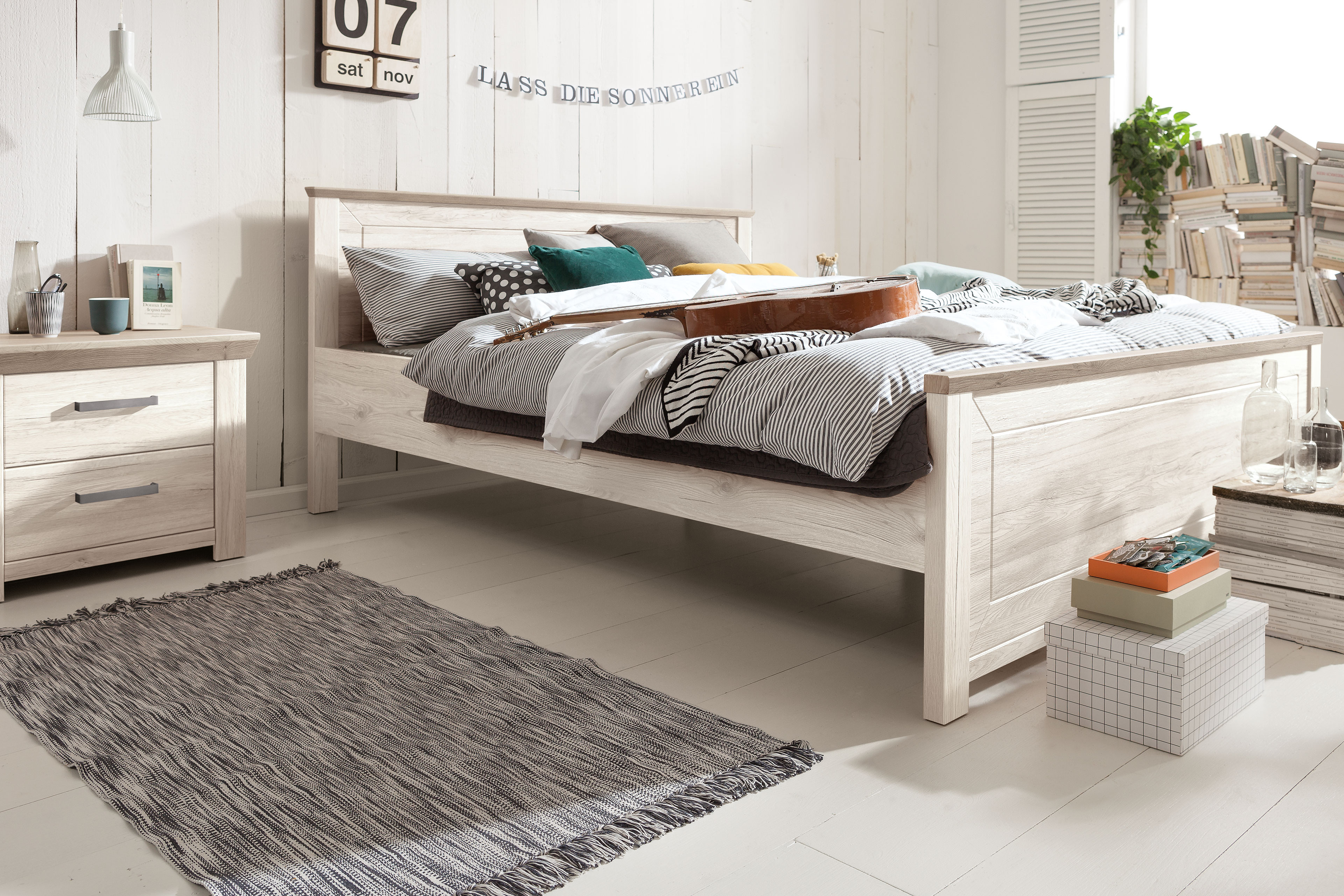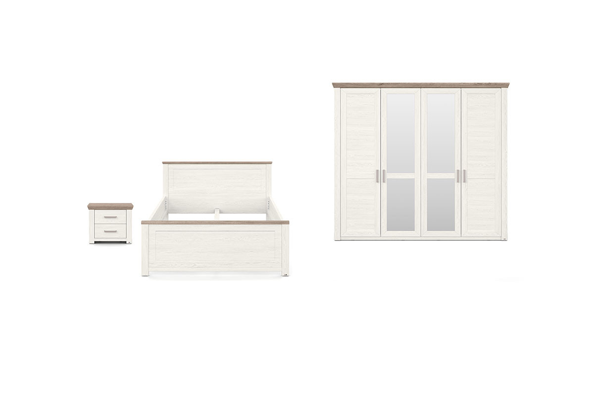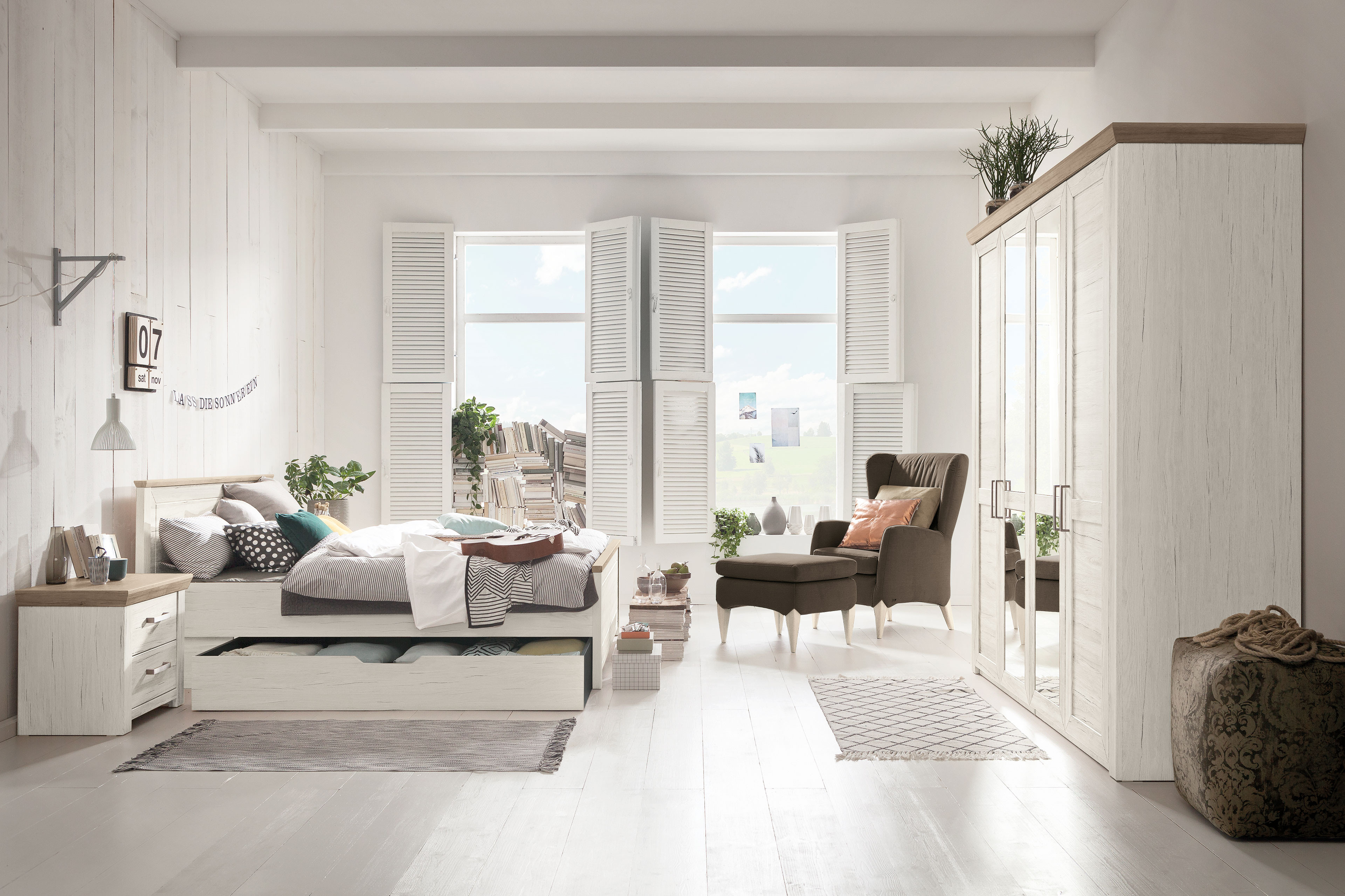 Das Schlafzimmer York aus der Kollektion set one by Musterring verkörpert zeitgemäßes, jugendliches Wohnen mit einer behaglichen, naturverbundenen Ausstrahlung. Die ansprechende Mischung aus der hellen Pino-Aurelio-Nachbildung und den schönen Akzenten in Eiche-Nelson-Nachbildung schafft eine freundliche und zugleich moderne Atmosphäre. Durch die geradlinige Gestaltung und die durchdachten Einzelheiten vereint York Wohngefühl und Designbewusstsein auf ideale Weise. Der Schrank mit vier Drehtüren, von denen zwei eine große Spiegelfläche besitzen, lässt den Raum optisch größer wirken und ist äußerst praktisch. Mit einer Innenentiefe von etwa 56 Zentimetern bietet er reichlich Platz, der dank zweier breiter Bereiche mit je einem Einlegeboden und einer Kleiderstange hervorragend organisiert ist. Die Schranktüren, die sich um 100 Grad öffnen lassen, und die stabilen Metallteile betonen die Wertigkeit und Haltbarkeit. Griffe aus Metall in mattem Nickel setzen moderne Blickpunkte und fügen sich nahtlos ins Gesamtbild ein. Die Schlafgelegenheit hat einen Bettrahmen in Pino-Aurelio wird durch auffällige Randleisten in Eiche-Nelson geschmackvoll hervorgehoben. Mit einer angenehmen Kopfhöhe von ungefähr 93 Zentimetern lädt es zum gemütlichen Zurücklehnen ein, während die abgestimmten Höhen von Fußteil und Bettseiten ein ruhiges, harmonisches Aussehen gewährleisten. Vervollständigt wird die Garnitur durch den zugehörigen Nachttisch, der zwei geräumige Schubladen besitzt. Diese gleiten auf Qualitätsmetallauszügen mit sanftem Schließmechanismus und sorgen für eine geräuschlose, angenehme Handhabung. Die Deckplatten in Eiche-Nelson-Nachbildung bilden einen stilvollen Kontrast und nehmen das Design der übrigen Möbelstücke geschickt wieder auf. Mithilfe unseres Konfigurators kann das set one by Musterring Schlafzimmer York persönlich gestaltet werden und wird somit zur idealen Wahl für ein modernes, junges Zuhause mit hohen Ansprüchen an Wertigkeit und Gestaltung.