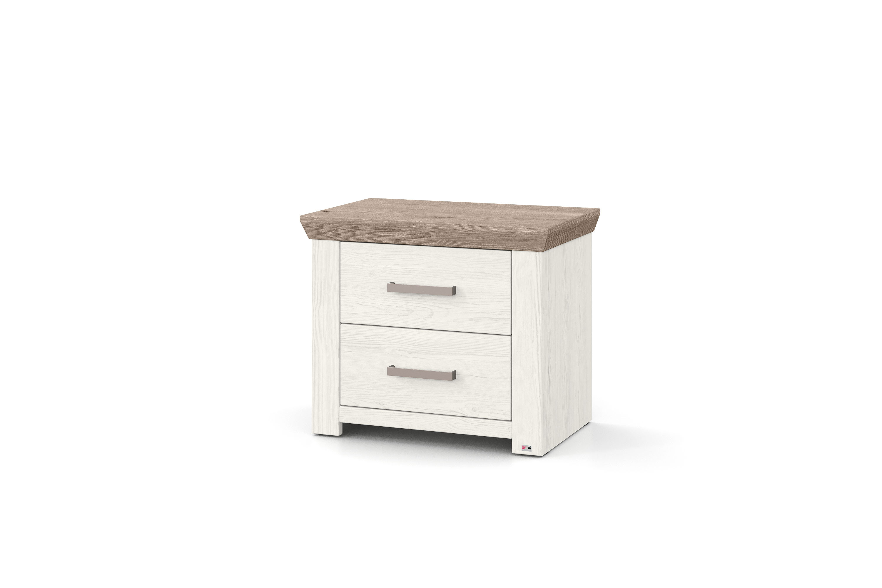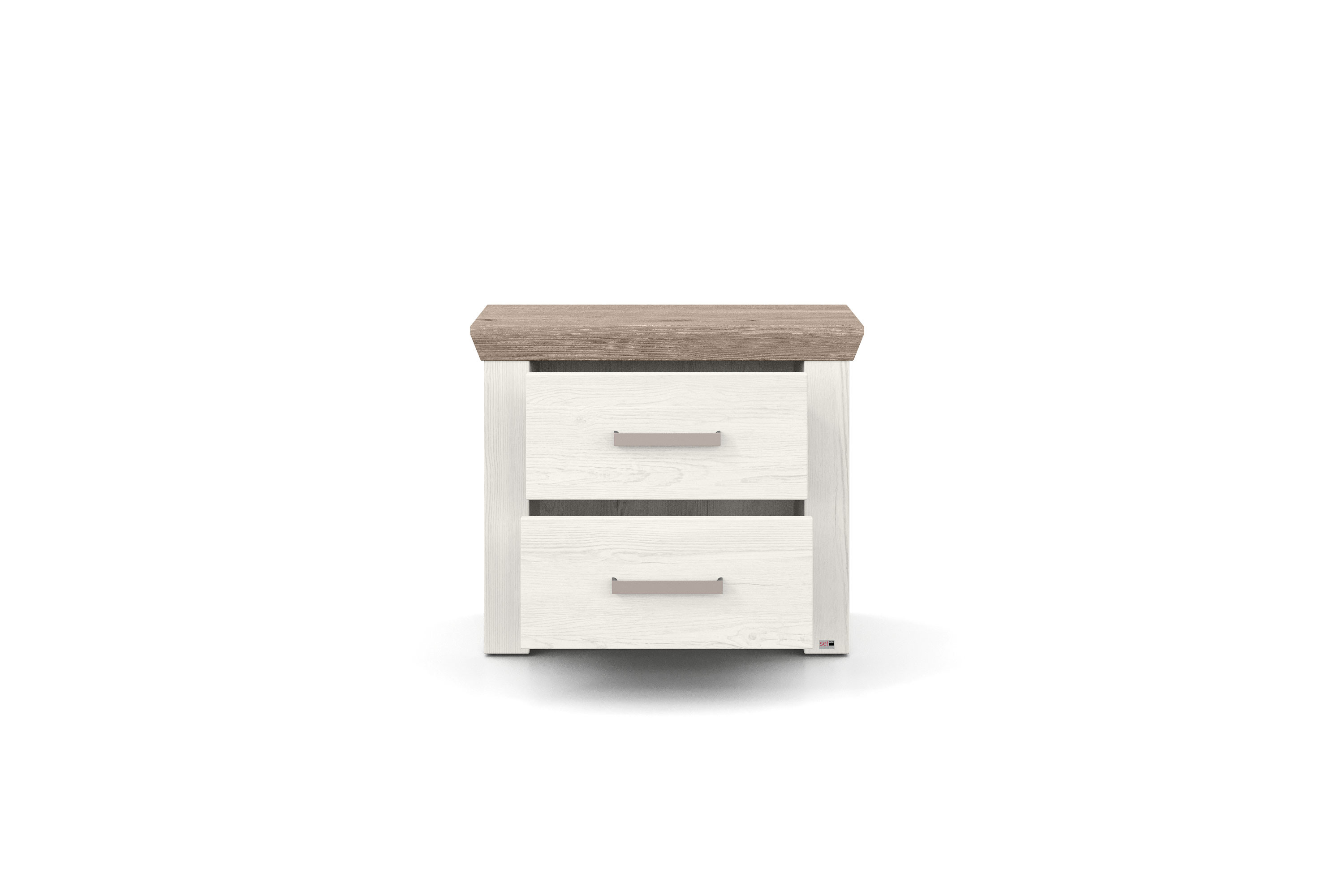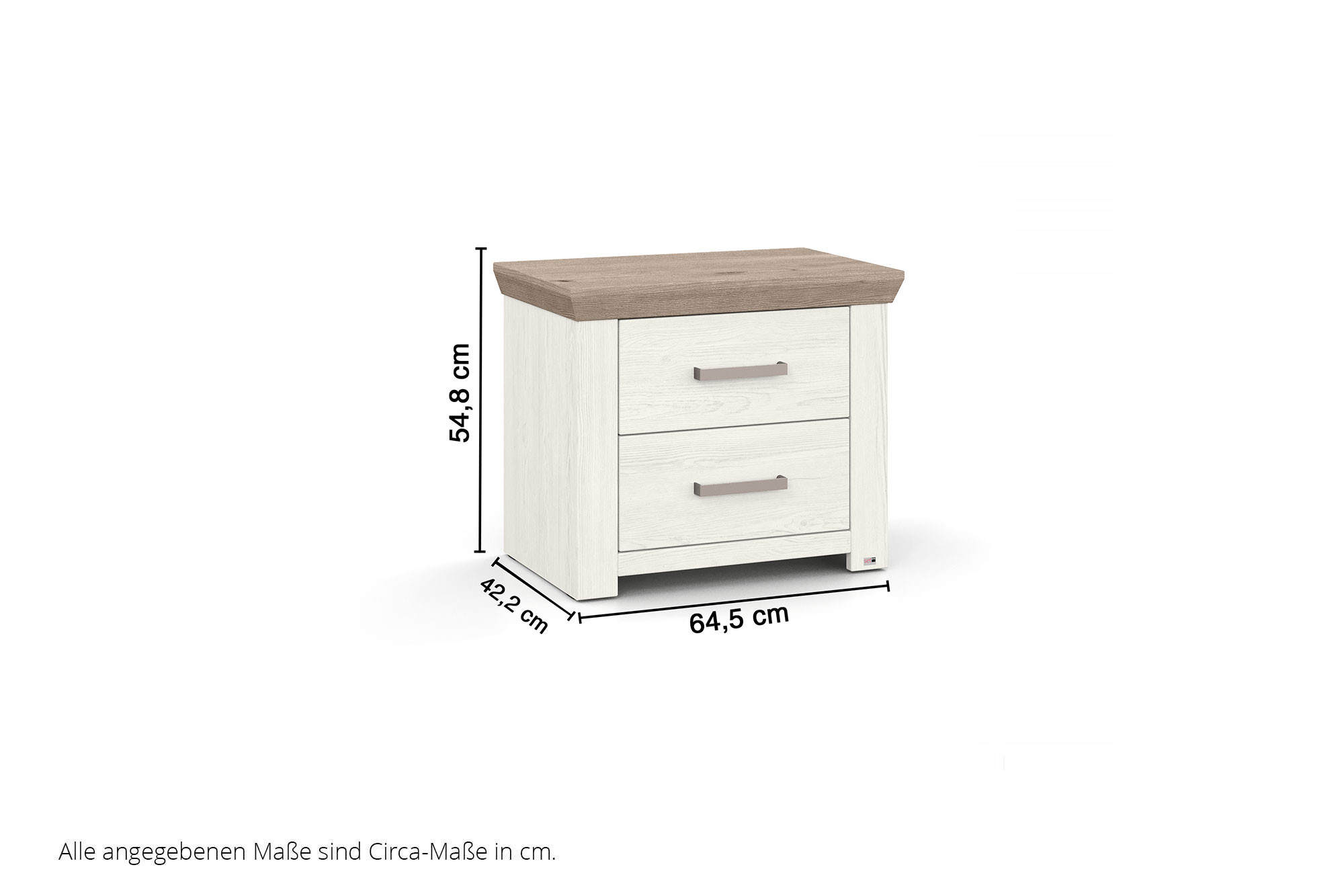 Das Schlafzimmer York aus der Kollektion set one by Musterring verkörpert zeitgemäßes, jugendliches Wohnen mit einer behaglichen, naturverbundenen Ausstrahlung. Die ansprechende Mischung aus der hellen Pino-Aurelio-Nachbildung und den schönen Akzenten in Eiche-Nelson-Nachbildung schafft eine freundliche und zugleich moderne Atmosphäre. Durch die geradlinige Gestaltung und die durchdachten Einzelheiten vereint York Wohngefühl und Designbewusstsein auf ideale Weise. Der Schrank mit vier Drehtüren, von denen zwei eine große Spiegelfläche besitzen, lässt den Raum optisch größer wirken und ist äußerst praktisch. Mit einer Innenentiefe von etwa 56 Zentimetern bietet er reichlich Platz, der dank zweier breiter Bereiche mit je einem Einlegeboden und einer Kleiderstange hervorragend organisiert ist. Die Schranktüren, die sich um 100 Grad öffnen lassen, und die stabilen Metallteile betonen die Wertigkeit und Haltbarkeit. Griffe aus Metall in mattem Nickel setzen moderne Blickpunkte und fügen sich nahtlos ins Gesamtbild ein. Die Schlafgelegenheit hat einen Bettrahmen in Pino-Aurelio wird durch auffällige Randleisten in Eiche-Nelson geschmackvoll hervorgehoben. Mit einer angenehmen Kopfhöhe von ungefähr 93 Zentimetern lädt es zum gemütlichen Zurücklehnen ein, während die abgestimmten Höhen von Fußteil und Bettseiten ein ruhiges, harmonisches Aussehen gewährleisten. Vervollständigt wird die Garnitur durch den zugehörigen Nachttisch, der zwei geräumige Schubladen besitzt. Diese gleiten auf Qualitätsmetallauszügen mit sanftem Schließmechanismus und sorgen für eine geräuschlose, angenehme Handhabung. Die Deckplatten in Eiche-Nelson-Nachbildung bilden einen stilvollen Kontrast und nehmen das Design der übrigen Möbelstücke geschickt wieder auf. Mithilfe unseres Konfigurators kann das set one by Musterring Schlafzimmer York persönlich gestaltet werden und wird somit zur idealen Wahl für ein modernes, junges Zuhause mit hohen Ansprüchen an Wertigkeit und Gestaltung.