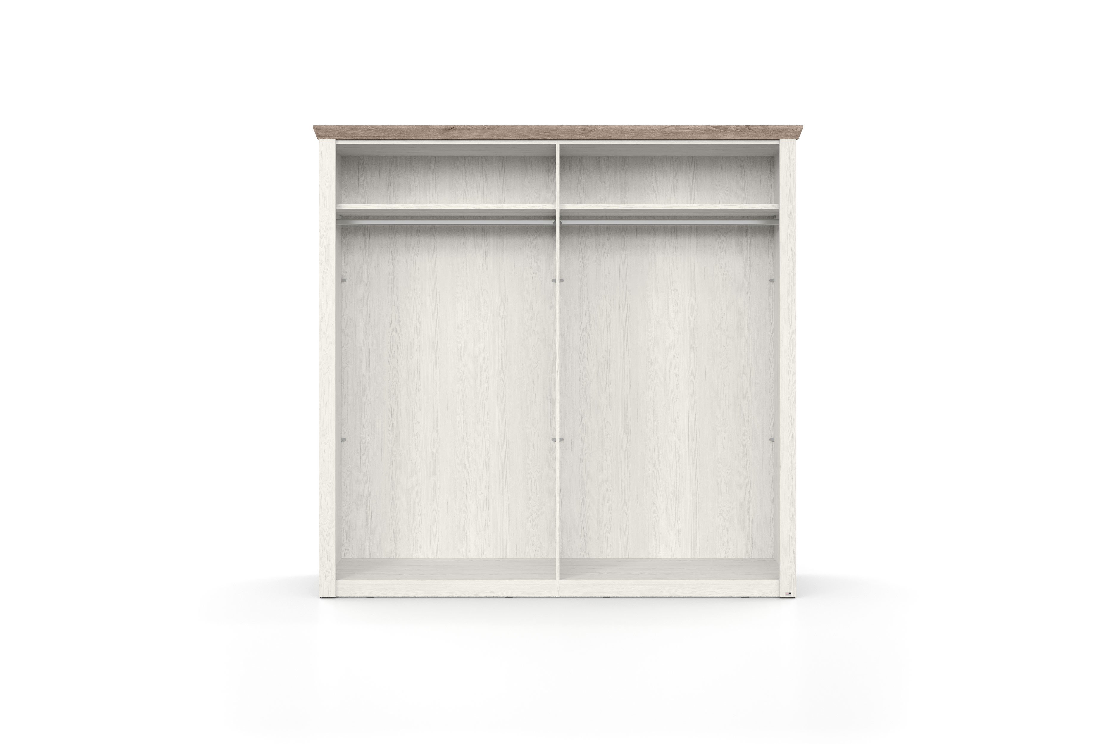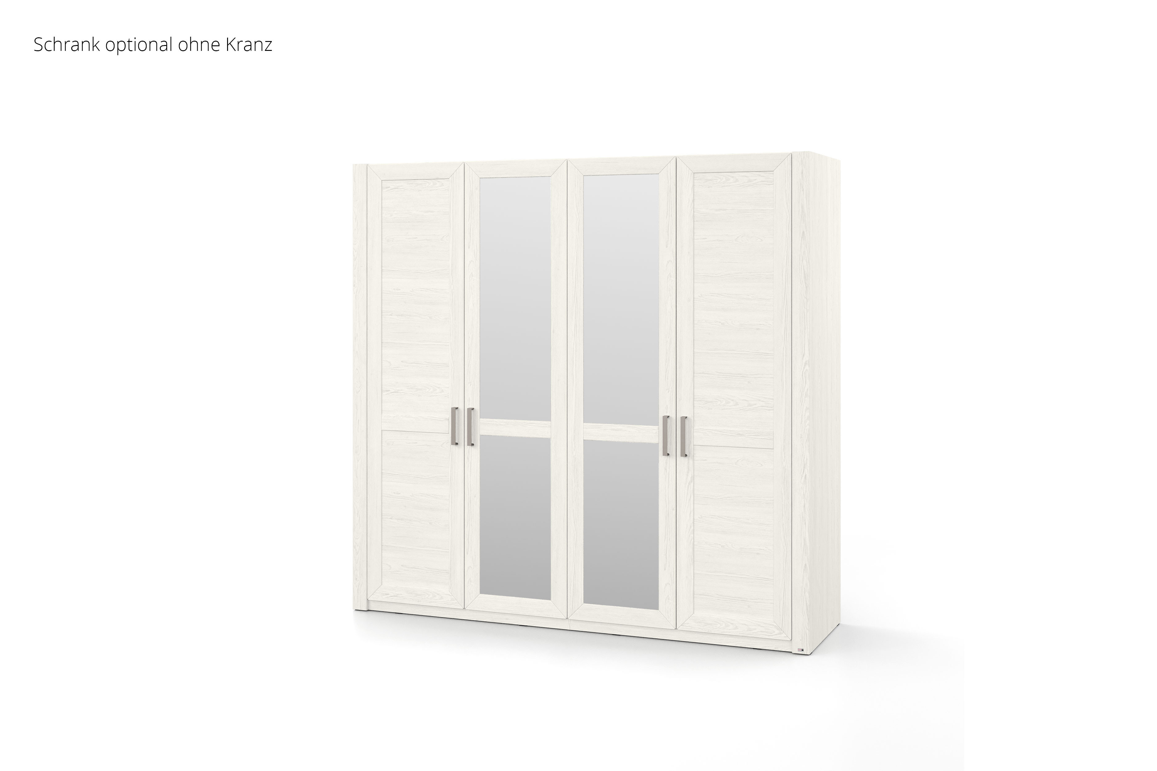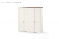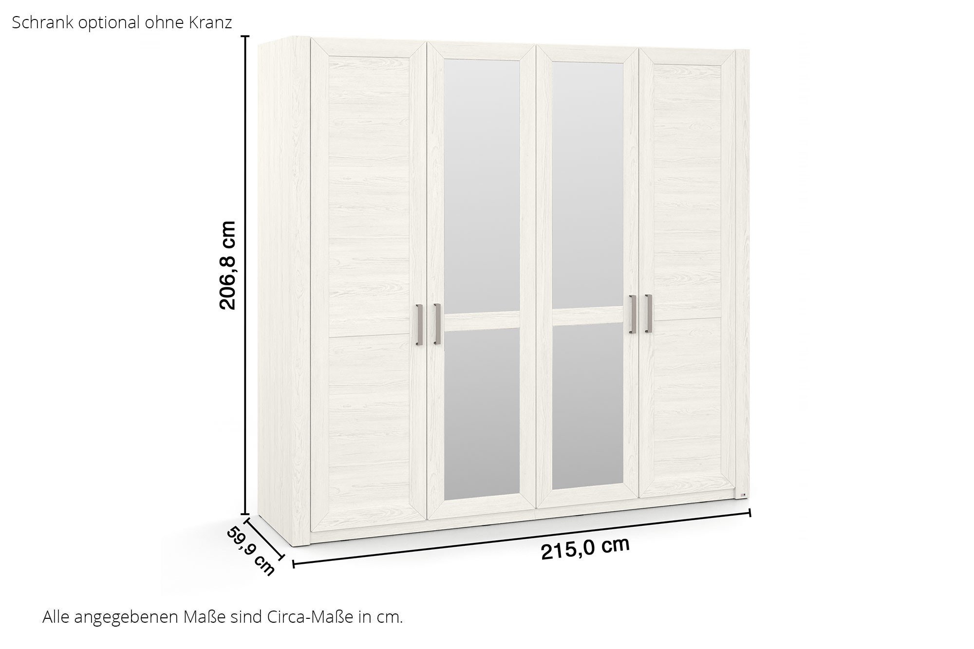 - Kleiderschrank: Drehtürenschrank 4-türig (davon 2 Spiegeltüren), Innentiefe ca. 56,2 cm, inklusive Kranz