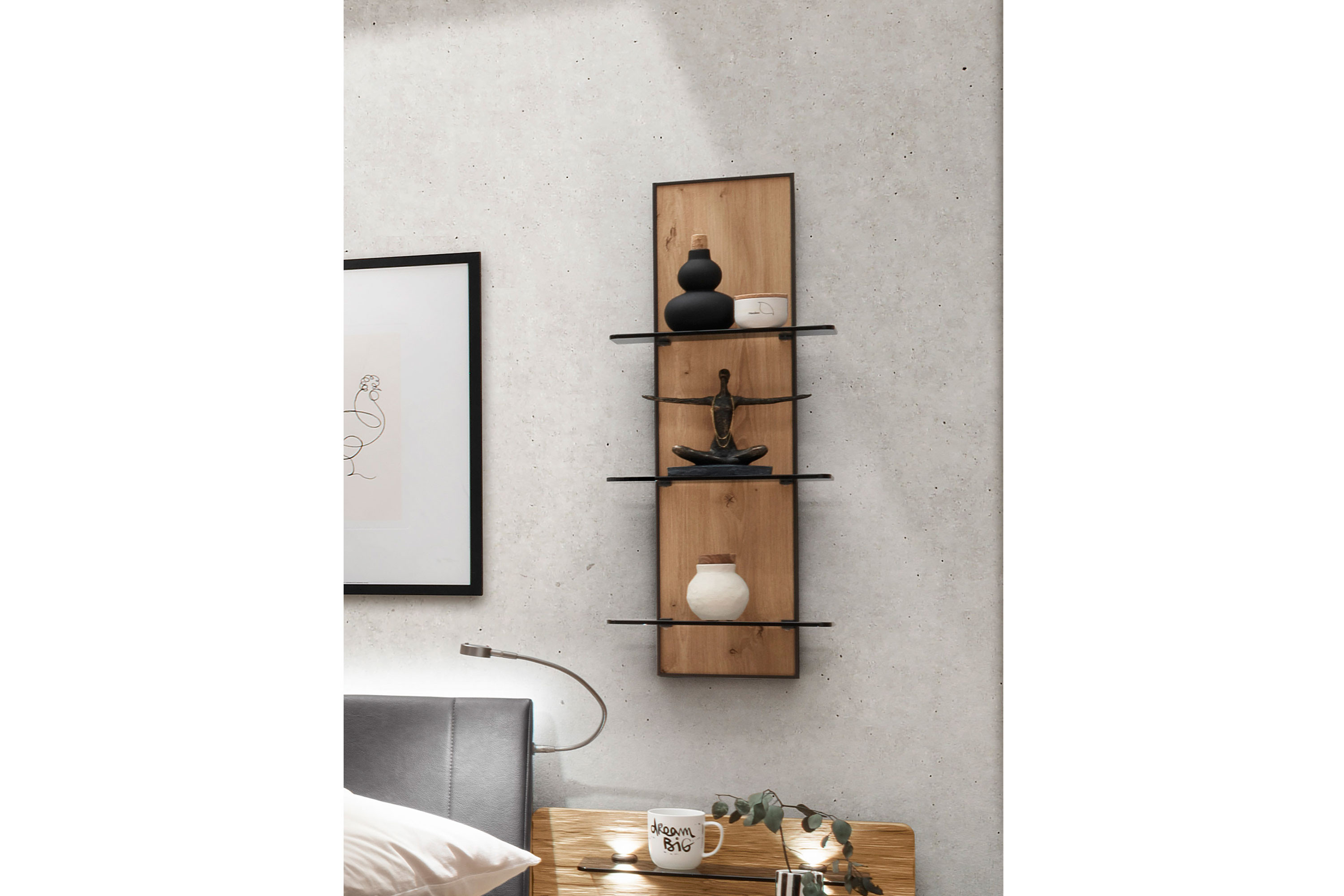 Das dekorative Hängeregal aus der umfangreichen Schlafzimmerserie Cadiz von Wiemann zeigt sich in einer leicht industriell angehauchten Ausführung. Drei je etwa 35 cm breite Rauchglasböden wurden an dem rund 90 cm hohen Paneel in der ansprechenden Bianco-Eiche-Nachbildung als Ablagemöglichkeit befestigt. Ein filigraner, dunkler Paneelrahmen unterstreicht stilsicher die naturgetreue, rustikale Optik. Besonders schön sieht das Wandregal im Wohnzimmerbereich oder auch in der Nähe einer Bettanlage aus. Im Cadiz Typenplan, der unter Downloads zur Ansicht bereitgestellt wurde, finden Sie alle modelleigenen Schlafzimmermöbel, falls Sie den kompletten Schlafbereich mit Elementen aus der Wiemann Kollektion neu einrichten möchten. Ihre individuelle Bestellung können Sie gern telefonisch oder über das Kontaktformular bei unseren kompetenten Möbelexperten in Auftrag geben.