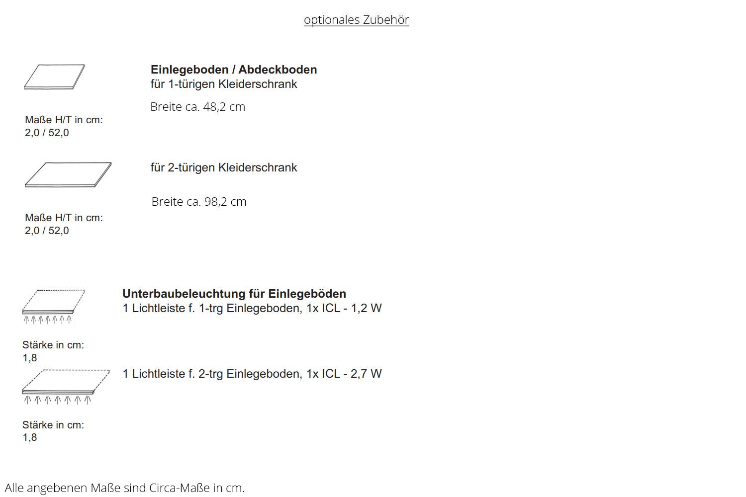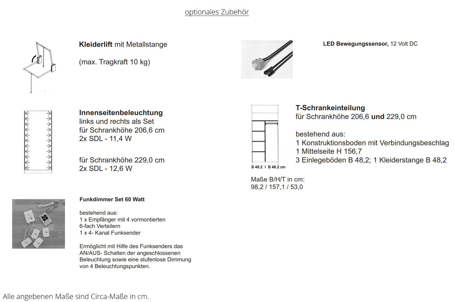 - Innenausstattung: 2 Elemente je ca. 100 cm breit & 1 Element ca. 50 cm, je Element 2 Fachböden & 1 Kleiderstange