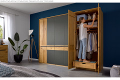 Auf das Wesentliche reduziert, überzeugt der Kleiderschrank InCasa Onema von Decker mit ruhiger Eleganz und modernem Stil. Edle Glastüren treffen auf massives Holz, wahlweise in der gezeigten Wildeiche oder auch in Kernbuche erhältlich. Ob Sie die Glasflächen lieber in Weiß, Eisengrau oder dem vorausgewählten Anthrazit gestalten möchten, bleibt ganz Ihnen überlassen und eröffnet vielfältige Möglichkeiten zur individuellen Gestaltung. Schlichte Griffausfräsungen, wahlweise in Schwarz oder Natur geölt, unterstreichen die klare Linienführung, vervollständigen das Design und runden das Gesamtbild stilvoll ab. Die sechs gedämpften Türen schließen drei großzügige Schrankelemente, die Ihnen mit jeweils zwei Einlegeböden und einer Kleiderstange bereits eine durchdachte und vielseitige Aufbewahrung Ihrer Kleidung ermöglichen. Möchten Sie den Drehtürenschrank noch detaillierter gliedern, stehen Ihnen praktische Zusatzoptionen zur Verfügung, mit denen Sie das Möbelstück ganz nach Ihren persönlichen Bedürfnissen erweitern und anpassen können. InCasa Onema von Decker - ermöglicht Ihnen ein stimmiges und geruhsames Schlafzimmer, das Sie ganz nach Ihrem Geschmack gestalten können.