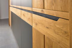 - Front (außer Glastüren): Wildeiche massiv, naturbelassen geölt