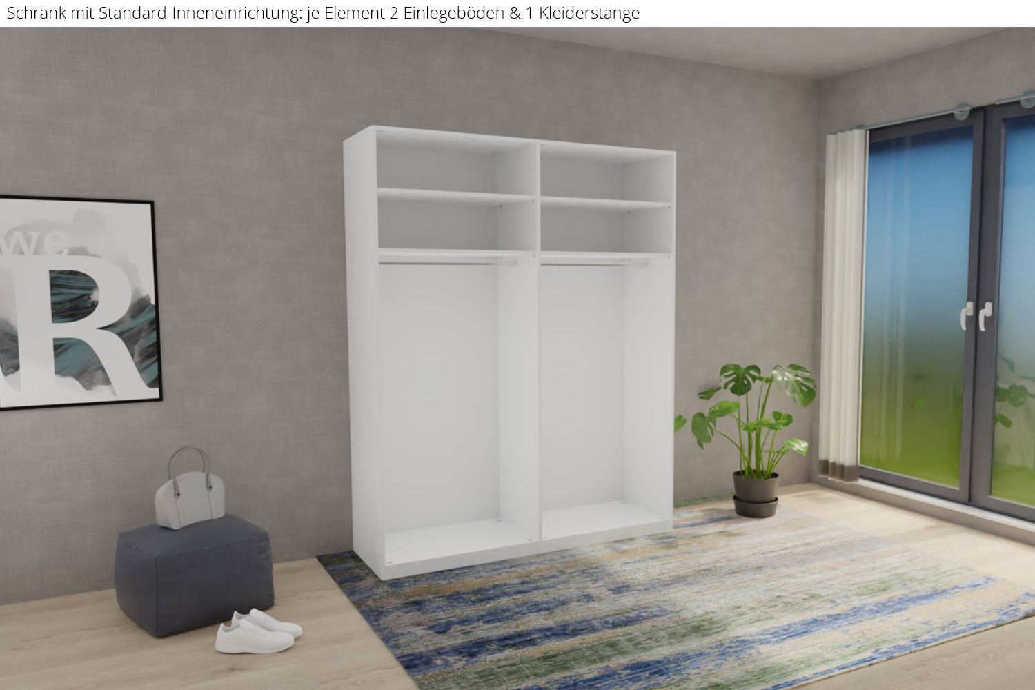 - Innenausstattung: 2 Böden, 1 Kleiderstange je Element