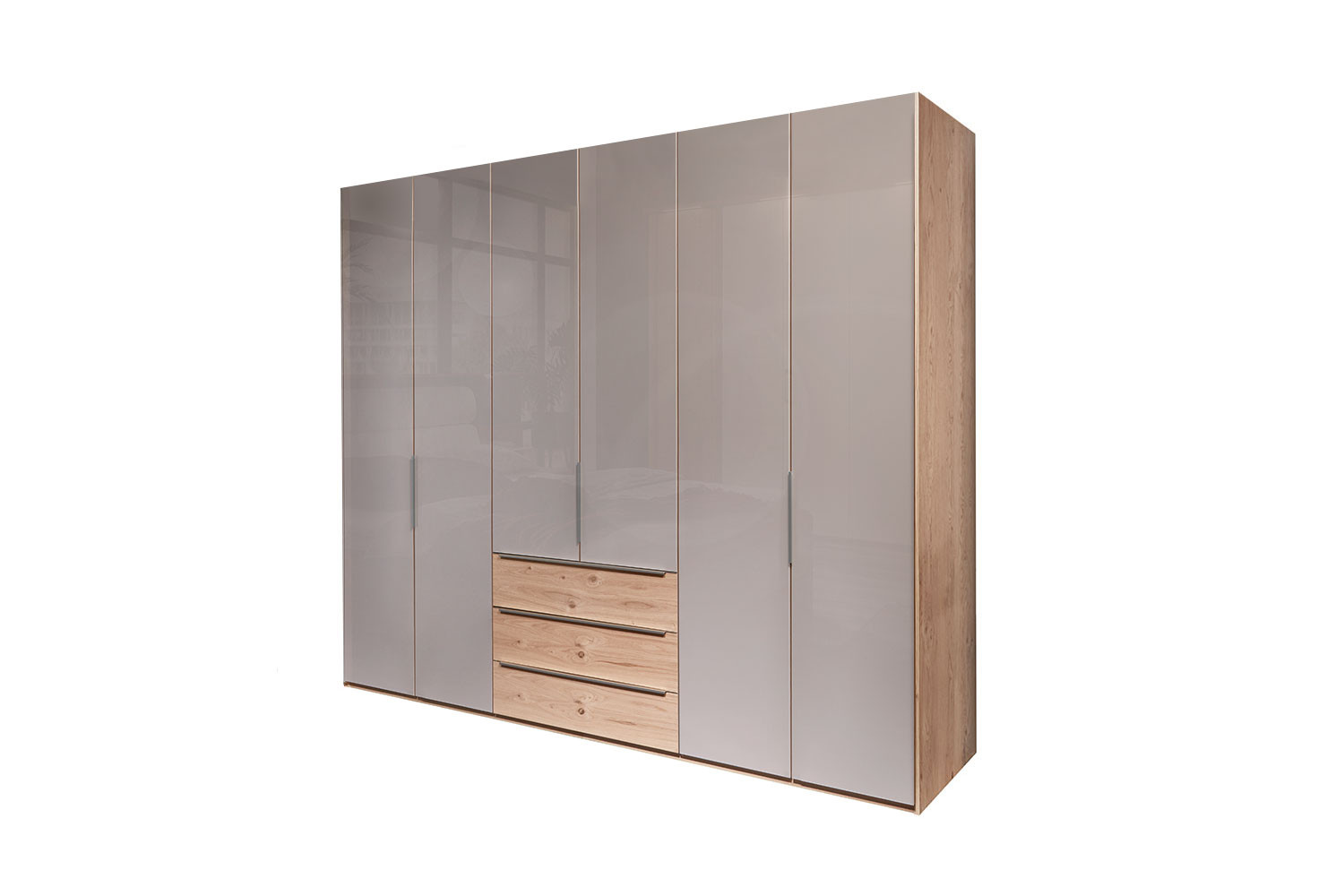 Der Kleiderschrank mit drei mittigen Schubladen von Disselkamp zeichnet sich durch Funktionalität, Eleganz und besonderen Stil aus und kann somit als idealer Begleiter im Schlafzimmer dienen. Als Bestandteil der Serie Glassystem verfügt er selbstverständlich über eine charakteristische Glasfront, die hier in Taupe gestaltet ist. Ein in Balkeneiche-Furnier gekleideter Korpus komplettiert den Look. Lange Griffleisten sorgen an den drei gedämpften Frontschubkästen mit Selbsteinzug für einen komfortablen Zugang, während drei der sechs gedämpften Drehtüren mit Winkelgriffen ausgestattet sind. Der Schrank ist in drei Abteile gegliedert, wobei sich in jedem Element jeweils zwei Fachböden sowie eine Kleiderstange befinden. Unsere Zusatzoptionen ermöglichen es Ihnen, neben der Farbkonfiguration auch die Innenausstattung noch detaillierter zu strukturieren. Glassystem von Disselkamp – für Möbel mit dem gewissen Etwas.