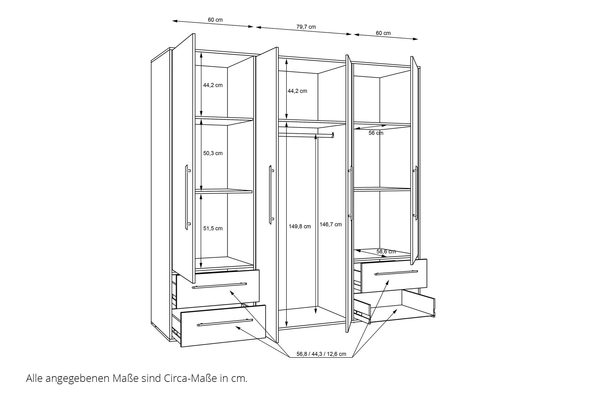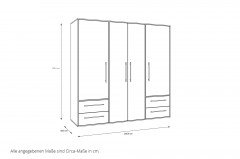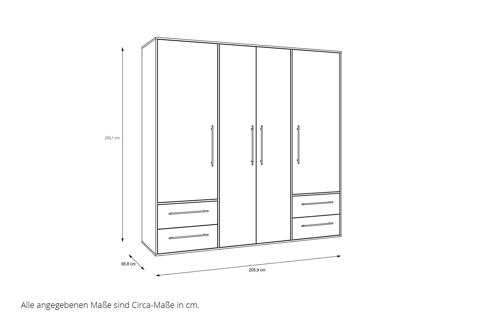 - Schrank: 4 Drehtüren, 4 Schubladen