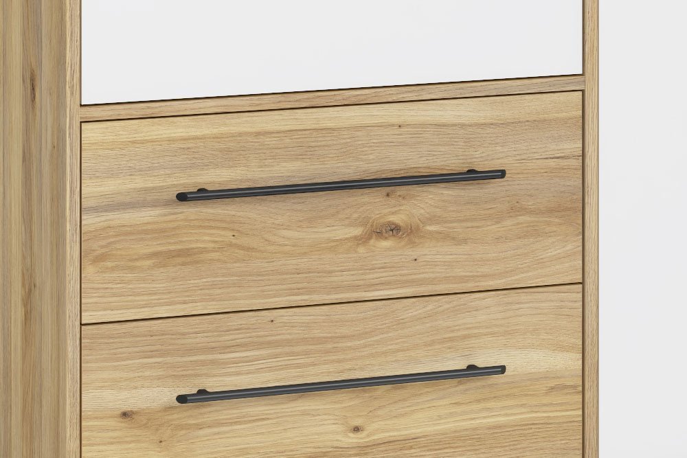Der Forte Kleiderschrank aus dem Möbel-Programm Mokkaris stellt sich hier mit einer ansprechenden Mauvella Eiche Nachbildung vor, die sich sowohl über den Korpus als auch über die vier Schubladen-Fronten zieht. Die vier Drehtüren schmücken sich mit einem frischen Weiß. Die Türen und auch die Schubladen sind mit dekorativen, schwarzen Metall-Stangengriffen versehen. Durch die Kombination der verschiedenen kontrastreichen Oberflächen entsteht ein modernes Gesamtbild. Neben der Optik überzeugt auch die Aufteilung des zeitlosen Ordnungshüters. Unter den Außentüren, hinter denen sich die Wäschefächer verbergen, wurden jeweils zwei praktische Schubladen in den Schrank-Korpus integriert. Das Mitteltüren-Paar beinhaltet das etwa 80 cm Kleiderfach mit einem Boden und einer Kleiderstange. Dieses Programm beinhaltet weitere Schränke in unterschiedlichen Größen und Ausführungen, sodass Sie hier sicher den Mokkaris-Schrank von Forte finden, der am besten zu Ihnen passt.