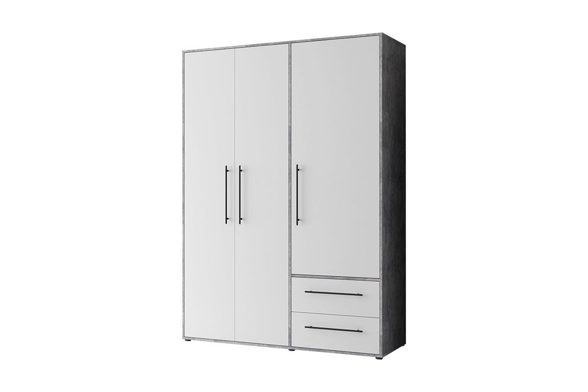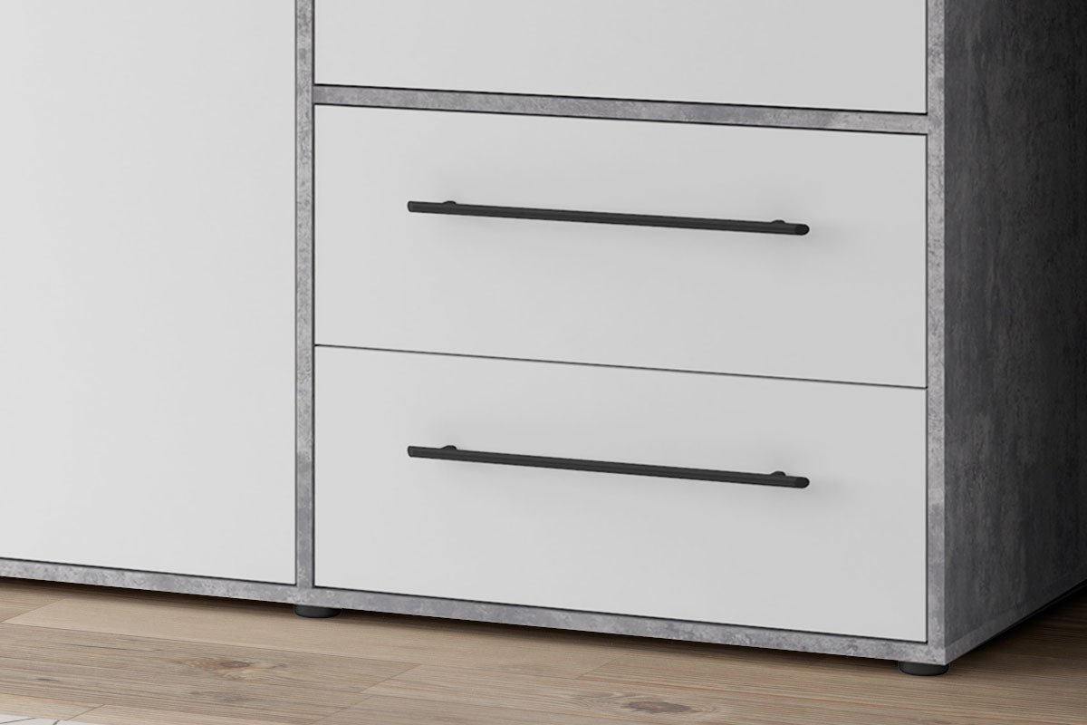 Der Forte Kleiderschrank Mokkaris bietet nicht nur ausreichend Stauraum für Ihre Kleidung, sondern überzeugt auch durch sein modernes Design. Der Korpus in Beton Nachbildung harmoniert perfekt mit den Fronten in strahlendem Weiß. Hinter den drei Türen des Schrankes verbirgt sich ein clever durchdachtes Innenleben: Ein großzügiges Kleiderfach sowie ein praktisches Wäschefach bieten ausreichend Platz zur ordentlichen Aufbewahrung Ihrer Kleidung und anderer Textilien. Zwei geräumige Schubladen, in denen beispielsweise Accessoires untergebracht werden können, sorgen für zusätzlichen Stauraum und komplettieren das durchdachte Design des Ordnungshüters. Bestellen Sie den Forte Kombischrank Mokkaris direkt online und erfreuen Sie sich an diesem praktischen Möbelstück, das sich aufgrund seiner Größe nicht nur für Schlafzimmer, sondern auch für Jugend- und Gästezimmer eignet.
