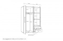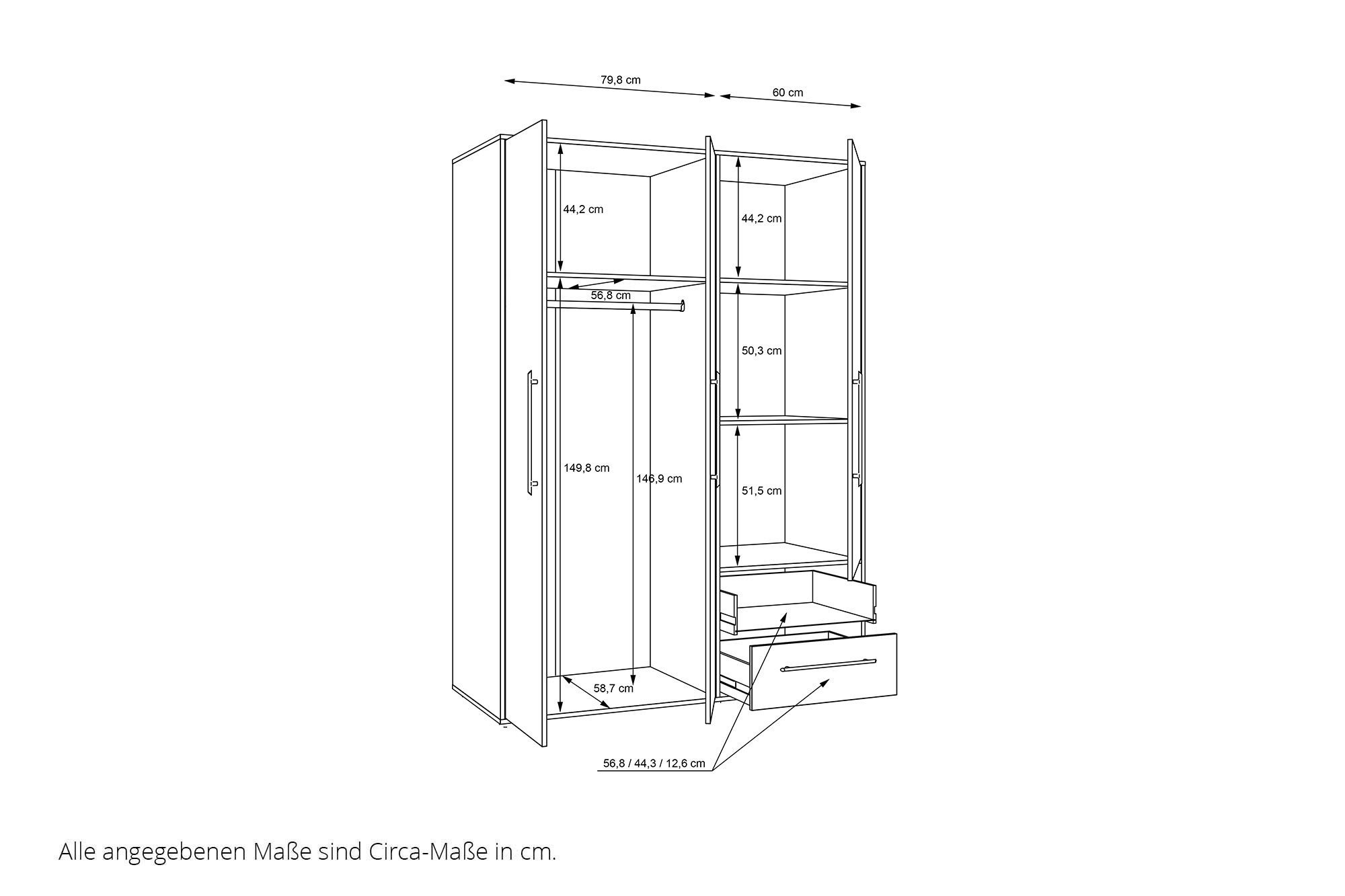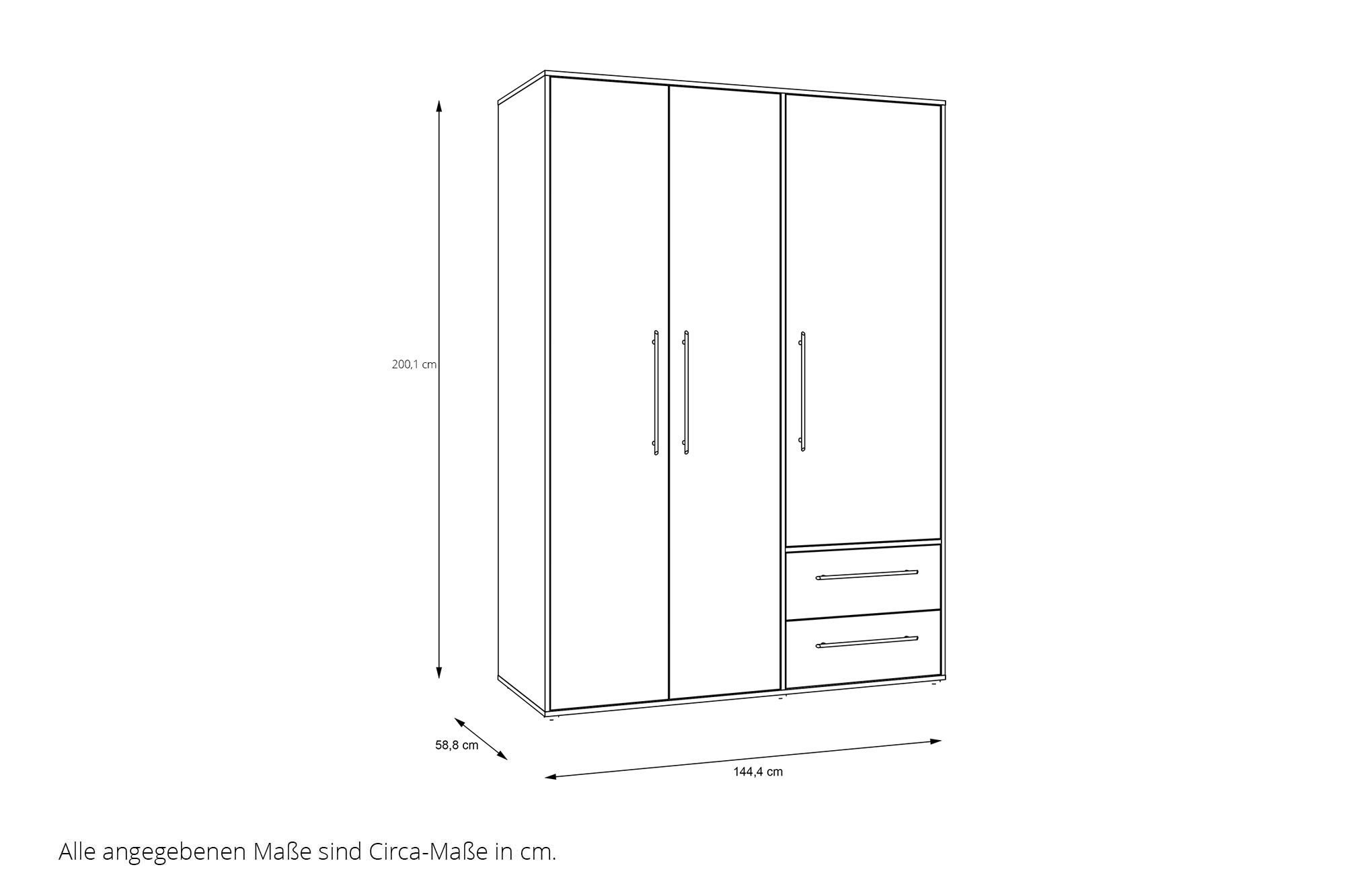 - Schrank: 3 Drehtüren, 2 Schubladen