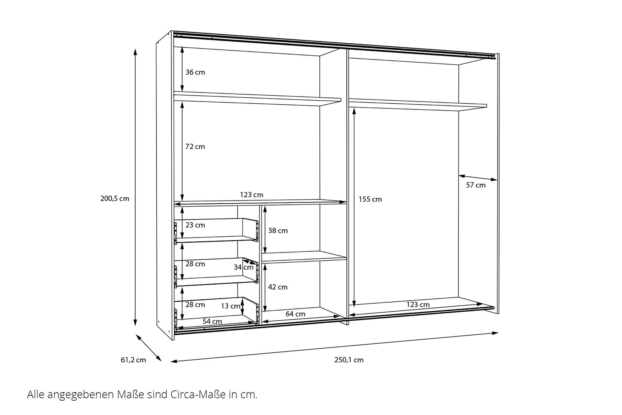 links: 1 x Kleiderstange ca. 123 cm breit, 1 x Boden ca. 64 cm breit, 3 Schubladen je ca. 54 cm breit,