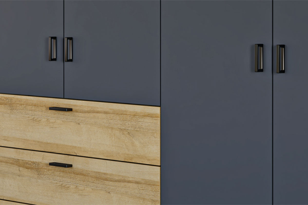 Drehtüren-Kleiderschrank von JUTZLER - Modell Longline - mit 6 Türen anthrazit matt und 3 Schubkästen Eiche Nachbildung Form & Funktion - Schränke sind mehr als nur Stauraum