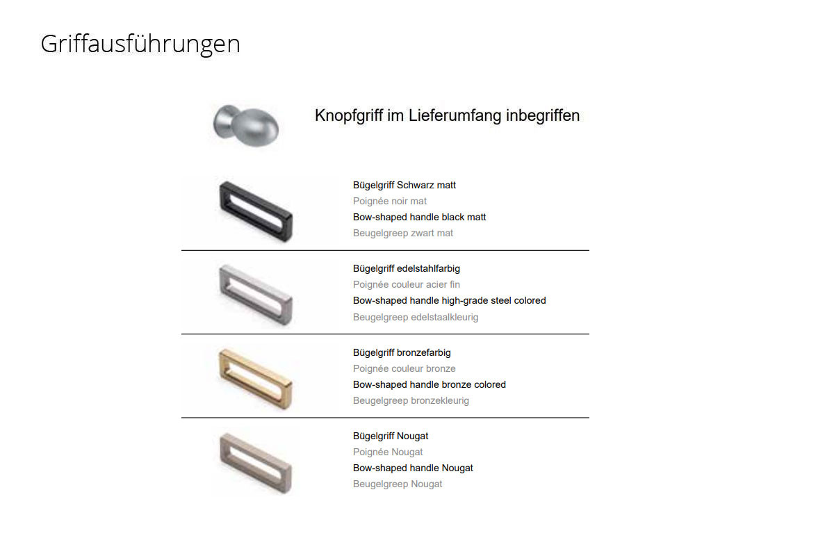 - Griffausführung: Bügelgriffe, schwarz matt, Länge je ca. 10 cm, Standard-Knopfgriff im Lieferumfang inbegriffen