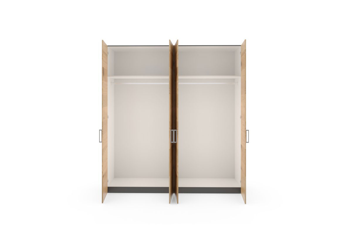 Der JUTZLER Longline ist ein stilvoller und geräumiger Kleiderschrank, der hier in unserem Shop online erworben werden kann. Mit seinen vier Türen, die mit einem edlen Wildeichenfurnier in Paneel-Optik versehen sind, und einem Korpus in elegantem Schwarz sorgt er für eine moderne Atmosphäre in Ihrem Schlafzimmer. Durch diese geschickte Oberflächen-Kombination entsteht ein ansprechender Kontrast, der dem Kleiderschrank eine zeitlos schöne und natürliche Note verleiht. Die matten Bügelgriffe sind titanfarben und setzen einen stilvollen Akzent auf den furnierten, leise schließenden Türen. Diese dekorativen Griffe bieten nicht nur eine praktische Möglichkeit zum Öffnen und Schließen der Türen, sondern unterstreichen auch das moderne Design des Schranks. Dank seiner intelligenten Innenraum-Aufteilung, die aus zwei breiten Einlegeböden und zwei langen Kleiderstangen besteht, finden Sie immer schnell und einfach, was Sie suchen. Mit dem JUTZLER Kleiderschrank Longline können Sie Ihren Kleidungsstücken ein stilvolles Zuhause geben, Ihre Räume aufwerten und gleichzeitig von viel Stauraum profitieren. Bestellen Sie diesen Drehtürenschrank jetzt ganz einfach online und lassen Sie sich von seiner Qualität und seinem Design begeistern.