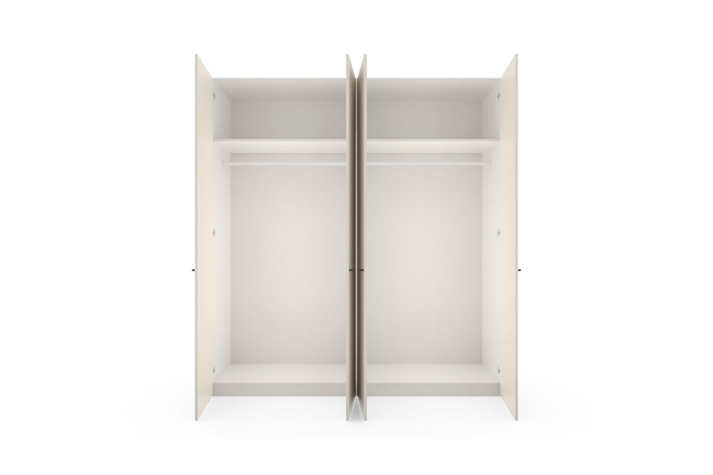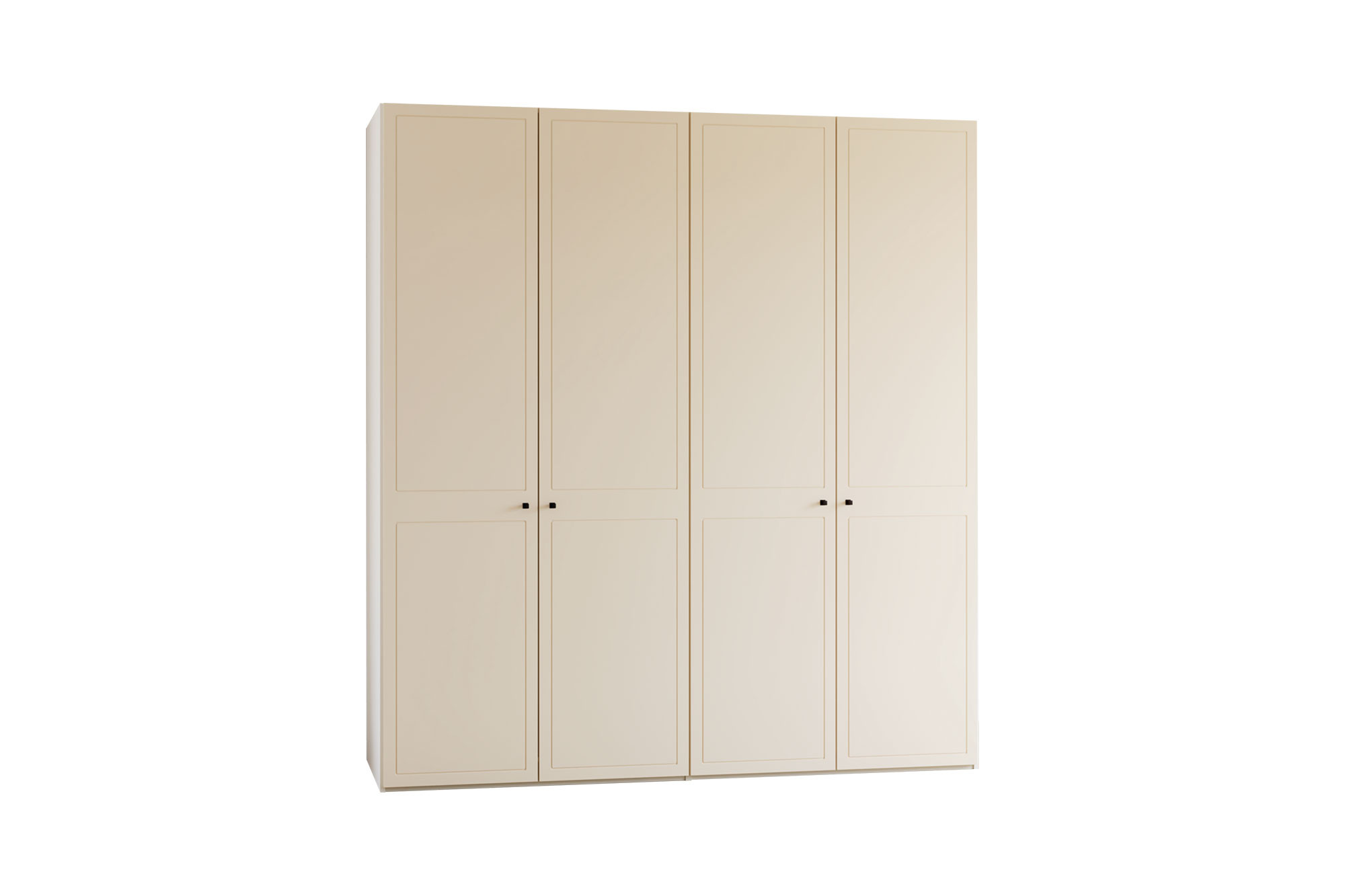 Die JUTZLER-Schränke definieren sich über verschiedene unterschiedliche Kollektionen, die sich in Höhe, Ausführungen und Tür-Art unterscheiden. Unser hier vorgestellter Kleiderschrank ist Teil der Longline-Kollektion, die ca. 220 cm hohe und individuell konfigurierbare Drehtürenschränke enthält. Unser schnell lieferbares Angebot beinhaltet den etwa 200 cm breiten Schrank mit einem cremeweißen Korpus, einer 4-türigen, matt lackierten Front namens «Chalet kaschmir» und mattschwarzen eckigen Knopfgriffen. Durch die farblich zurückhaltende Optik und die dekorativ gestalteten Türblätter entsteht ein landhaus-typischer Look, der hier modern interpretiert wurde. Alle Türen verfügen bereits über ein Dämpfungssystem, sodass sie leise schließen. Der Innenraum teilt sich in zwei Elemente auf, wobei jedes mit einem verstellbaren Boden und einer Metall-Kleiderstange ausgestattet ist. Entscheiden Sie sich für den ansprechenden Longline-Kleiderschrank von JUTZLER, dem namhaften Schweizer Traditionsunternehmen.